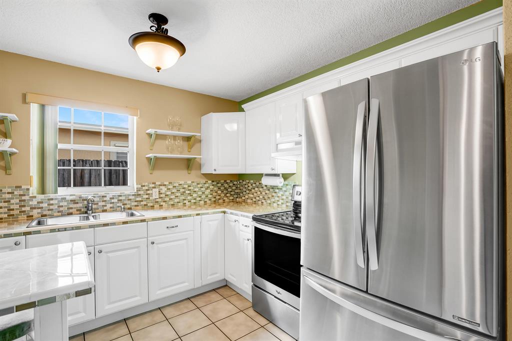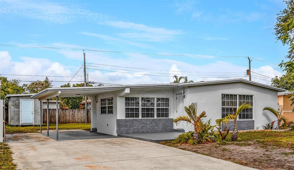 Excellent condition 2/1 plus den with remodeled kitchen and bath. CBS construction & Roof replaced May 2021! Bright home with lots of windows, tiled living areas except carpet in the living room, tankless water heater and walk in closet in master bedroom. Kitchen has white cabinets, tiled countertops, newer LG Refrigerator and Whirlpool electric stove. Quaint breakfast bar for morning coffee. There is an inside laundry room with a gas dryer heated by a propane tank. Exterior grounds include a covered carport, extra parking pad, shed for tools, patio and a fully fenced yard for privacy and safety. Panel shutters for storm control and no HOA fees or restrictions. Great rental potential and central WPB location with short drive to shopping, restaurants, turnpike & 95, airport and park nearby