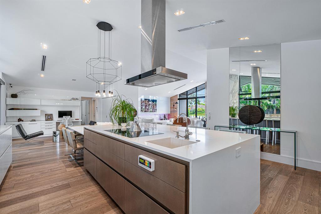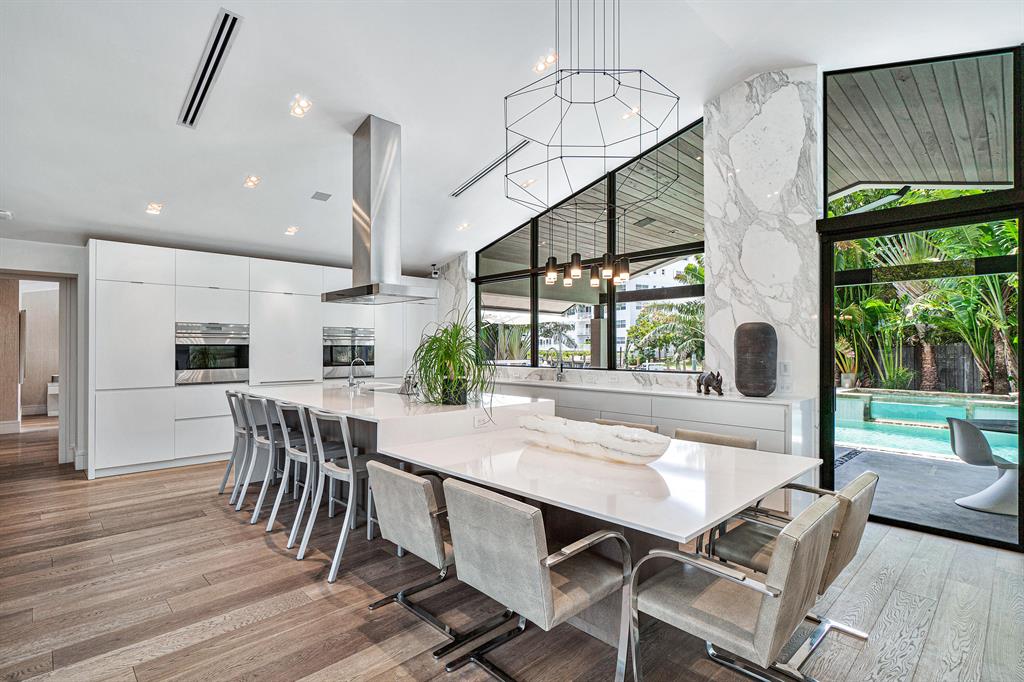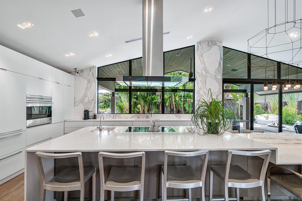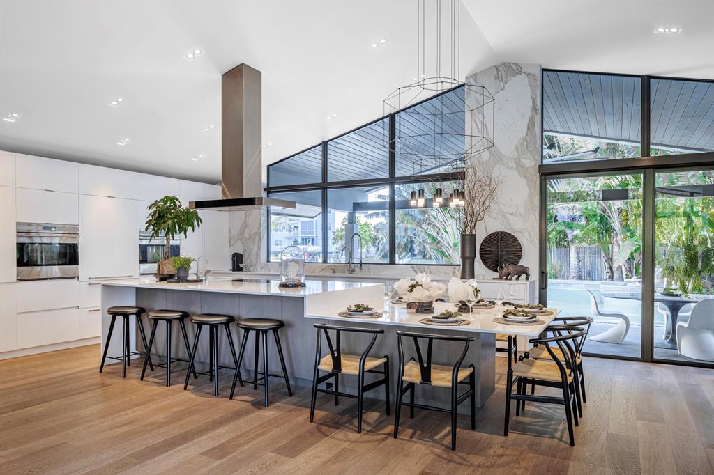 This furnished well-appointed modern waterfront home exudes a neutral pallet of dramatic materials. The award-winning design team completely reimagined this home in 2012 and created a clever use of space throughout. The strategically placed kitchen with a 15-foot island serves as the focal point of this multifunctional property. Featuring Calcutta Gold walls, Sub-Zero, Wolf, Bosch, and dual integrated sinks are just a few highlights of the clean-lined kitchen. The flow of the strategically designed open concept provides conversation areas, workspace, and an impactful great room that showcases a Linear Biofuel Fireplace. Leading through the stackable impact glass sliders to the outdoors you will find a tropical harmonious retreat for the water enthusiasts. The loggia offers immense covered