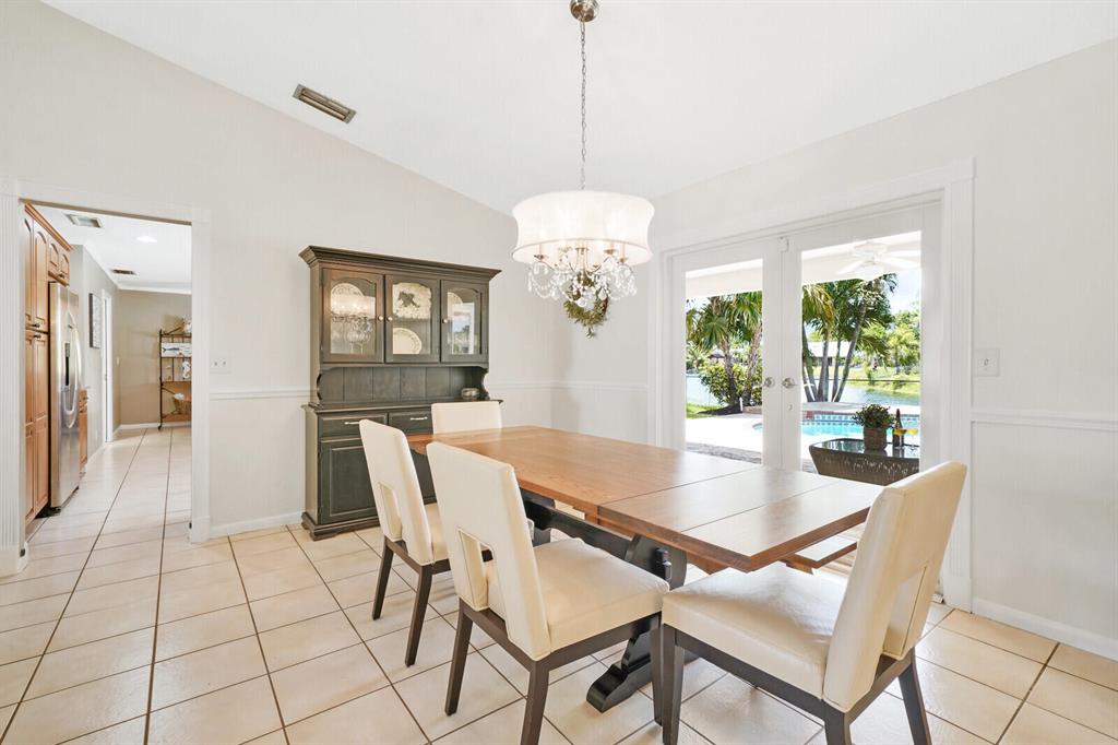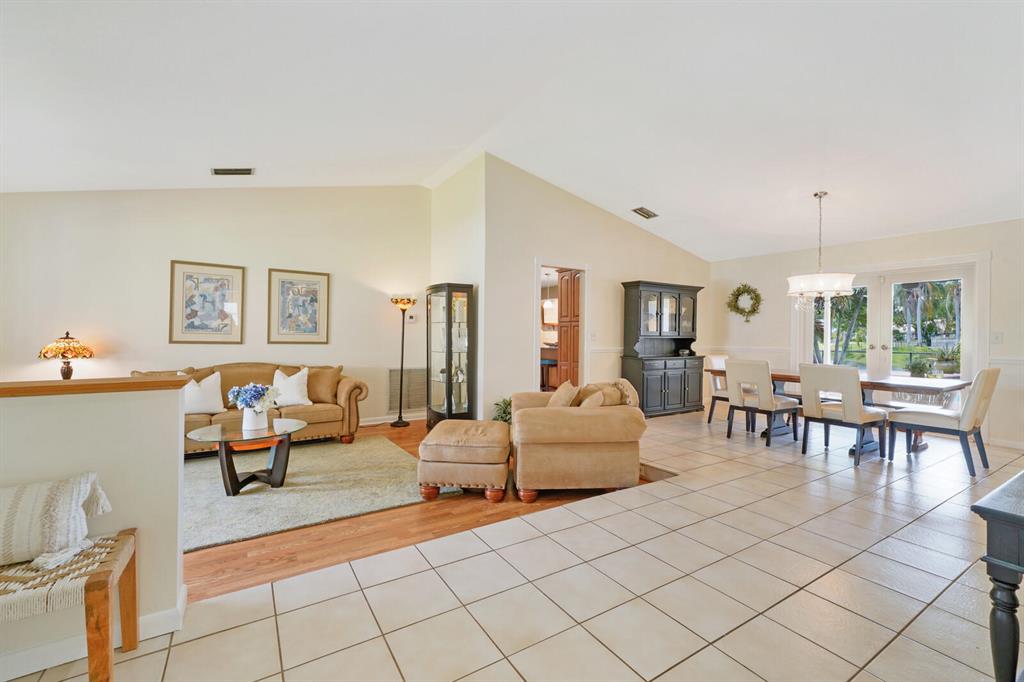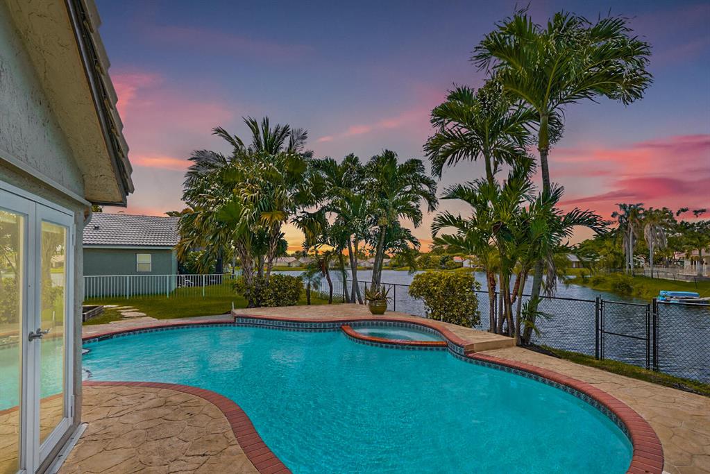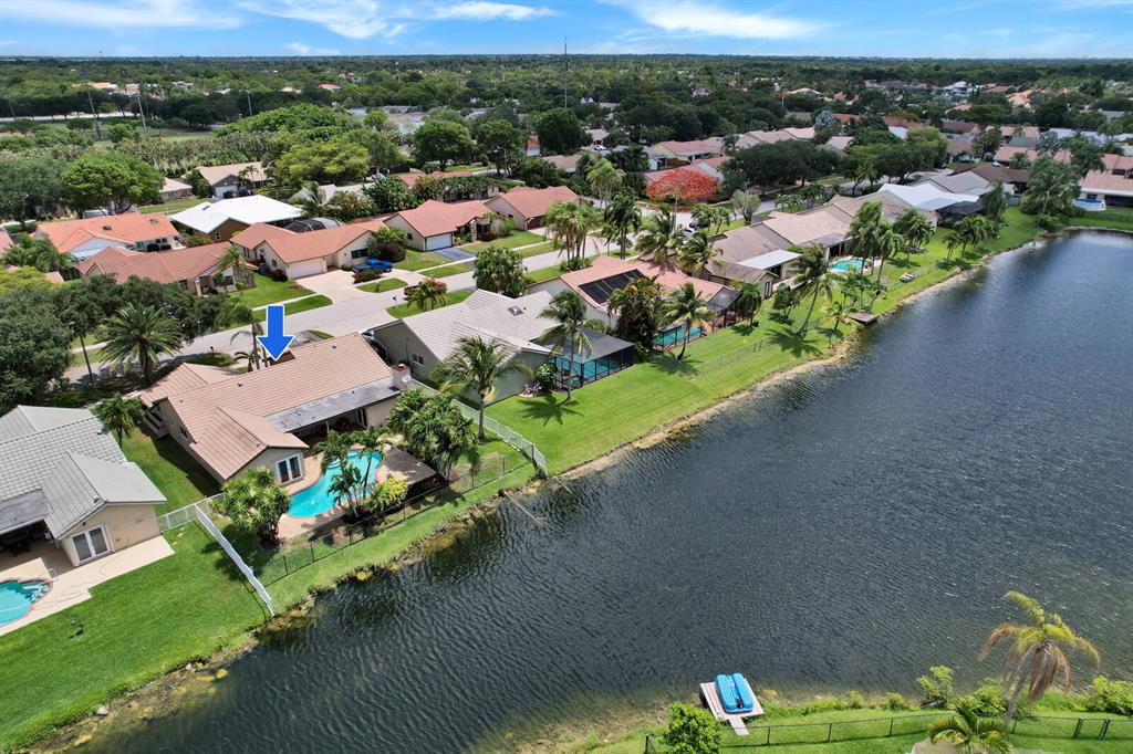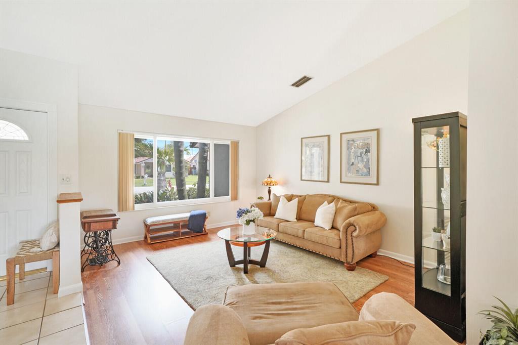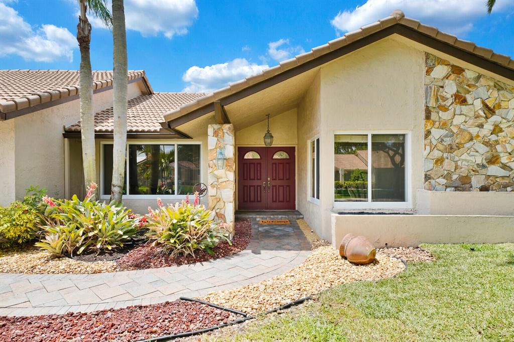 Do you desire and covet a spacious home with magnificent lake views and an entertainer's backyard? Supremely located in a highly sought-after community, this 3BR/2BA, 2,466sqft property provides a tranquil atmosphere of sheer natural beauty and daily comfort. Nestled on a tropically landscaped 8,625sqft lot, the Mediterranean inspired home magnetizes attention with exterior stonework, freshly and richly painted double crimson front doors, and contemporary architectural elements including newer impact windows. Step inside the gorgeous one-story abode to find soaring cathedral ceilings, an openly flowing floorplan, faux wood ceramic tile flooring, crown molding, a flood of scintillating natural light, and an enormous living room and dining area.