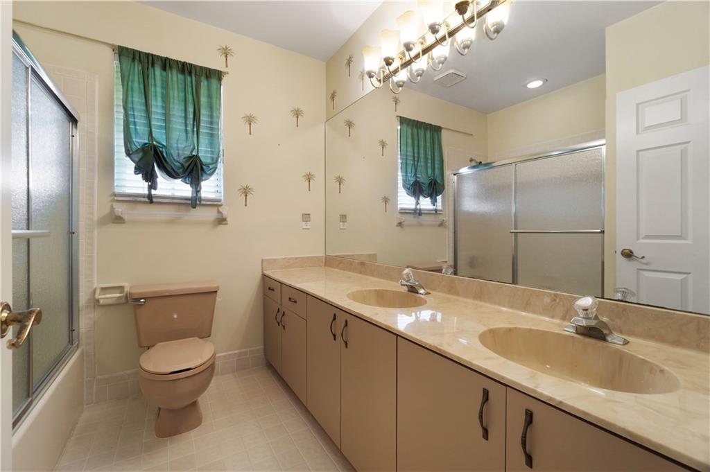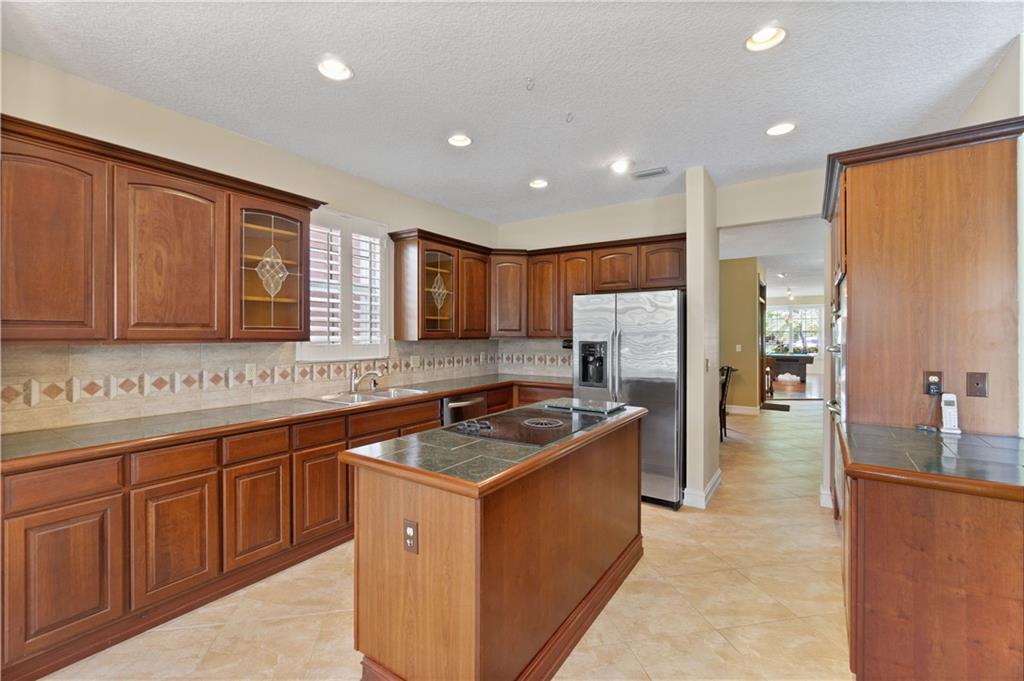 Fabulous floor plan with over 3000 square feet of living area. Master plus large bedroom/bath downstairs and two bedrooms upstairs with full bath and loft area. Updated kitchen features wood cabinets with tumbled marble backsplash, tiled countertops and stainless steel appliances. Breakfast room with bay window overlooks pool and waterway. Huge family room with floor to ceiling coral rock fireplace and high volume ceiling. Lots of closets with built-ins, Plantation shutters and huge laundry room. 37' x 15' screened pool with large covered area. South facing backyard on wide waterway. Accordion hurricane shutters and 3 car garage. 24-hour manned guard gates, community tennis & play ground. Walk to shopping.