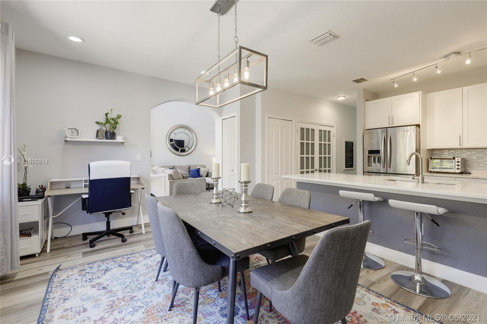 Beautiful 2-story corner unit with oversized back yard. Kitchen was recently remodeled, new laminate waterproof flooring on the first floor. Bathrooms have new vanities, toilets, mirrors, and light fixtures. Accordion shutters throughout. 24:7 security and guard gate. Amenities include a pool, clubhouse/community room, tennis courts, basketball court, gym, and plenty of bike and jogging paths. Garage was partially converted to a gym and sound booth.