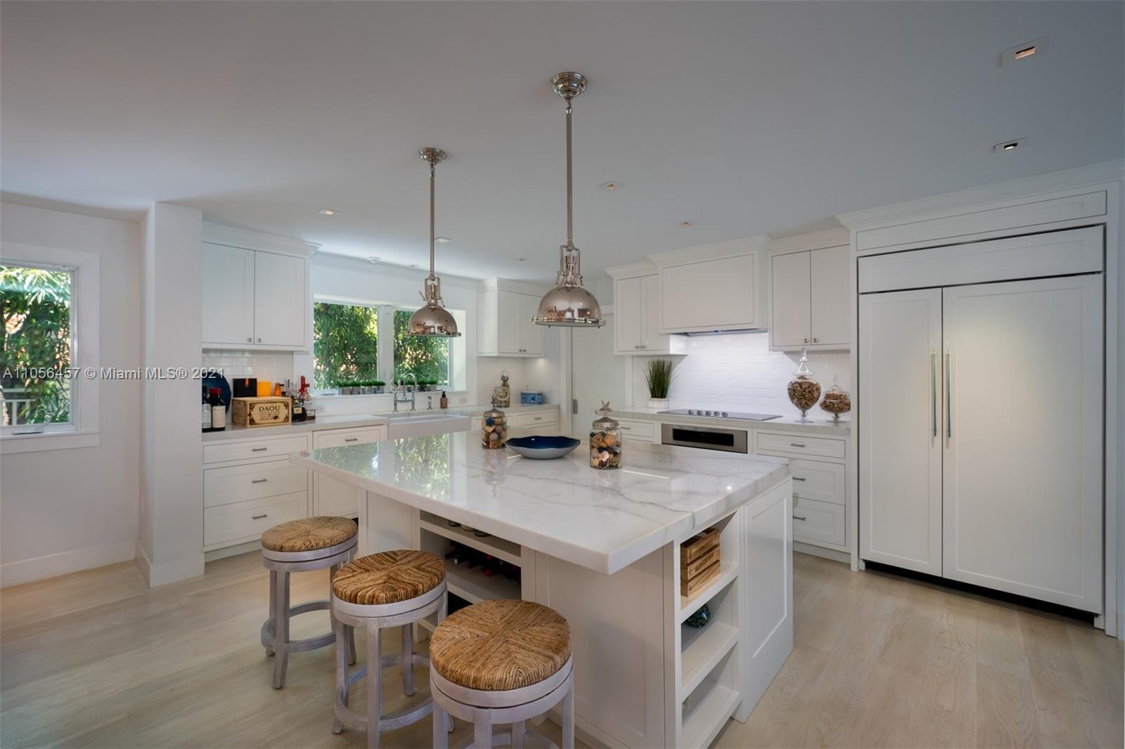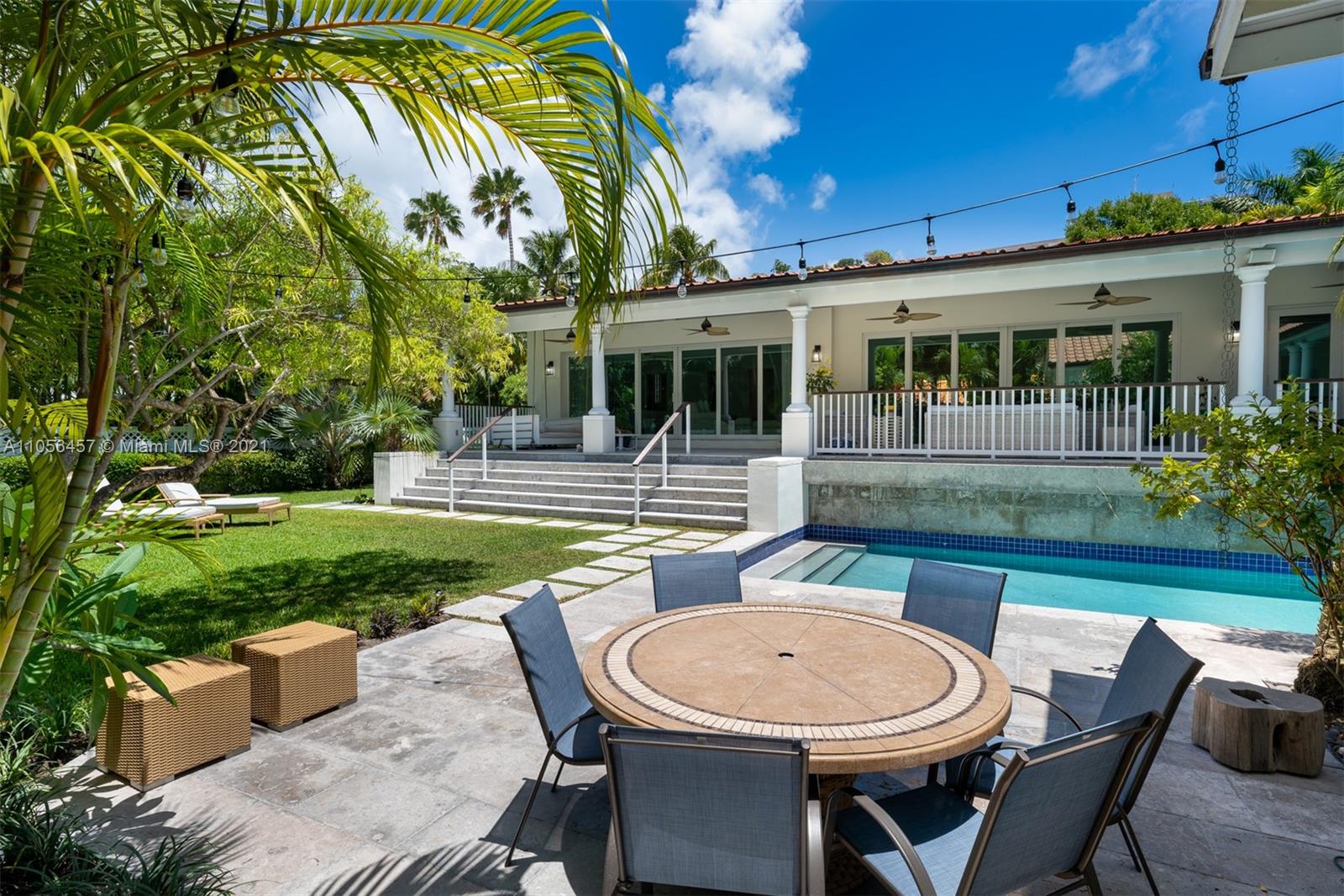 welcome to your Key Biscayne Beach House, located 3 blocks from the beach. Impeccable condition, designed by Village Architects. Located in the Holiday Colony area, the closest neighborhood for single homes to access the beach .One story home. Secluded and private, behind the double blue door an oasis of serenity will welcome you. Covered porch that gives more space to the living room area,direct access to pool and garden area. Oversized master suite with sliding doors opening to the terrace. Large family room , dining , kitchen with high ceilings . Surround system throughout the home. Built at 10 ft above flood ( see attachment for certificate of elevation). Impact glass doors / windows (expect one small window in laundry area). THE PERFECT HOME