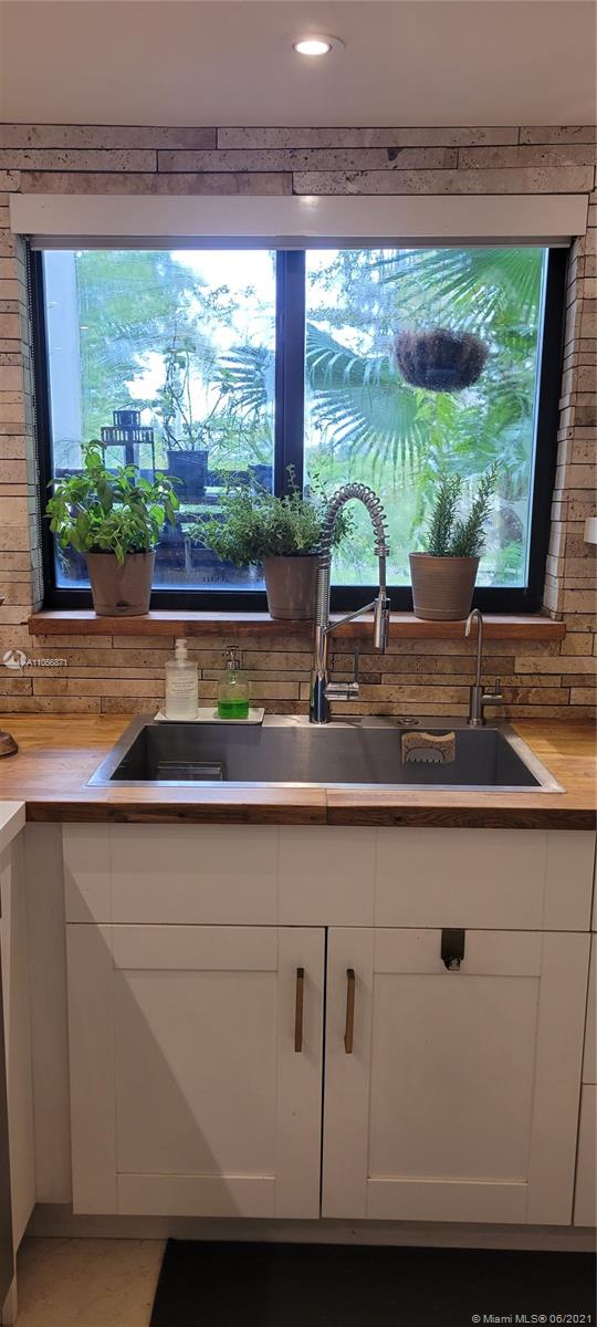 2/2.5 Three story townhouse on lovely quiet street, East of US1. Attached garage and additional storage/flex area on lower level, . SE exposure contemporary design with luxe finishes. Marble flooring on 1st and 2nd fl. and newly installed white oak, Chevron pattern LVT on 3rd fl. Stacked stone backsplash, all white kitchen w/white quartz and butcher block countertops. Stacked stone on accent walls. Owners are Realtors, General Contractors and design enthusiasts. Roof 2 years old, A/C is 4 years old. Lv room leads to deck, kitchen w/balcony. Each bedroom w/ensuite and private balcony. Half bath on 1stfl.Impact windows, built-in Bose spkrs. Dead end St. backs up to Nature Preserve w/walking&bike paths and kayaking to Oleta Rivr. INCREDIBLE $50 Mos HOA. NOT SUBJECT TO APPRAISAL.