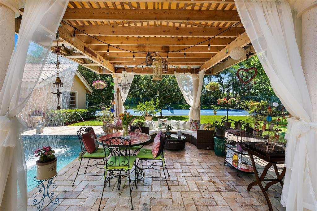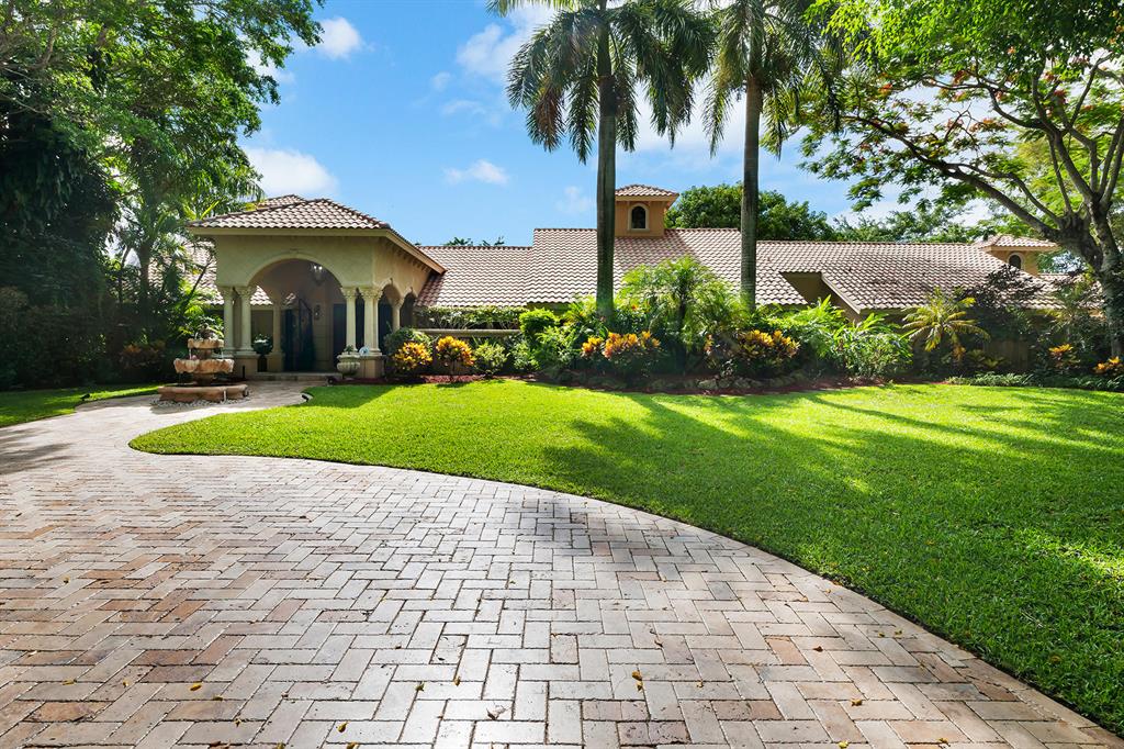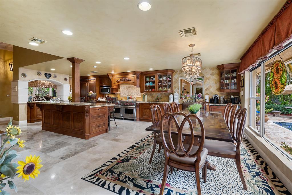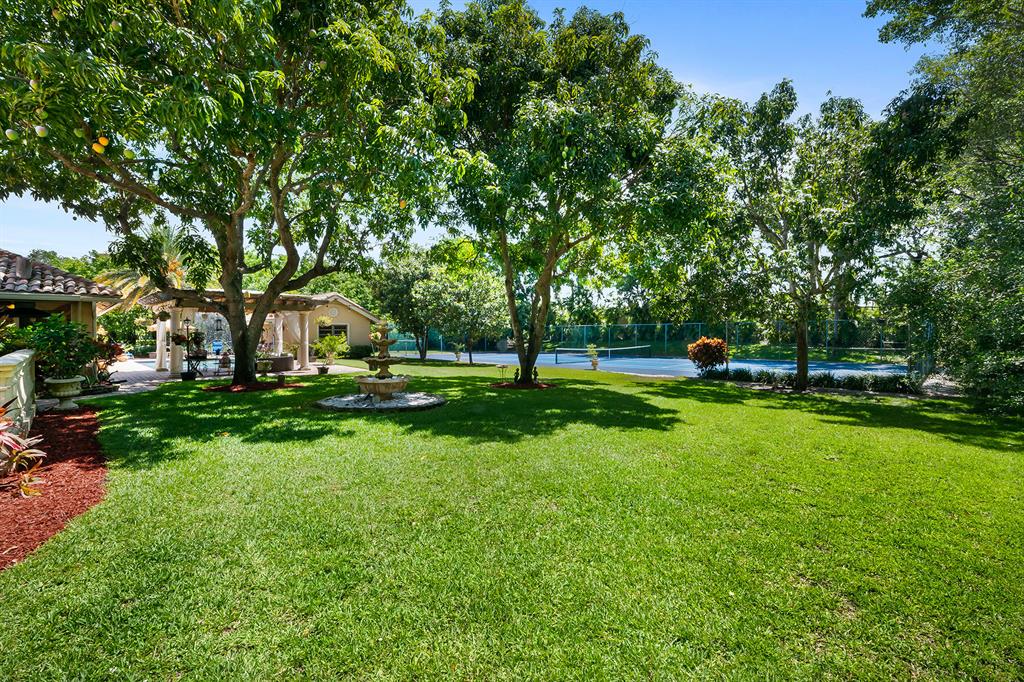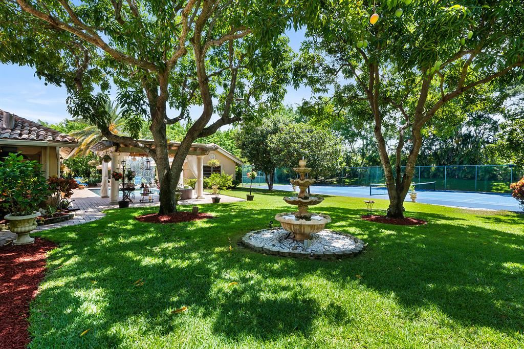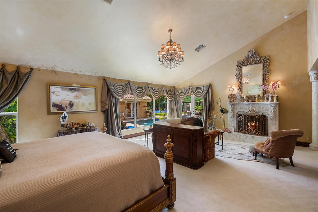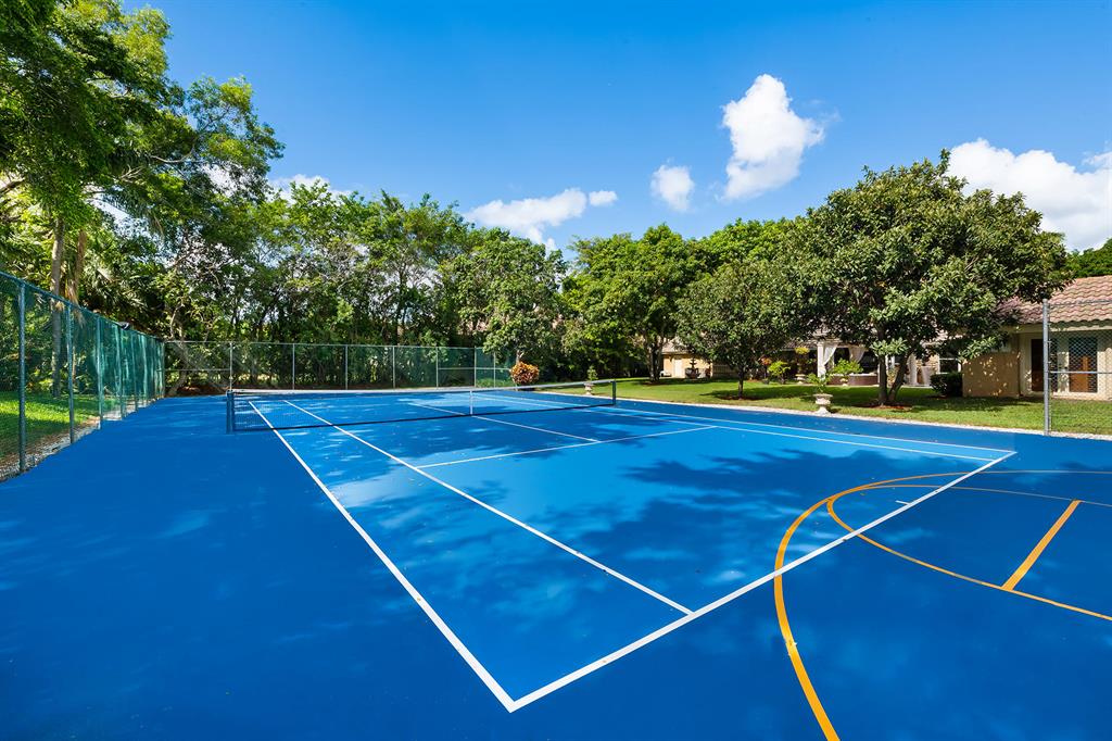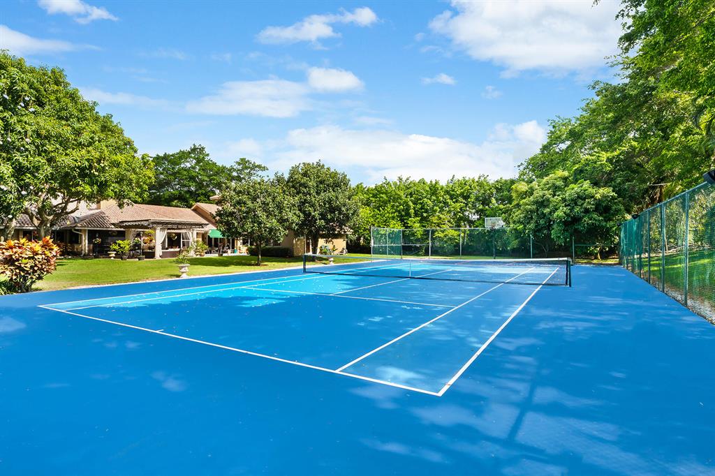 This retreat-style estate home sits on an acre of land & is complete with a tennis court, private pool & guest house. Inside you will find luxurious details such as Swarovski crystal door knobs & chandeliers by the same designer as the Boca Hotel. The gourmet chef's kitchen features a 6-burner double Wolf gas range with griddle, Subzero refrigerator & freezer, oversized granite island, copper farmer's sink & wine fridge, perfect for entertaining. The large family room & eat-in area are great for families & overlook the beautiful outdoor space. The oversized primary suite features a sitting area, soaring ceilings, his & hers California closets & an en-suite bath with a large double vanity & spa tub. The primary bathroom also features stunning onyx countertops. The wood paneled library...