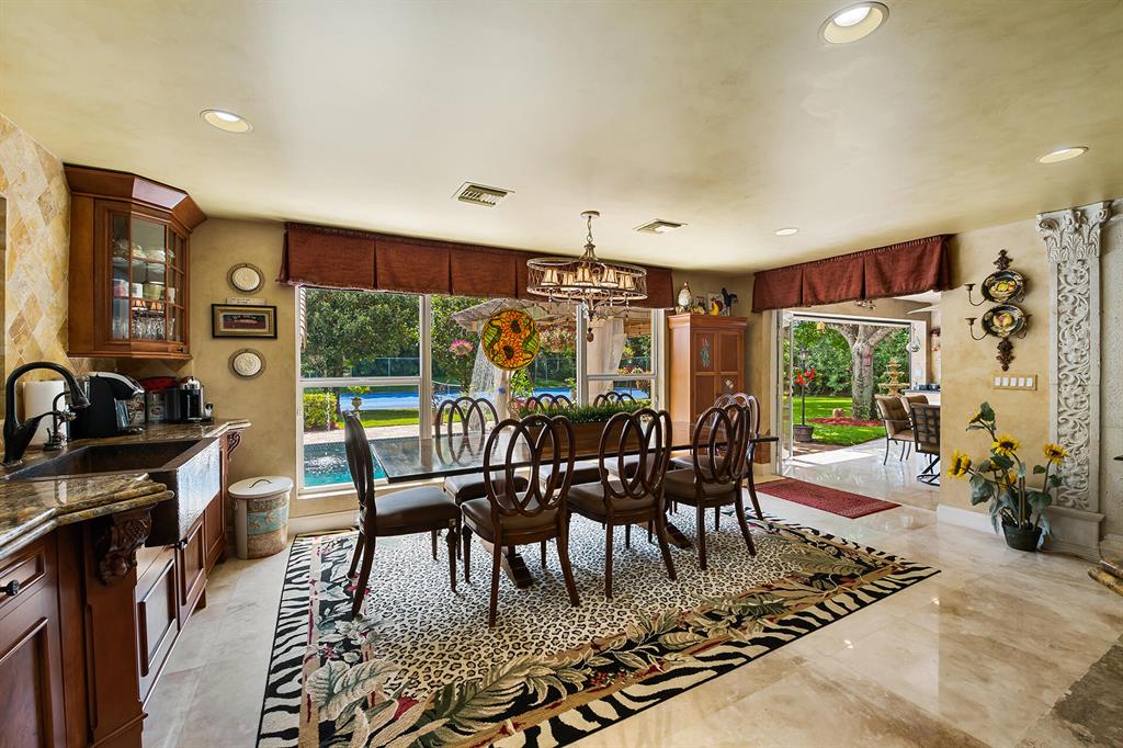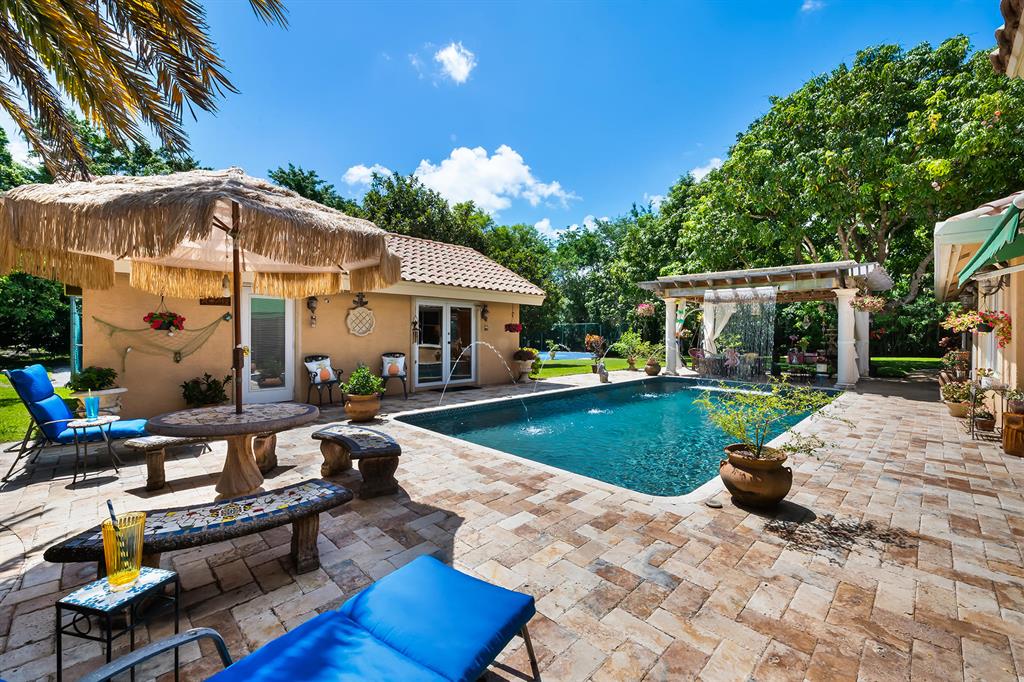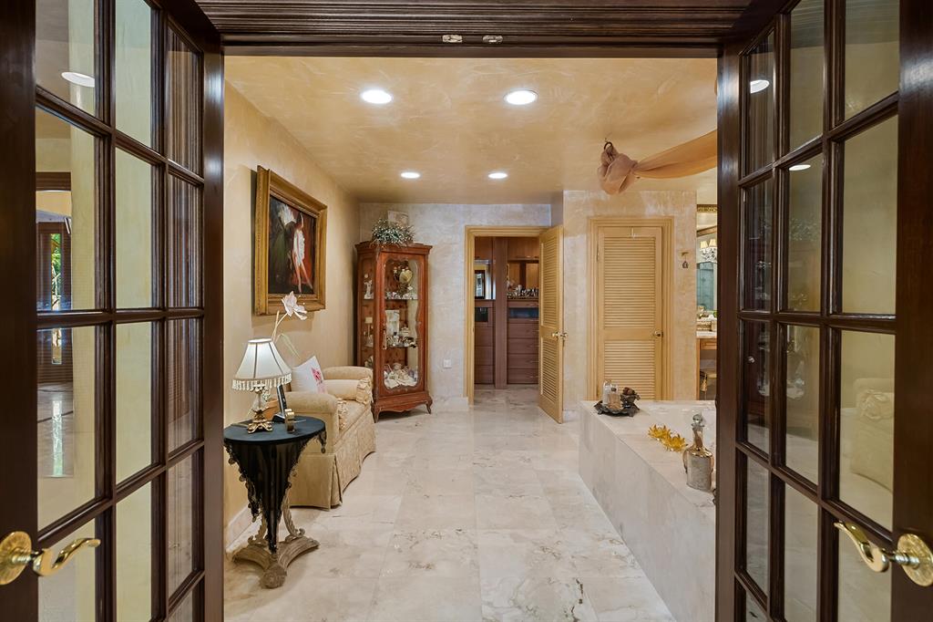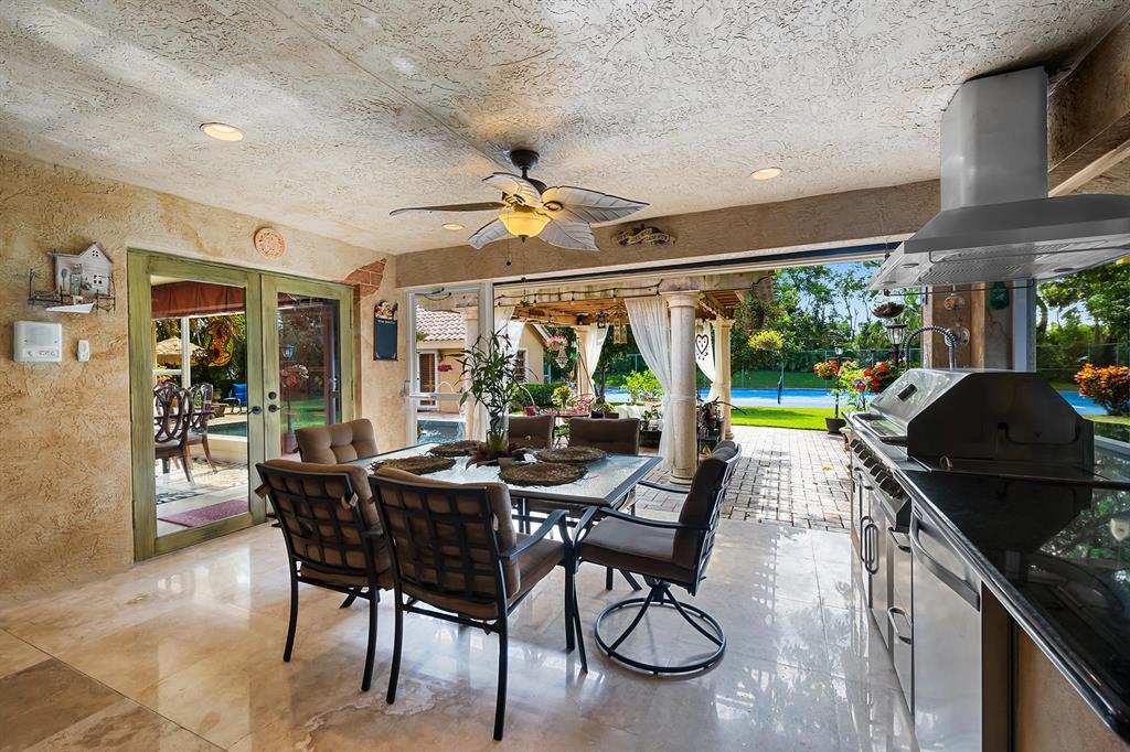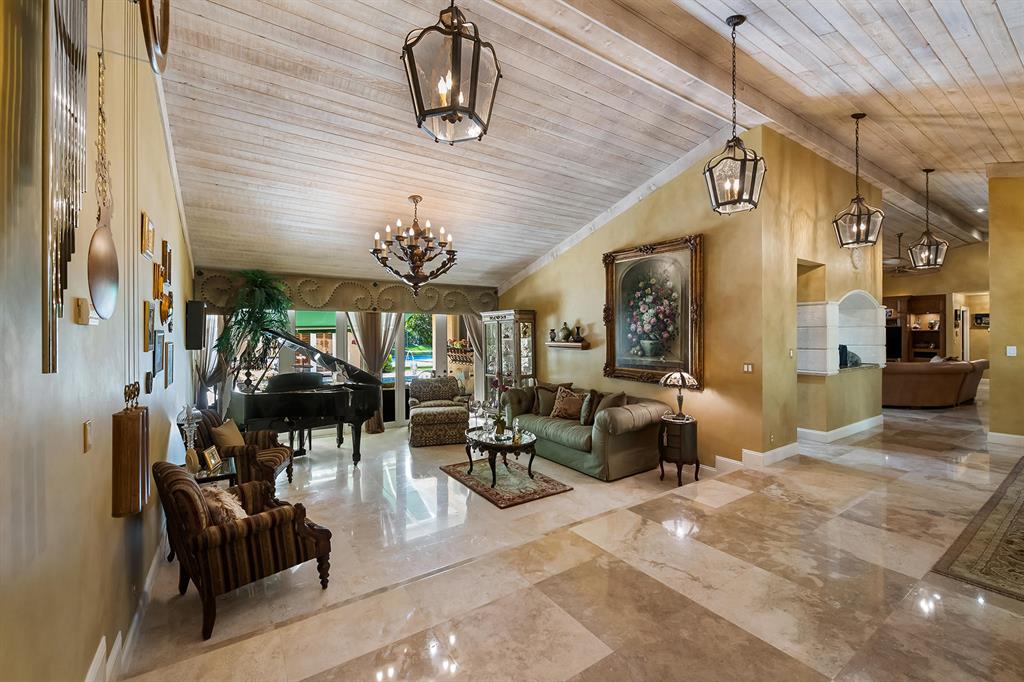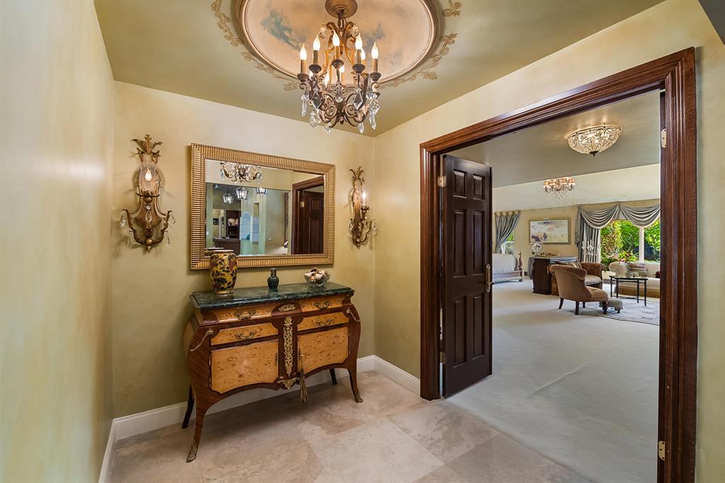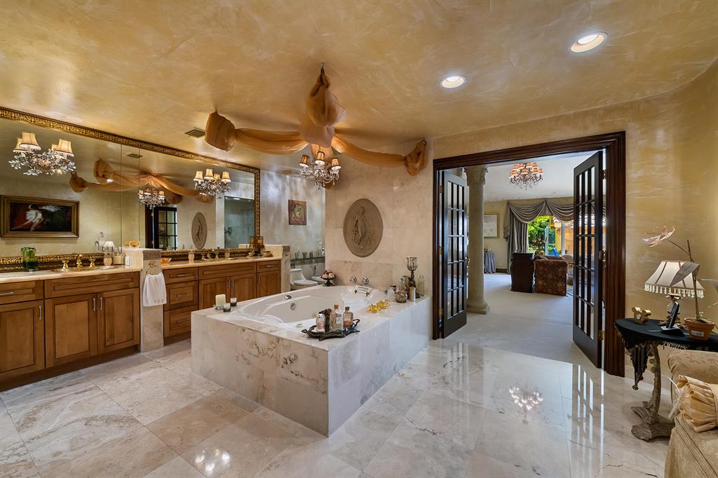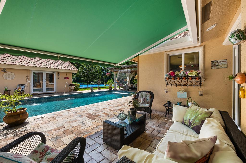 This retreat-style estate home sits on an acre of land & is complete with a tennis court, private pool & guest house. Inside you will find luxurious details such as Swarovski crystal door knobs & chandeliers by the same designer as the Boca Hotel. The gourmet chef's kitchen features a 6-burner double Wolf gas range with griddle, Subzero refrigerator & freezer, oversized granite island, copper farmer's sink & wine fridge, perfect for entertaining. The large family room & eat-in area are great for families & overlook the beautiful outdoor space. The oversized primary suite features a sitting area, soaring ceilings, his & hers California closets & an en-suite bath with a large double vanity & spa tub. The primary bathroom also features stunning onyx countertops. The wood paneled library...