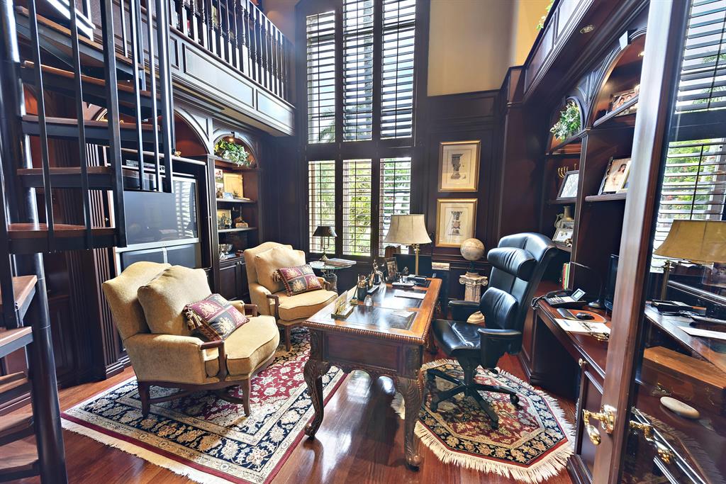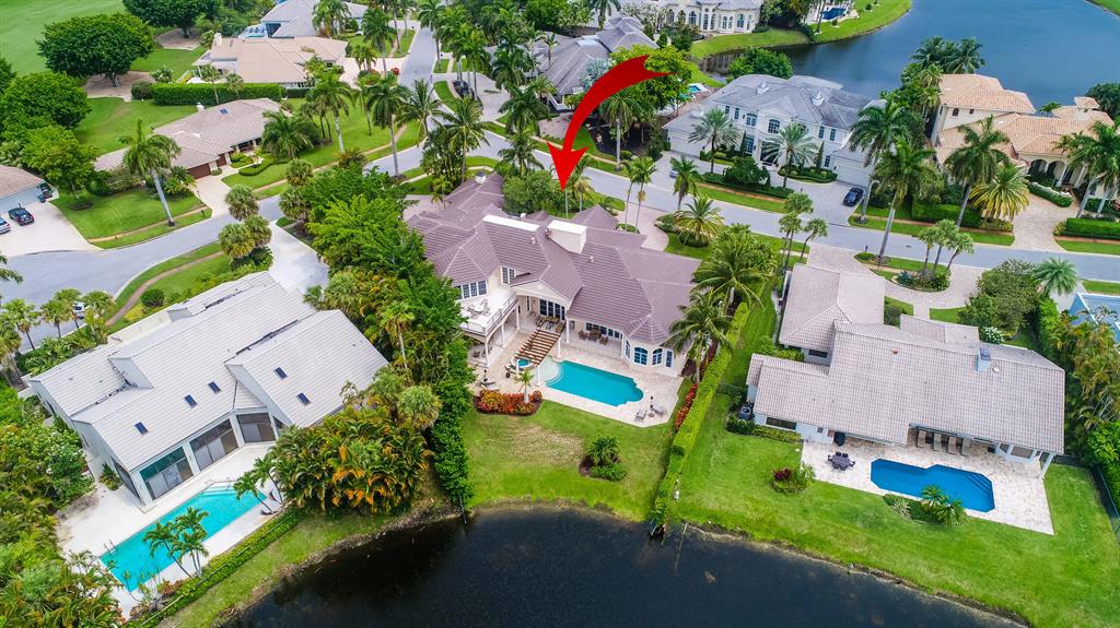 This luxurious Palm Beach inspired estate with over 7,700 sq ft of living area is situated on over 1/2 acre lot and enjoys spectacular lake and golf course views. Featuring magnificent architecture and quality custom finishes throughout the first floor offers a stunning living room, dining room, rich wood paneled library, gourmet chef's kitchen, large family room, home theater, luxurious master suite with his and her bathrooms and sitting room and en-suite guest bedroom. The second floor offers an entertainment area, 3 large bedrooms with adjoining baths, 2 private balconies with stunning views. A lushly landscaped resort-style pool, spa, kitchen and loggia offer the upmost in entertainment and complete this estate. Additional features include 4 car plus golf cart garage, generator,