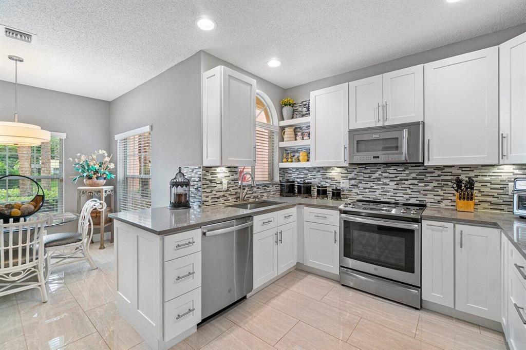 CHARMING single family home located in BOCA POINTE'S PANACHE Community.24hr guard gate. Updated kitchen, quartz counters, S.S appliances, beautiful porcelain tile throughout the1st floor.Light & bright dining & living rm, bar, surround sound, lovely outdoor screened patio great for entertaining & BBQ's. All 3 bdrms on 2nd floor. Spacious master bdrm, beautifully updated master bath. Currently the 3rd bdrm is used for an office/den. Bdrms 2&3 share adjoining full bath. ROOF 2019, AC 2012,HWH 2021. Panache is a quiet enclave of townhomes w lots of greenery and a community pool. MOVE RIGHT IN! A+ Schools and shopping! Club membership is OPTIONAL(NOT REQUIRED)There are many memberships avail for you to choose. Walking distance to Club. Enjoy the South Florida Living!!