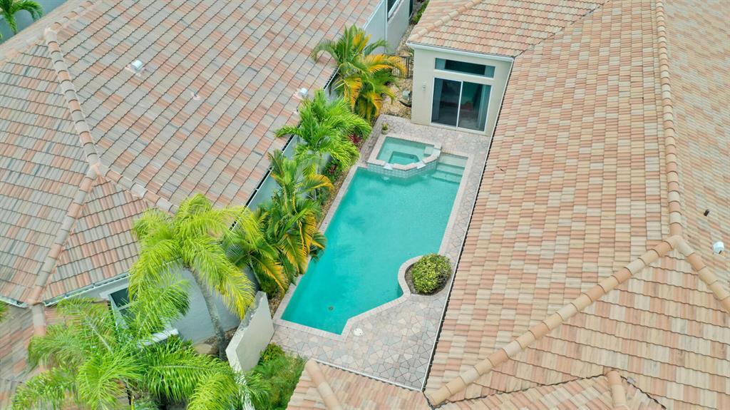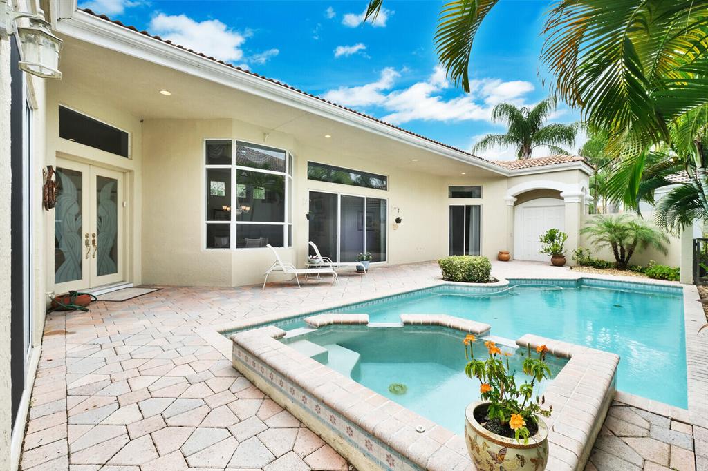 Courtyard home situated on a premium lot overlooking the 8th fairway of the Heritage. This 3BR/3BA with pool and spa boasts two views. Many of the rooms overlook the private pool, spa and patio area, and the western side of the home overlooks the golf course, with no cart path or tee box. This Courtyard plan offers a large living and dining room, and also a redone kitchen (with new cabinetry, stainless appliances, and granite tops), open to a family room. The oversized primary suite features a large bedroom, with room for a desk, overlooking the pool & spa area, and the golf course. If you are considering putting your own stamp on a home, this would be an excellent one because of its premium lot, unique and versatile floor plan and prime location within the heart of Ibis.