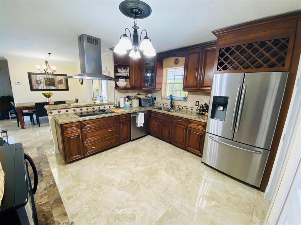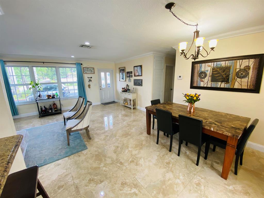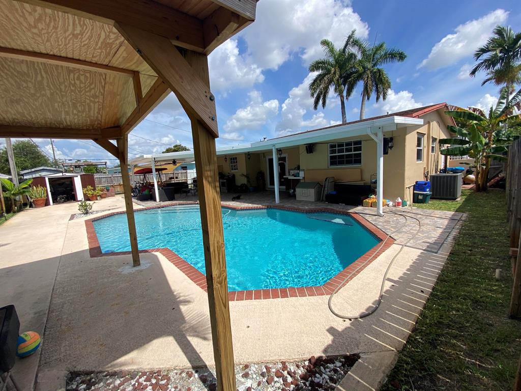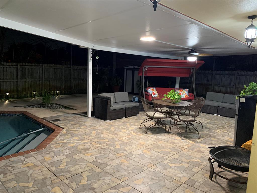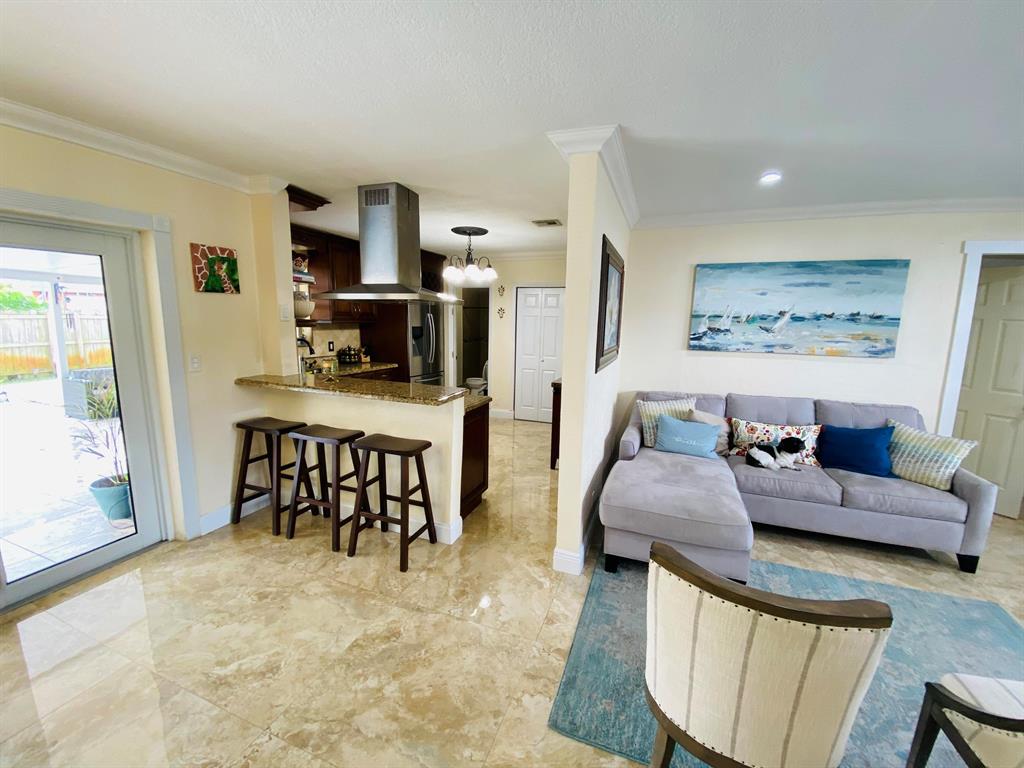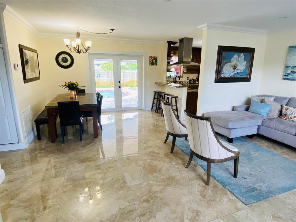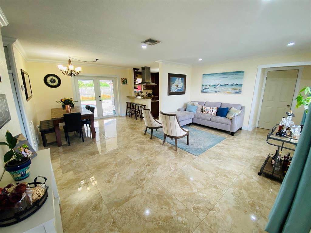 Gorgeous and impeccably kept 3BR 3BA home with a pool. Home has been updated throughout with a modern feel. There are custom oversized 32x32 porcelain tile in the living areas. The bedrooms have a laminate wood plank floor. Most windows are hurricane impact including the French doors leading out to the patio. There are custom crown moldings throughout the home. The gourmet chef's kitchen won't disappoint! It has stainless appliances and hood, and a large pantry closet. The backyard is spacious and perfect for entertaining with a saltwater pool system complete with a new pool pump and a large covered porch. The pool decking is concrete, great for low maintenance. The pool includes a safety gate. There is a bbq gazebo next to the pool. There is an avocado tree in the front and several