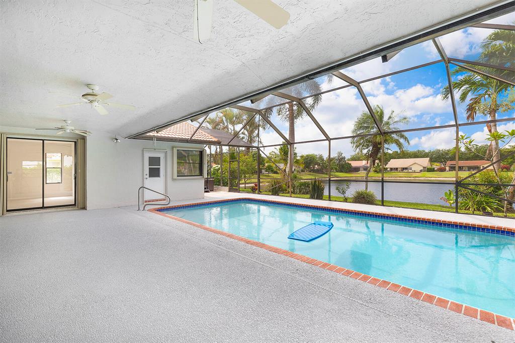 Completely updated southern exposure lakefront gem. This 4 Bedroom pool home with two car garage features updates including all smooth ceilings, wood floors, new bathrooms, newer kitchen & new stainless steel appliances, freshly painted, new carpeting, newer diamond-brite finish pool. Covered screened Lanai features 2 cabana baths & pre plumbing & electric for summer kitchen. Relax at the separate Jacuzzi area featuring great lake views The home is protected with a monitored home alarm system & accordion shutters making preparations for Mother Nature quick & easy. A pavered driveway & walkway with impeccably landscaped yard creates stunning curb appeal. Marvel at the canopied tree lined streets with one of the lowest HOA fees of most any community in Boca Raton. ''A'' Rated Schools.