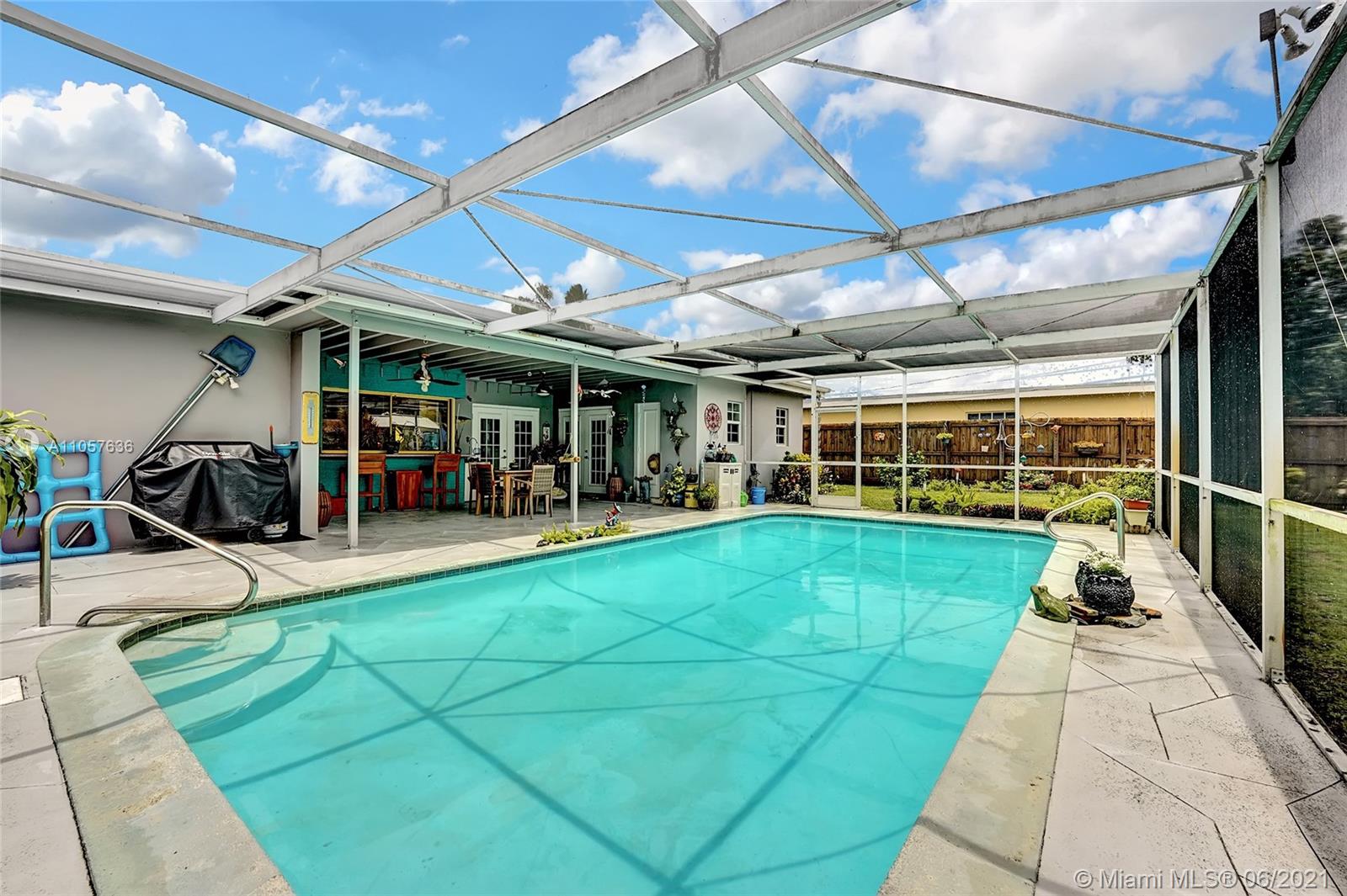 Are you looking for a tropical tranquil home that is great for entertaining & less than 5 miles to Hollywood Beach Then look no further, this 4 Bedroom 2 Bathroom home sits on a spacious 7,673 fully fenced sqft lot. Enter through your foyer & your greeted by the open flowing floor plan and captivating views of the pool. The large kitchen is thoughtfully designed w/ built-in pantry & large pass through window w/ pool bar seating. Triple split floor plan. Spacious bedrooms. Upgraded bamboo flooring throughout. Master suite features walk-in closet w/ built-ins & en-suite cabana bath. French doors lead you from the living space to your screened pool deck w/ covered patio & plenty of yard pass the pool to enjoy! Outdoor storage shed. Impact windows/doors. Large circular driveway & much more!