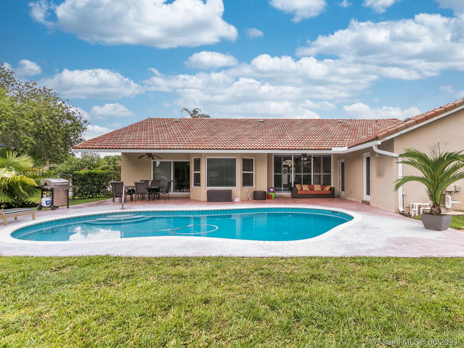 Must see! 4/2.5 pool home with split open floor plan in desirable Kensington. Updated, impeccably maintained & MOVE IN READY!. Situated on an oversized corner lot, completely fenced & has full hurricane impact windows. Custom kitchen features 42in cabinets, granite counters, lg island & breakfast area. Neutral, 20x20 porcelain tile throughout main living areas laid on the diagonal. Laminate in bedrooms. California Closets throughout offers exceptional storage and organization. Updated, modern baths, newer, S/S appliances, custom, built in family room wall unit and built in master bedroom double dresser. New dishwasher, disposal, garage refrigerator, Diamond Brite and pool pump.X- large backyard with firepit. Outstanding location with top rated schools. SHOWINGS BEGIN SAT. JUNE 26 12P-3PM