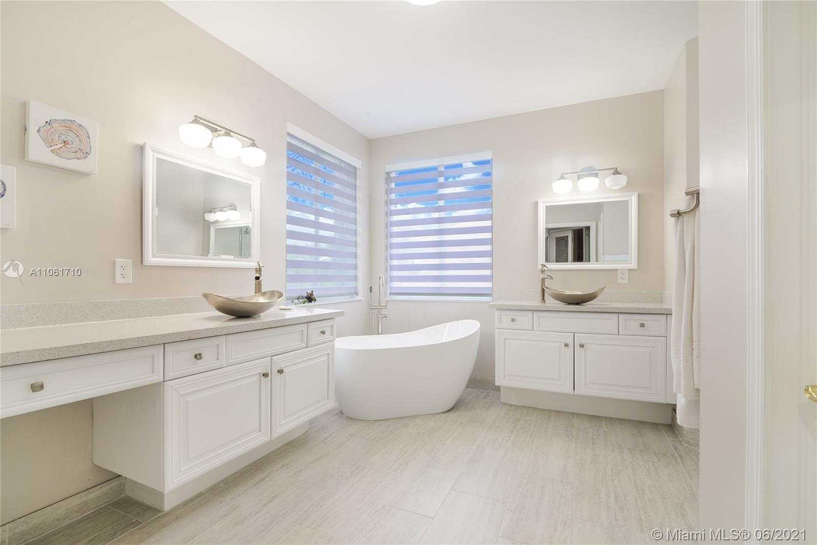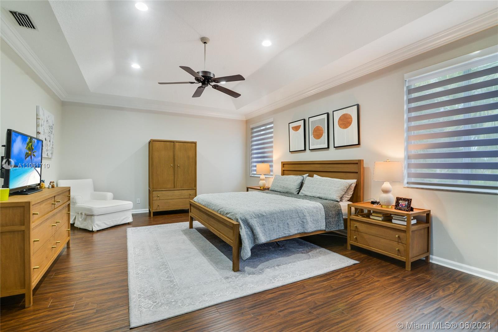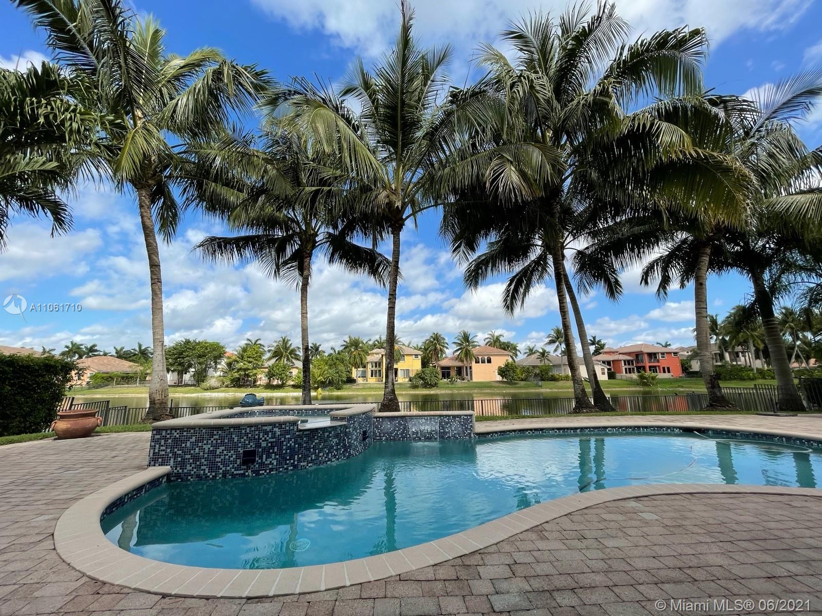 Beautiful Lakefront Home w/a breathtaking lake view. 5 Bedrooms, 4 Baths. Master bedroom has separate sitting room, 2 walk-in closets & oversized bathroom. California closets, Loft, Office/Den, TV/Theater Room, Fam. Room, Living Room & Dining Room, Foyer, 3 car garage, pool, jacuzzi, patio furnit, covered terrace & entry, sprinkler system, soaring volm ceilings, spiral staircase, porcelain tiles, new blinds, freshly painted. NEW kitchen w/ Quartz Waterfall countertops, stainless steel appliances, LG double oven range. New Maytag washer & dryer, smart outlets w/USB chargers, LED lights, 2019 high efficiency air conditioner, 2 units, smart thermostat, built out garage, hurricane shutters. 10,719 sqr ft of land. Great amenities & wonderful location, close to schools, shopping & restaurants.