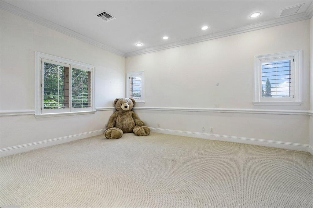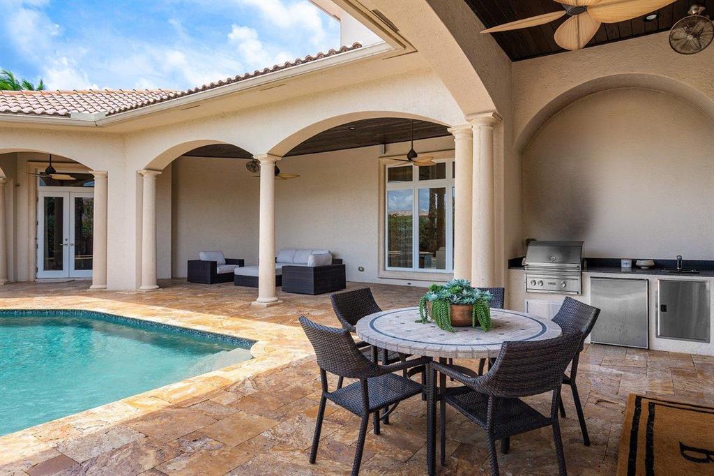 Stately home on an incredible .39 acre cul-de-sac waterfront lot in Boca Raton's most premiere established community has a grande entry with large windows showcasing a view of the tropical outdoors. Designed with beautiful details like Jerusalem marble floors with mosaics, various lit wall inserts, coffered ceilings, artistic glass front door & plantation shutters, this 5 BR 5 full and 2 half bath home has been decorated with a keen attention to detail. Downstairs has a master suite, executive office, media room, guest room with full bath, 2 powder rooms, a bar & a laundry room. Updated white kitchen with contrasting quartzite countertops features Bosch double oven and microwave, Viking gas stove & Subzero double refrigerator perfect for entertaining. Luxurious master suite has