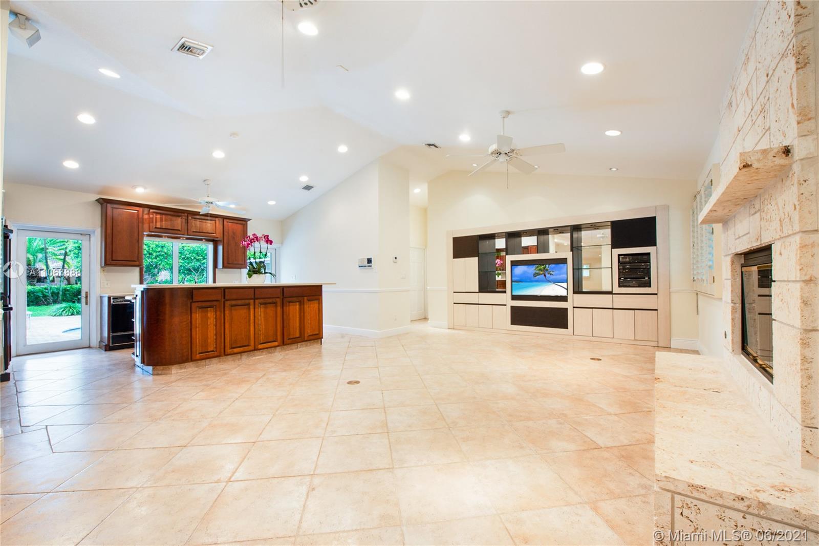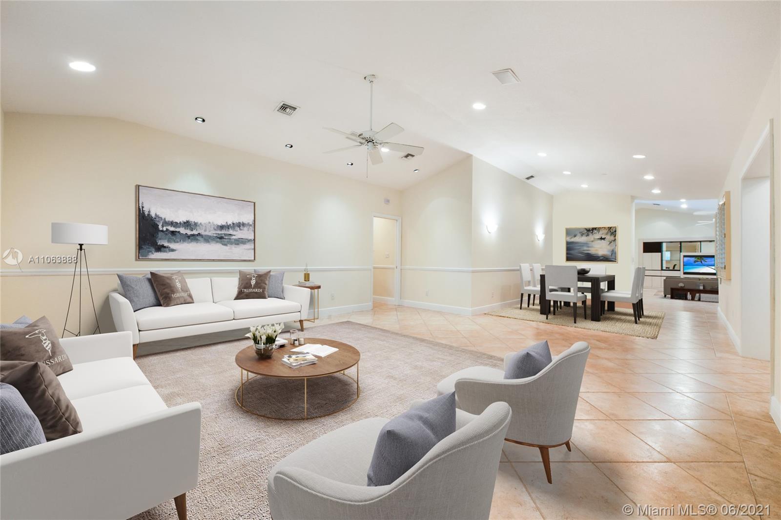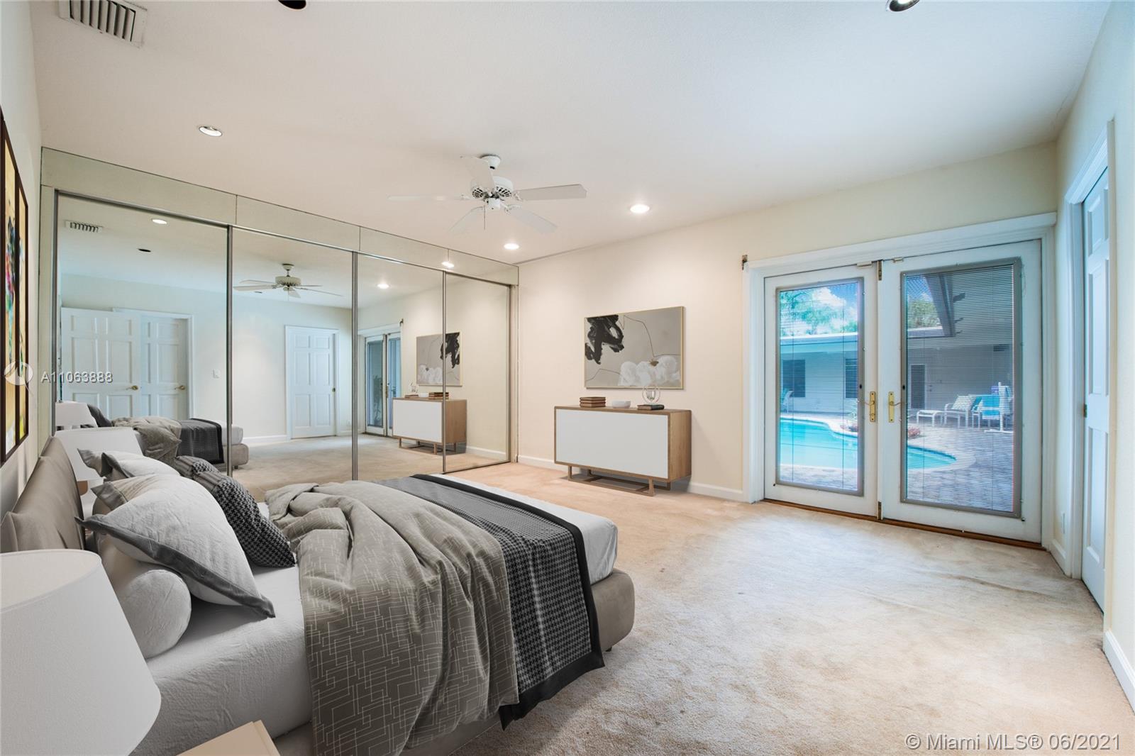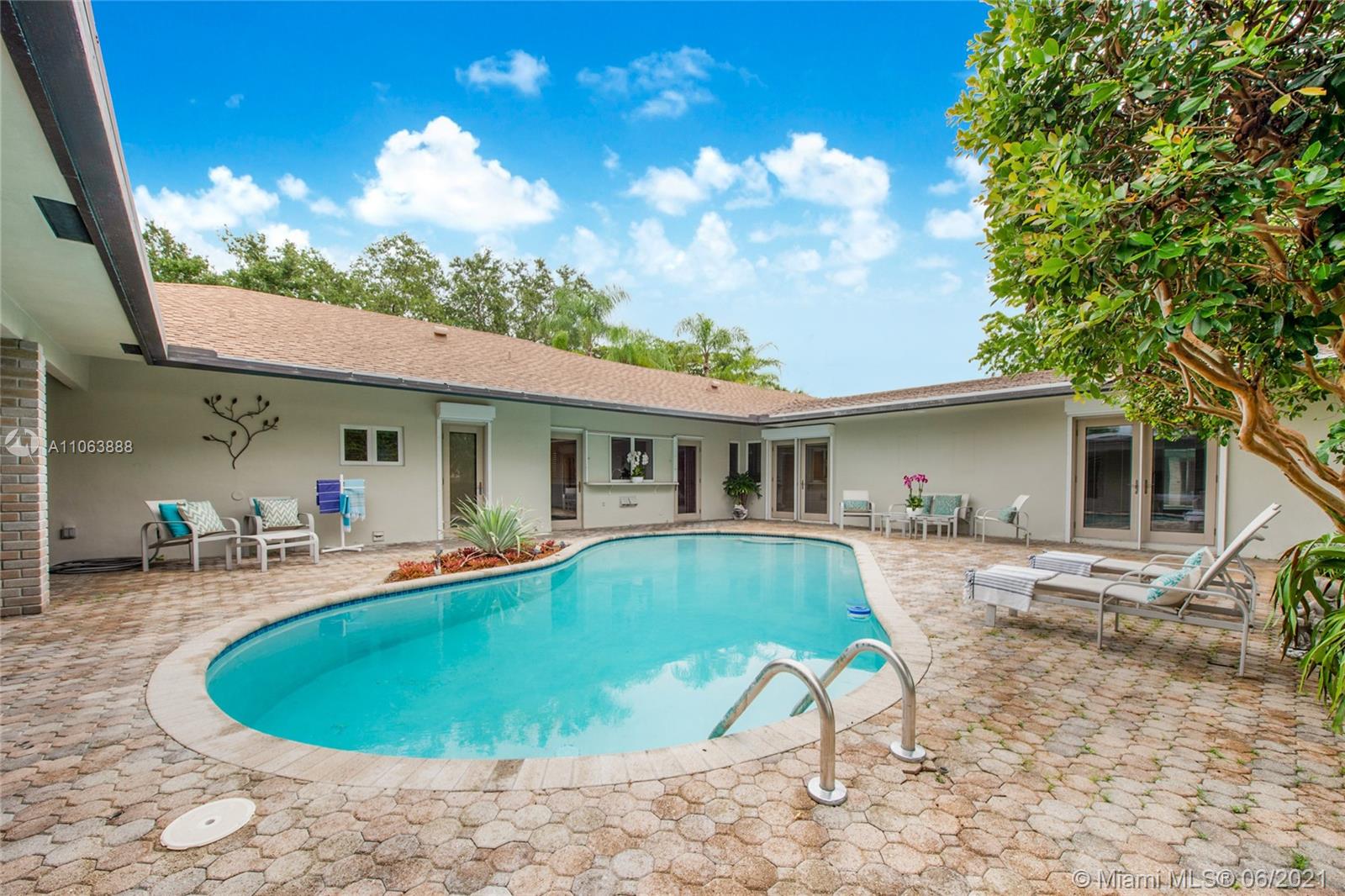 Fall in love with this timeless, contemporary ‘stand-out’ home built in 1960 but re-invented in 1992 with volume ceilings and an open-floor concept; a home ahead of its time. A fabulous floor plan with formal foyer entry, wonderful poolside master suite, eat-in kitchen & snack court, giant family room w/ fireplace, and the most spacious formal living and dining rooms will wow all who enter. Entertain and live alfresco in a splendid pool setting with wide covered terrace and lush greenspace, and for the practical minded who can resist a REAL laundry room, full 2-car garage, parking for a fleet, and a short walk to school? A little polish, shine, and styling will make this Pinecrest home shine bright. 2-year roof, 3-year HVAC, and newly resurfaced pool pave the way for a new generation.