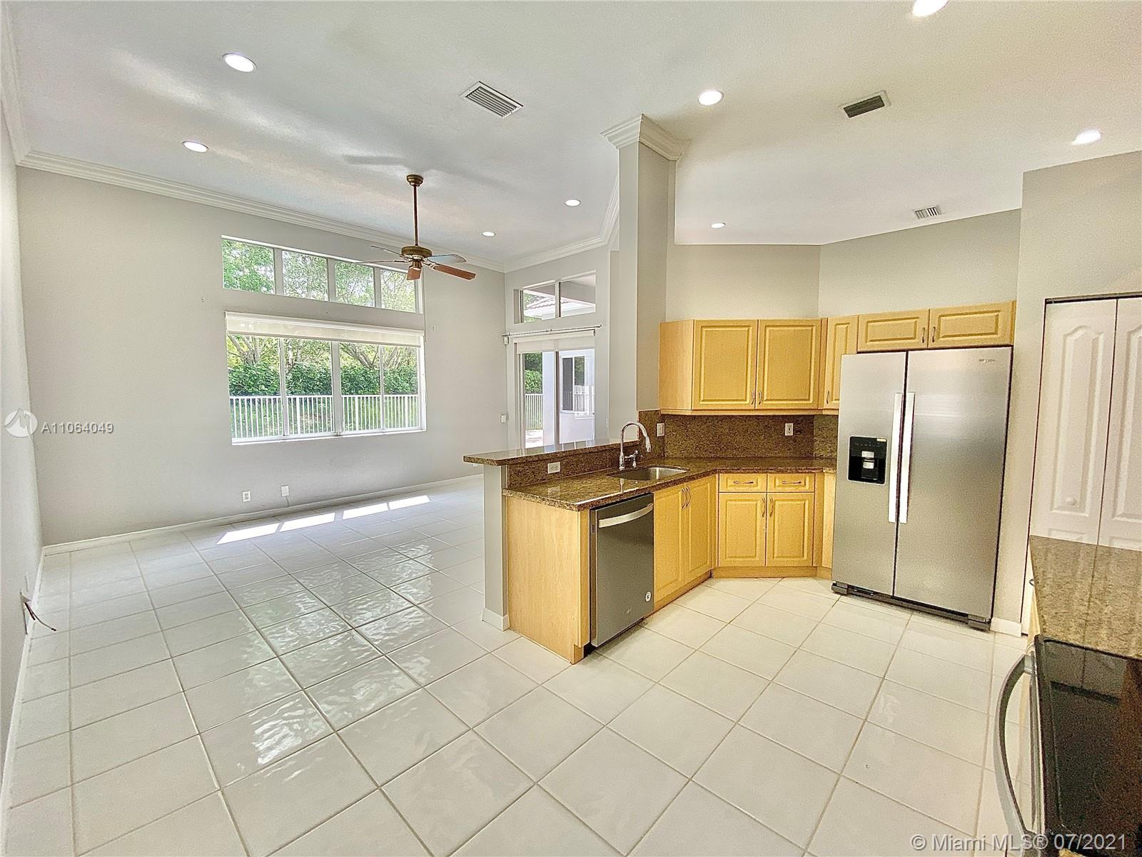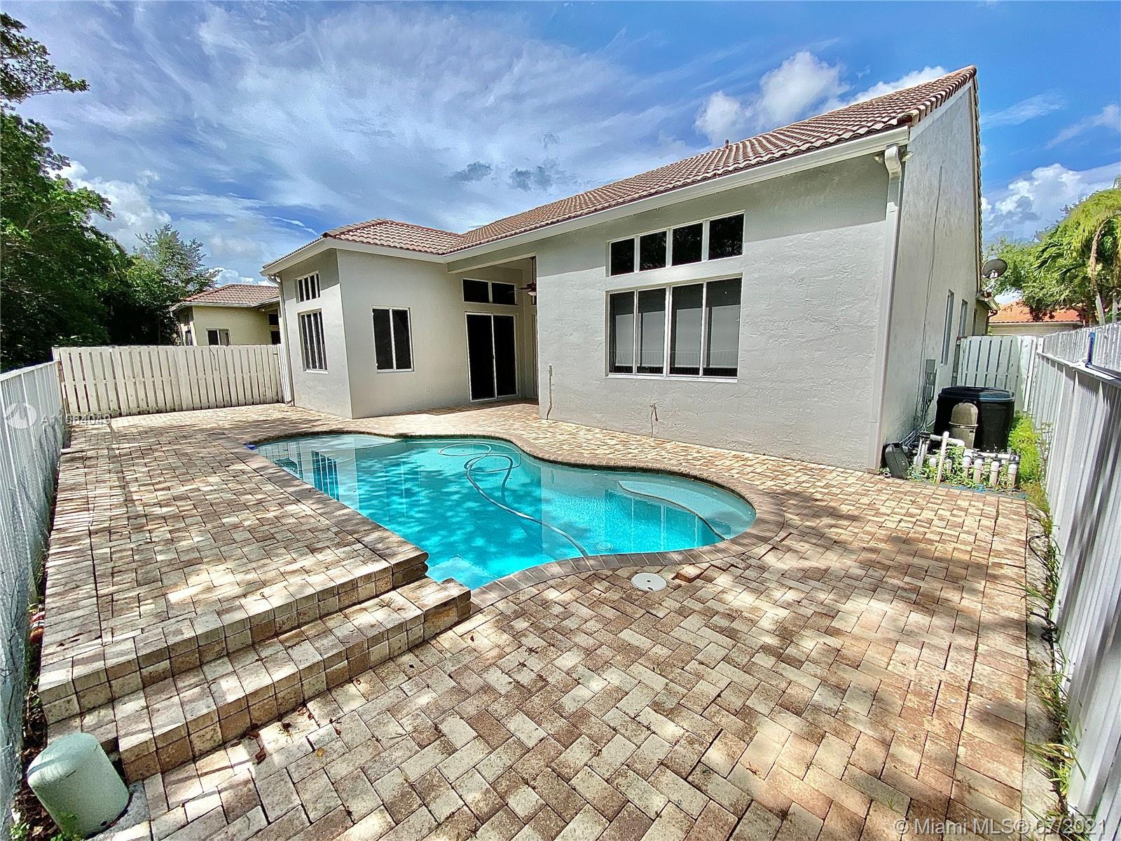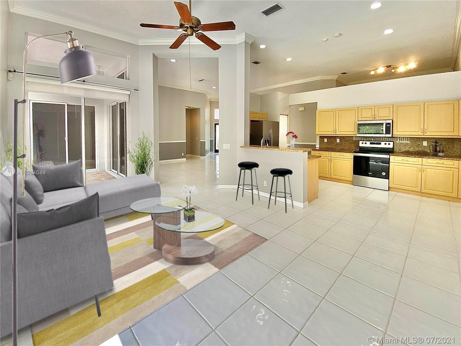 TALK ABOUT LOCATION! IMPRESSIVE 1 STORY POOL HOME AT THE ISLANDS BOASTING HIGH CEILINGS & PLENTY OF NATURAL LIGHT. FEATURING WOOD & TILE FLOORING, SPACIOUS KITCHEN WITH GRANITE COUNTERS & BRAND NEW STAINLESS APPLIANCES. THIS PEFECTLY LAID OUT FLOOR PLAN OFFERS LARGE & INVITING SPACES WITH FORMAL DINING, LIVING AND FAMILY ROOMS, 4th BEDROOM USED AS OFFICE/DEN. RECENTLY UPDATED A/C UNIT (2020) NEW EXTERIOR & INTERIOR PAINT, FENCED BACKYARD WITH BRICK PAVERS. GATED COMMUNITY WITH BASKETBALL COURTS & PLAYGROUND, SO CLOSE TO WESTON TOWN CENTER, BEST SCHOOLS AND MAIN ROADS! *Owner will credit buyer for Accordion Shutters Installation throughout the home*