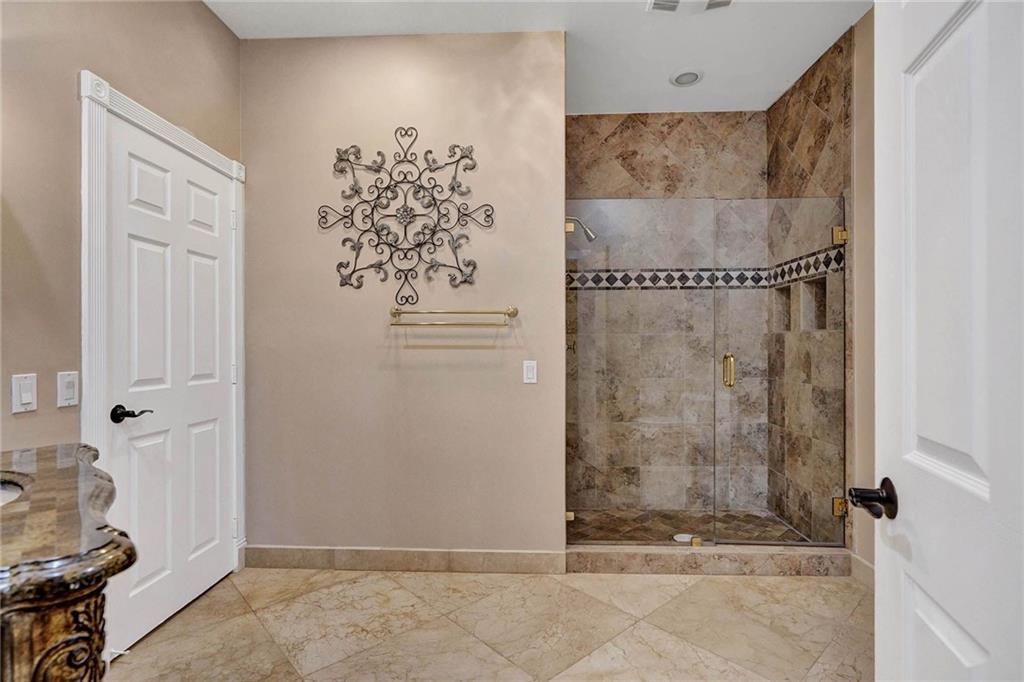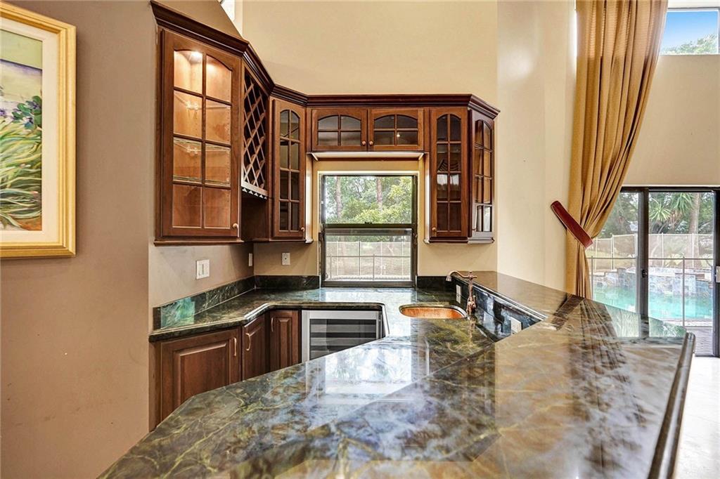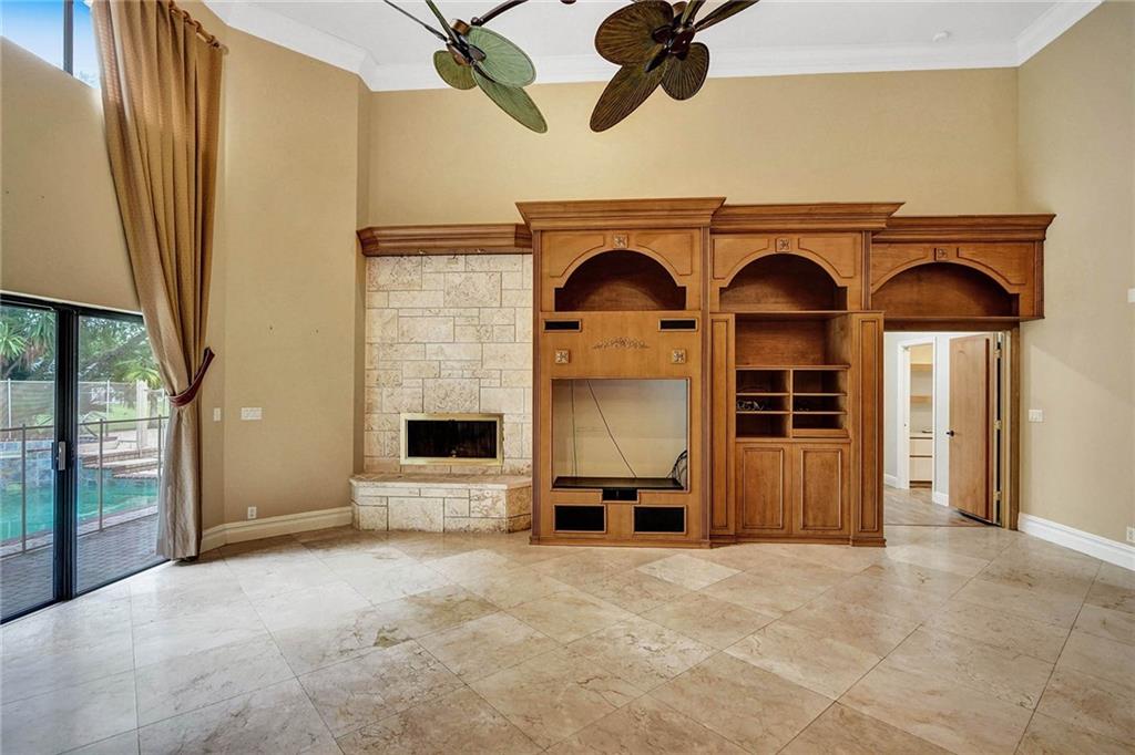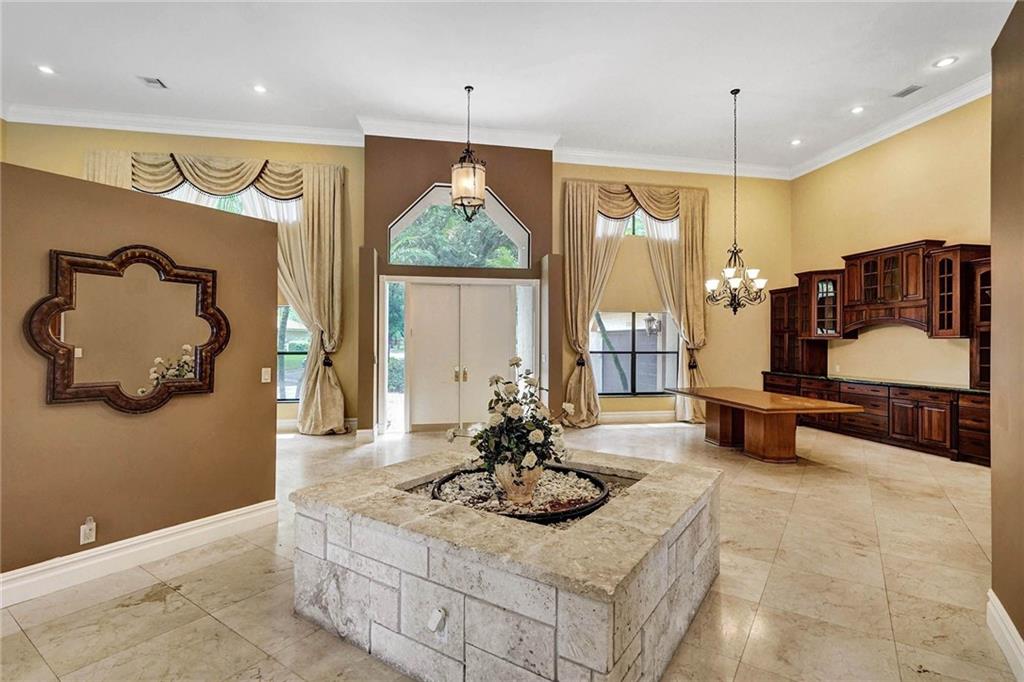 Tree-lined, cul-de-sac on 18000sf pie-shaped, water lot invites you into dramatic 1 story w/ 16' ceilings accented by dbl crown moldings, remodeled kitchen & baths in this 6/4 & sitting area, split design. In the KT, Wolf & Miele stainless appliances. pull down shelves w/soft close drawers, tumblestone backsplash & More!! Center island w/ disposal & full cabinetry. Koehler fixtures in baths w/designer vanities. Dual-side showers in 2 baths. Huge main bath w/jetted tub & multi feature shower. Owners wing over 1000sf w/plantation shutters! Coral Rock Fireplace, first-class built-ins in the FR, DR and Den. Lg wetbar w/pass through, refrigerator & wine chiller. Lg covered patio with pool and elevated spillover spa, with baby fence overlooking water. See attachment for EXTENSIVE features list.