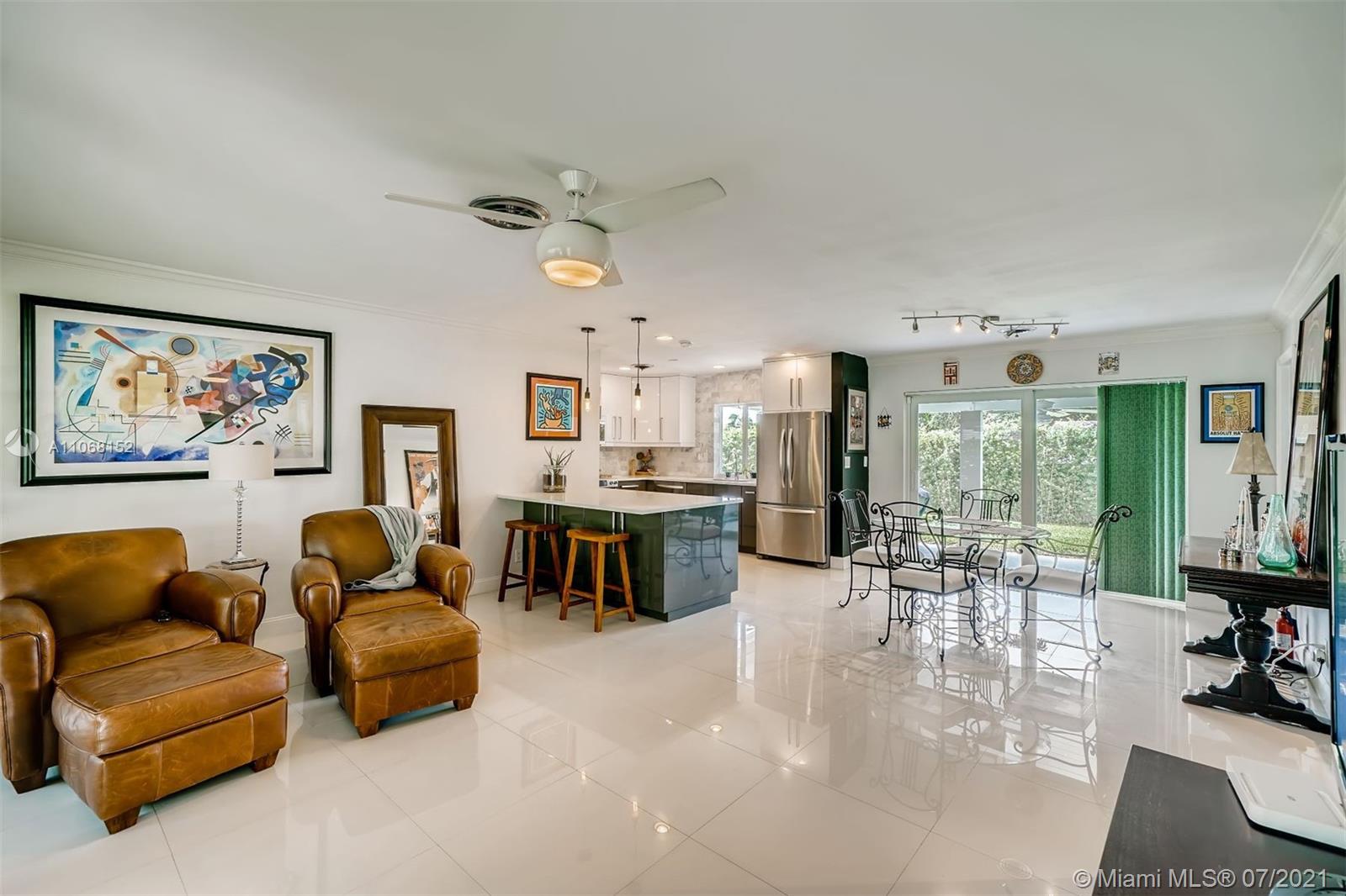 Entering past the beautiful tropical landscape, you will find yourself in a beautiful open-concept living area, with white tiling throughout and tons of natural light from the huge picture window! It flows onward seamlessly toward the dining area, which has access to the backyard via sliding doors. To the left is the remodeled U-shaped kitchen; it comes equipped with stainless steel appliances, marble backsplash, tons of prep space and a breakfast bar. The bedrooms are located just off the dining room, with the primary featuring a walk-in closet and a beautiful ensuite bathroom with a subway tiled standing shower and white fixtures. The secondary bedroom is spacious with continued white tiling and with ample closet space and a great view of the tropical landscape.