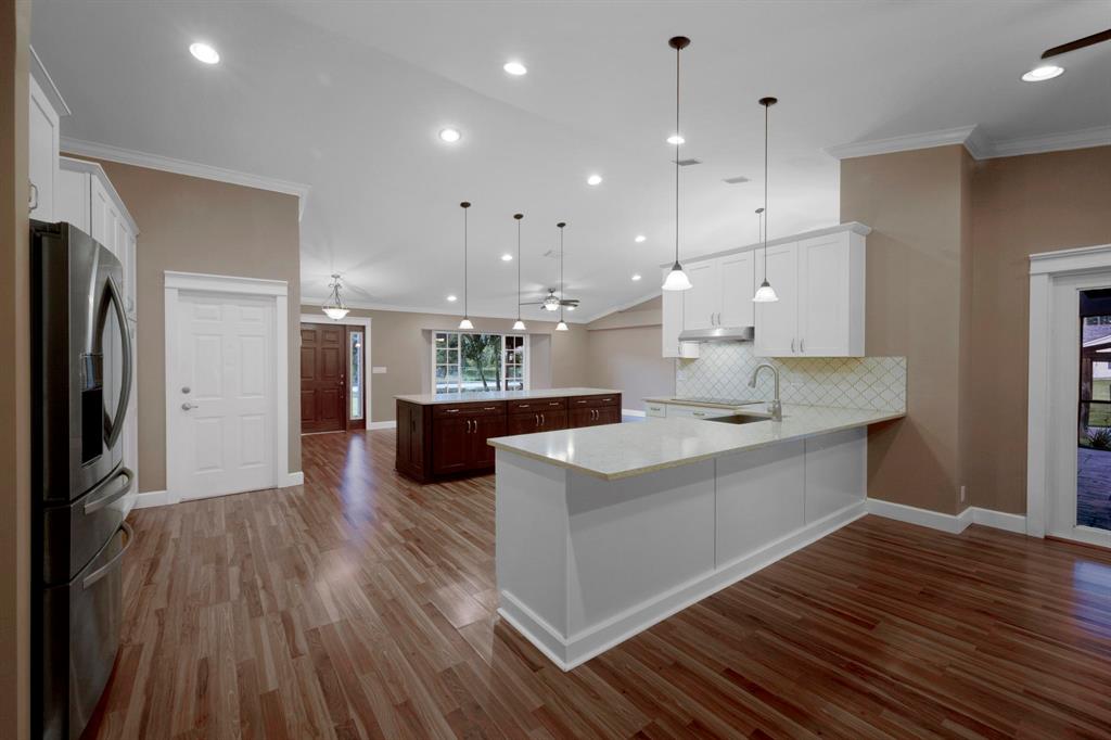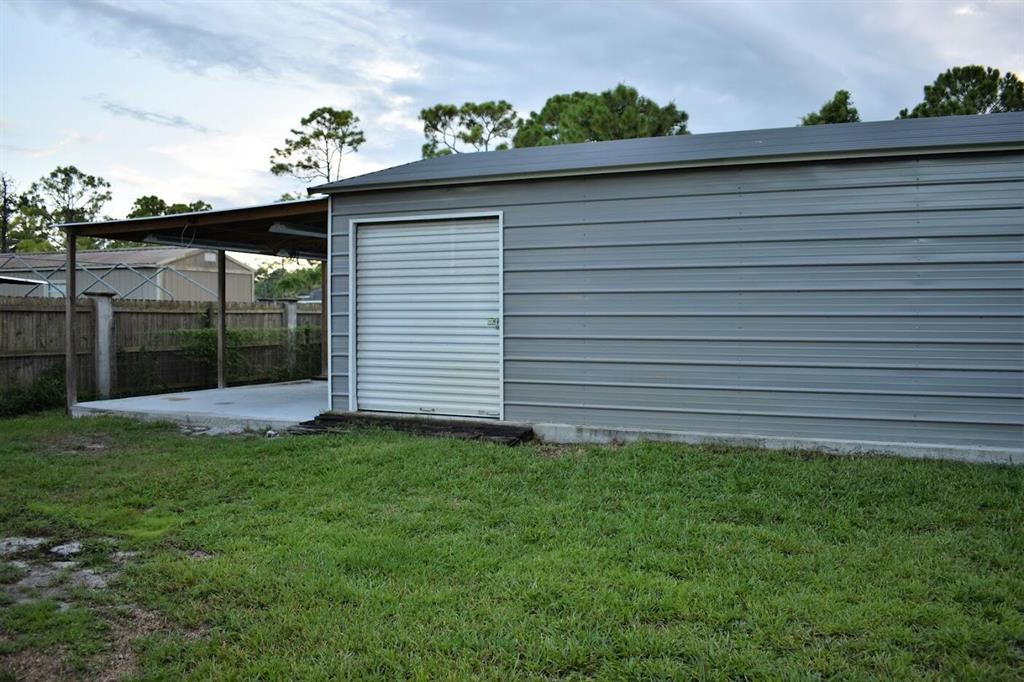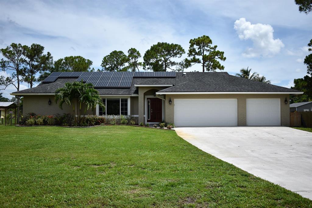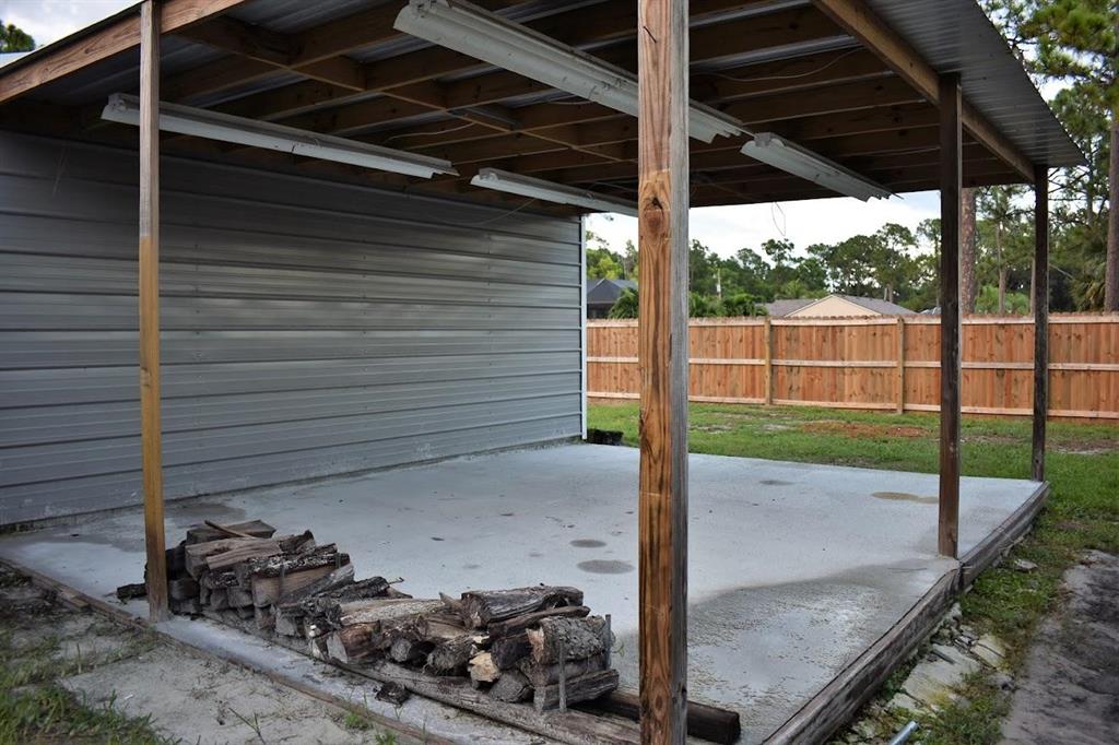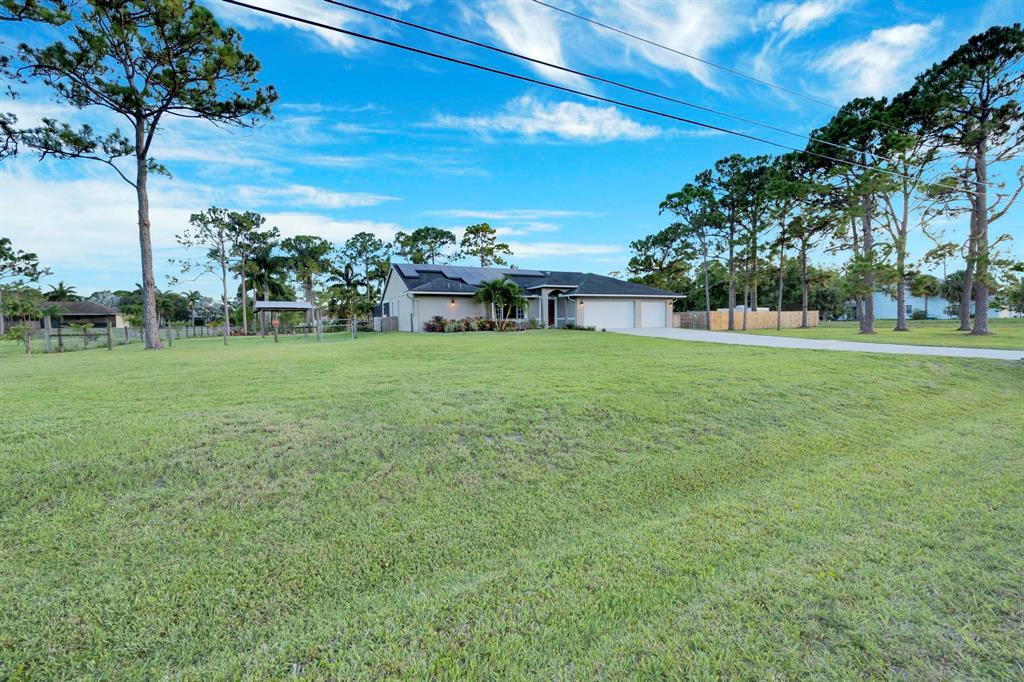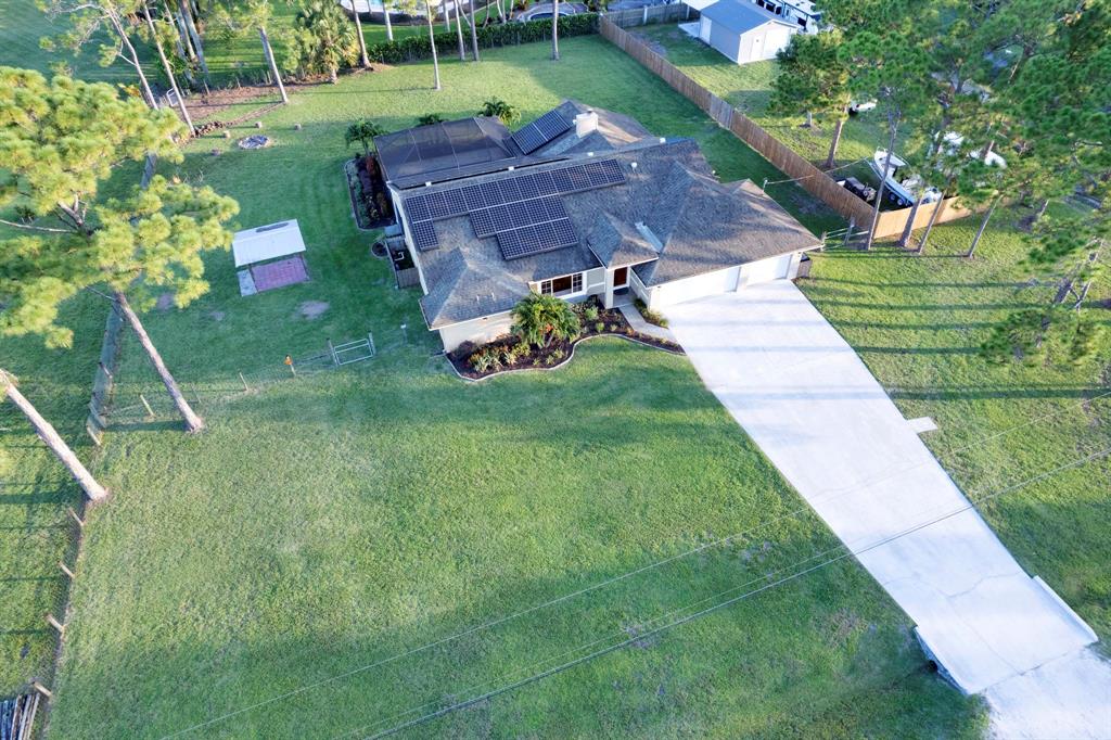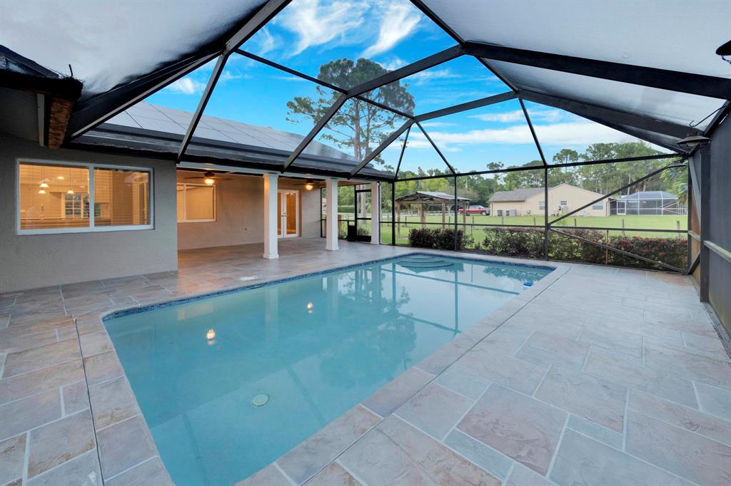 This beautifully renovated home sits on a 1.31 acre corner lot at the end of a dead-end dirt road, and is bordered by a canal on the West side of the home. The home includes 4 bedrooms, 2 bathrooms, 3 car garage, pool with screen-enclosed outdoor living space, 25x18 steel frame detached workshop with attached pole barn, substantial open floor plan, split bedrooms, stainless steel appliances, wood burning fireplace, brand new solar panel system (2021), 2 RING cameras, hurricane impact windows, garage doors, and exterior doors throughout. Master suite includes his/hers separate closets, French doors leading to the pool, soaking tub, stand alone shower, and double sink vanity.