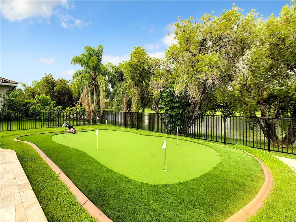 Stunning 6 BR, 4 bath pool & waterfront home on an oversized lot! Upgrades galore! Modern open floor plan with views to the newly remodeled patio, pool, and putting green. The outdoor oasis features a 2,000 sq ft travertine pool deck along with a salt water pool, outdoor fireplace wall perfect for a tv sitting area and views to the tranquil lake. The kitchen features an extra large Quartz countertop and is a newly upgraded chef's kitchen. A new curved tile roof was installed in 2019. New A/C units installed in 2021. All 4 bathrooms upgraded including the master bathroom which features a beautiful marble wall and stand alone soaking tub. 3-car garage w/ hurricane-rated door! Upgraded security system w/ cameras! This house will not last!
