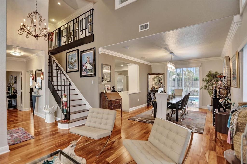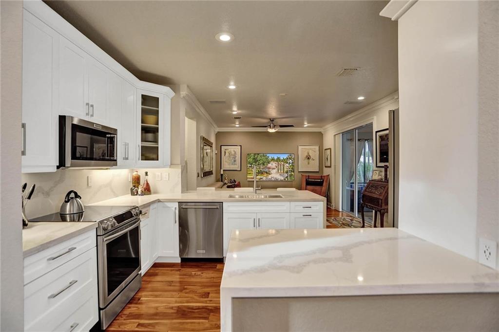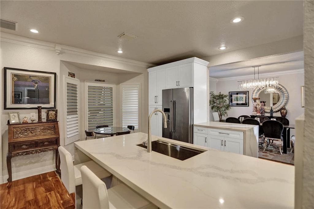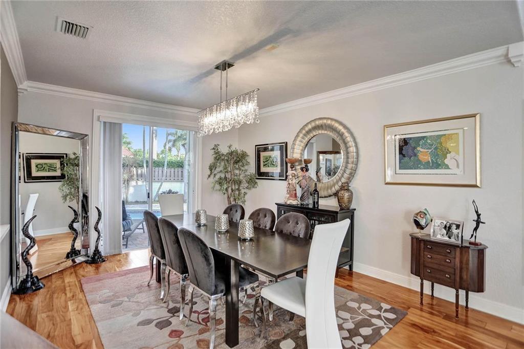 This expertly designed and remodeled home nestled on the premier corner lot in the coveted The Cove in Poinciana Parc, features 4 beds 3 baths and 2,124 of eclectic living space. Step inside the impact french doors on to the brilliant wood floors that are found throughout, a wrought iron staircase, and volume ceilings in the foyer and living room next to the formal dining room. The gourmet kitchen features white shaker cabinets with crown molding, stainless steel appliances, and majestic waterfall quartz countertops, a breakfast nook with impact bay windows overlooking the pool. Entertain in style or just relax in the covered and screened-in patio overlooking the heated pool with brick-pavers, custom bar and grill which is perfect for entertaining guests or your private enjoyment alike.