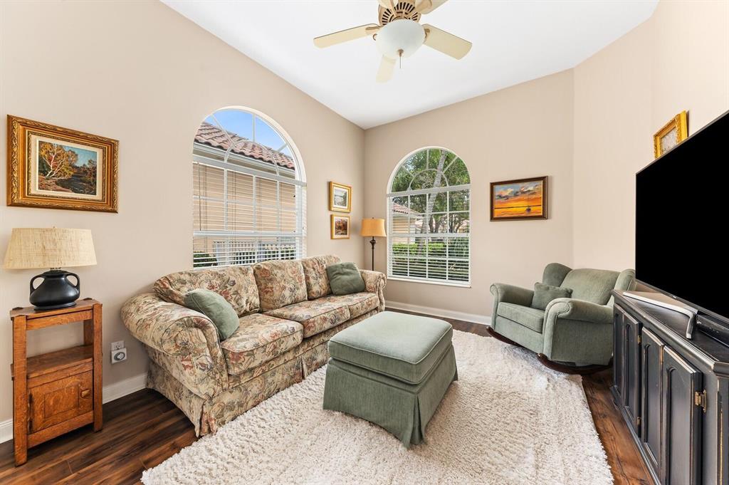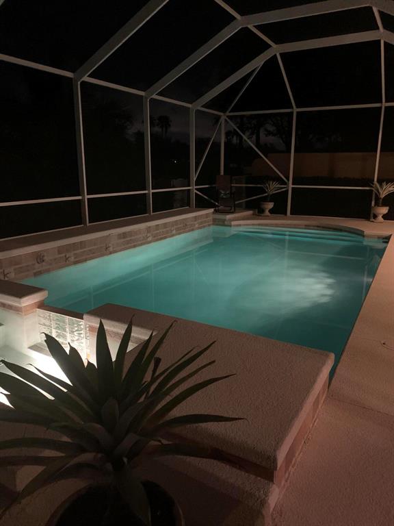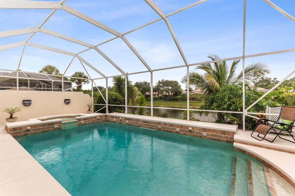 A True Tropical Oasis! This Unique Lakeside Oakmont has all the Must Haves in Today's Everchanging World! What sets it apart from Any other Residence in Riverwalk is its One-of-a-Kind Breathtaking Custom Designed Cushing 40x15 Heated Swimming Pool & Spa with 4 Lion Fountain Heads & 2 Waterfalls with a Raised Sundeck, Overlooking the Azure Blue Lake! You will think that You are at a 5 Star Resort! This is THE ONE & ONLY! A Beautifully Landscaped Motor Court leads to the Covered Screened Entry that Opens to the Tile Foyer with a Stunning Designer Light Fixture that leads to the Great Room with a 12 Foot Ceiling, Stunning Dark Stained Slip Laid Faux Wood Floors & a Fabulously Reimagined Wall Unit with Wood Shelves that looks like it Belongs in a Library! The Dining Area has the Same Floors &