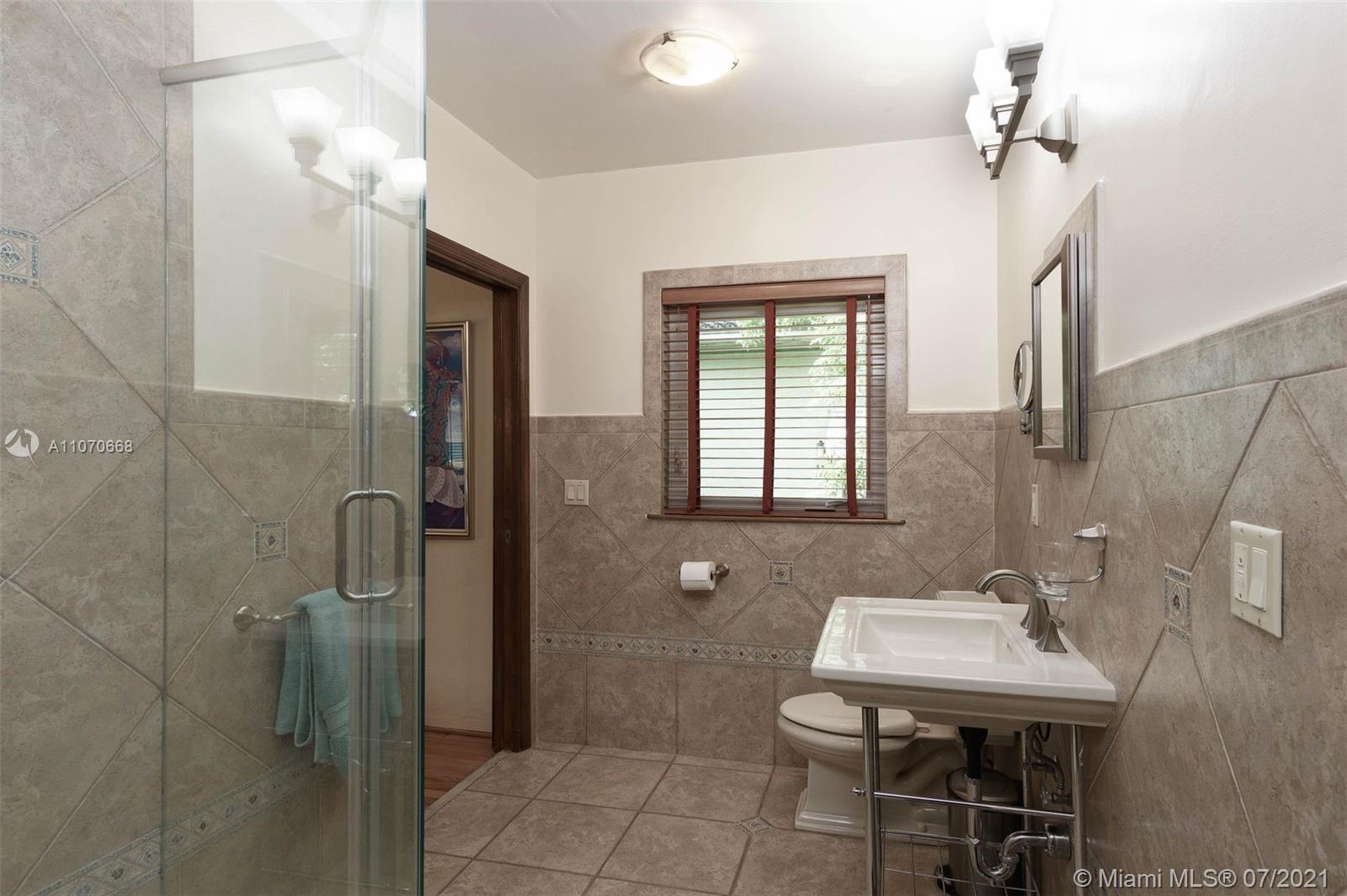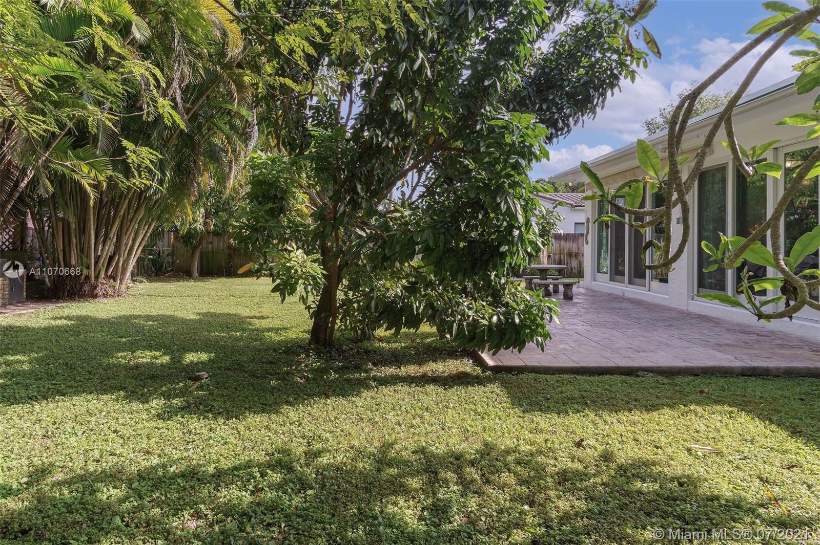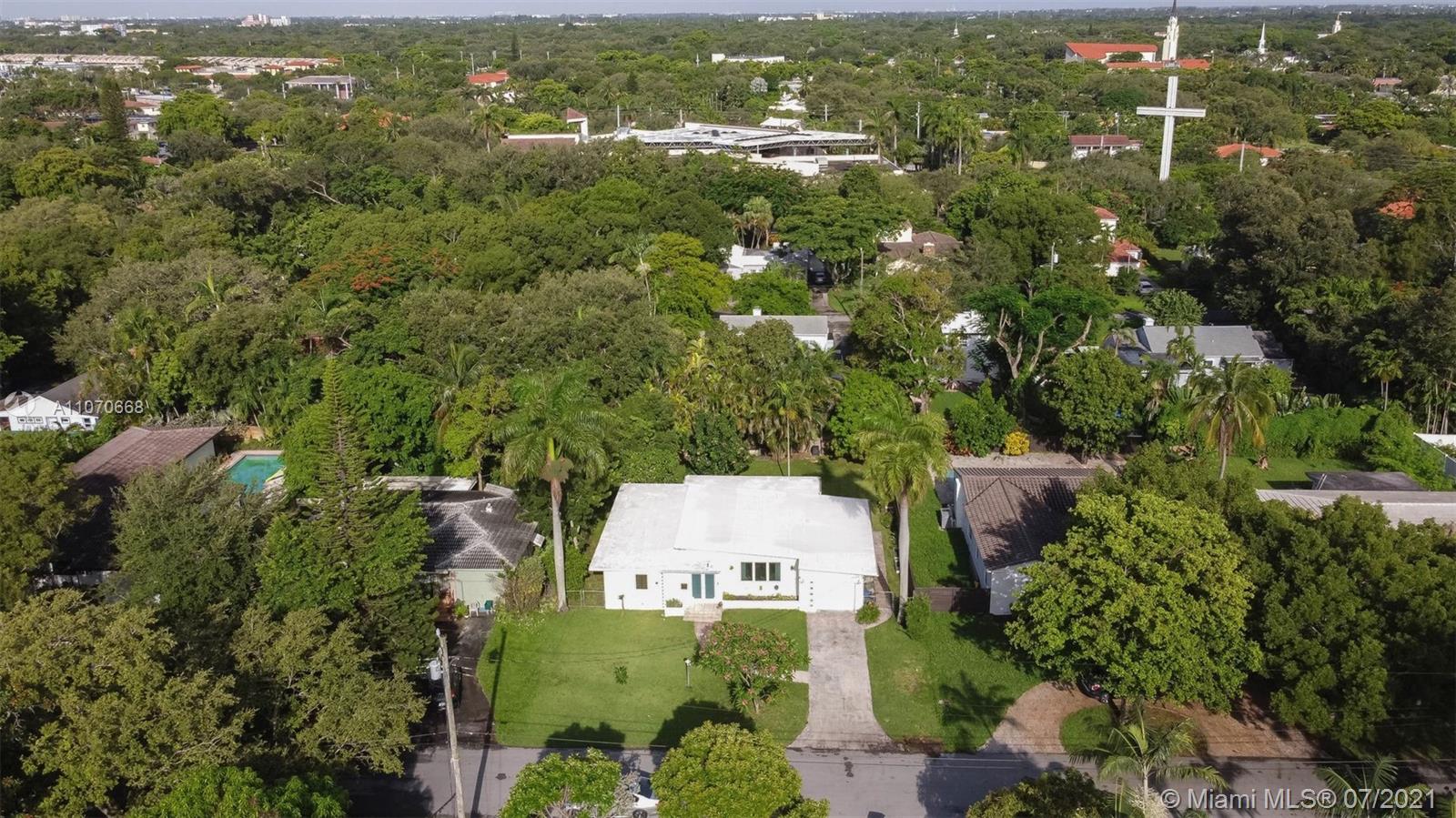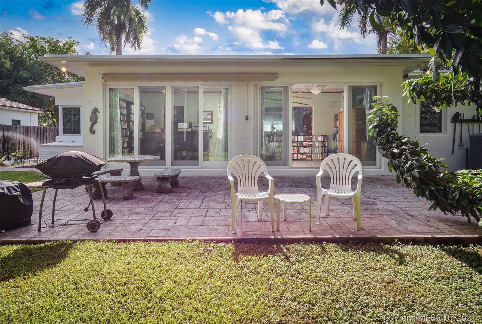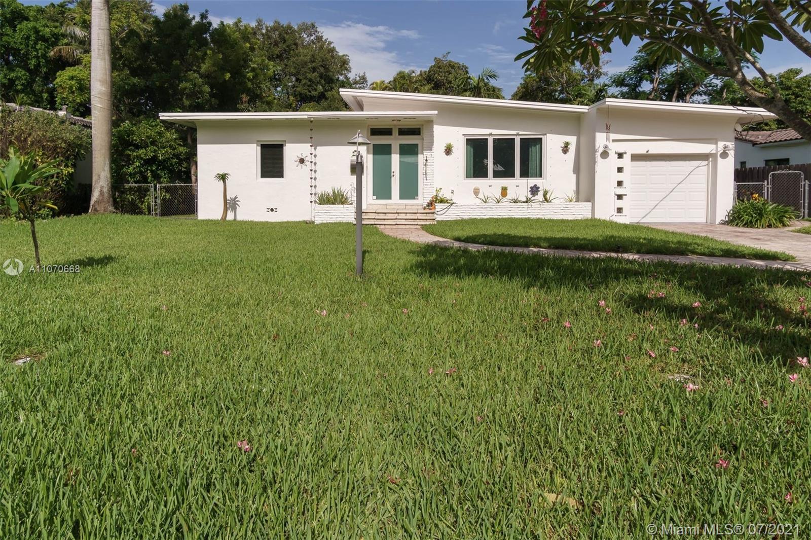 Magical Mid-century modern East of US-1 on a quiet street, Miami Shores. Big fenced/private yard with fruit trees, patio and room for a pool. Attached 1 car garage with laundry and extra storage. Open floor plan with high ceilings, huge living room, great dining area, and awesome Florida/family room overlooking the garden. Amazing natural light. 2 bedrooms and 2 full baths. Large updated eat-in kitchen with granite and stainless steel, ample cabinet and countertop space. Natural gas hooked up to the cook-top, tank-less H2O heater and dryer. Oak and terrazzo floors. Impact windows and doors, sprinkler system and more. A Must See!