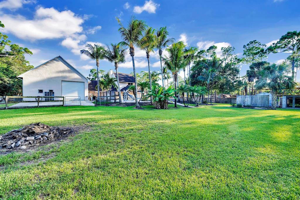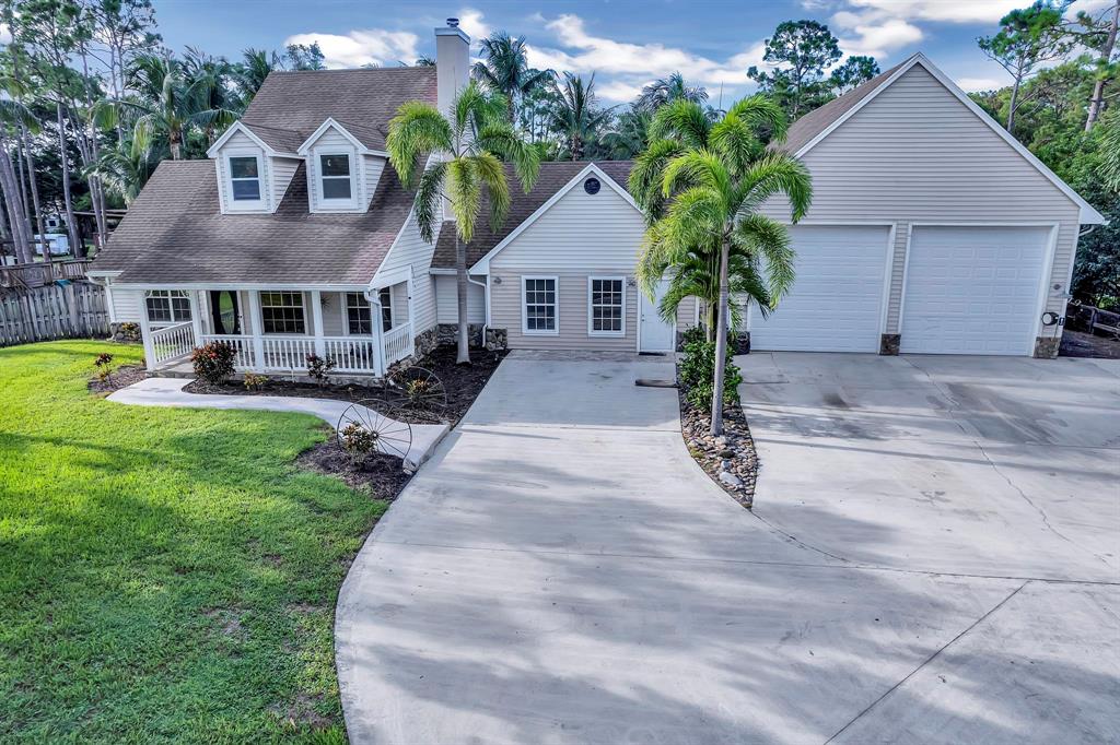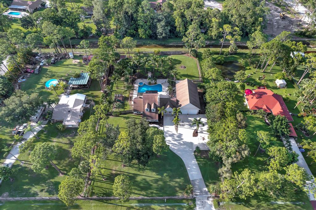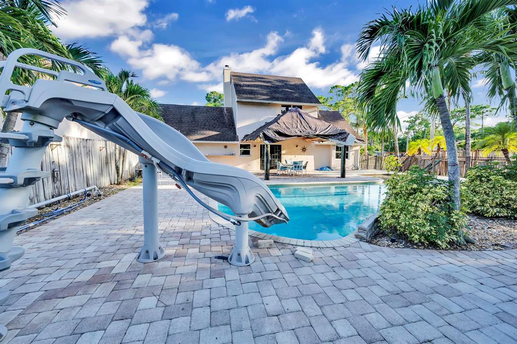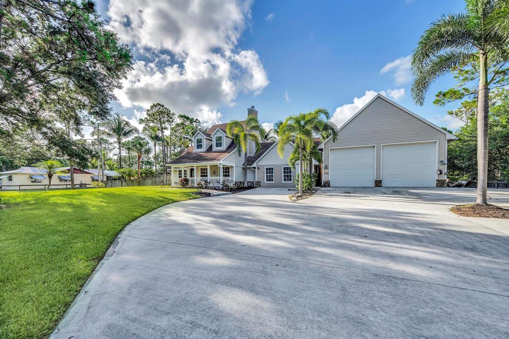Follow your heart & find home at this gorgeous ranch fenced in on 1.25 acre in The Acreage. Fully air conditioned 30 x 50 detached garage w/(3)10' rolling doors, built in workshop w/cabinets, electric, & office loft. Exterior features a resort style 38,000 gallon pool w/shallow wading/sun bathing area, slide, spa (solar panel heated), brick paver patio w/tiki hut, irrigation, playground & two sheds. This 2 story country home kitchen features book matched cherry wood cabinets, granite counter tops w/island w/cooktop, custom breakfast nook table & benches. Downstairs master bedroom & 1 spare w/private entrance, living room w/fireplace & surround sound. Upstairs has 2 bedrooms, 1 of which is an efficiency w/Jack & Jill bath. Spray foam insulation. RV, Boat & parking for all of your toys!