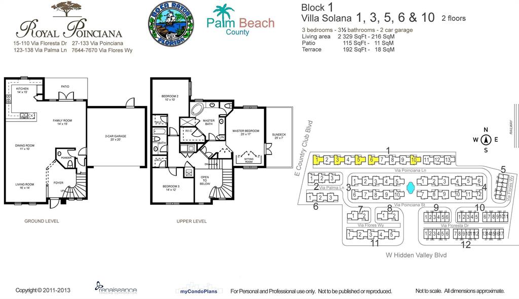 Incredible opportunity to own a rarely available single family town home in Royal Poinciana, an intimate, well-manicured gated boutique community, with a real neighborhood feel, nestled just minutes from downtown Boca Raton, Delray and the beaches. This property is located in an ''A'' school district. Pet-friendly community. This gated community was built by New Century Companies in 2007 and offers the most authentic Spanish Colonial architectural features such as it's historic-inspired pavered brick walkways, driveways, and sidewalks, ''old world'' tile roofs, and Monterrey balconies. The home has a wonderful floor plan! The Casa Solana model is a distinctive 2-story, semi-attached home with 3 bedrooms, 2 full baths, plus powder room with over 2,400 living sqft, along with a full-sized (c