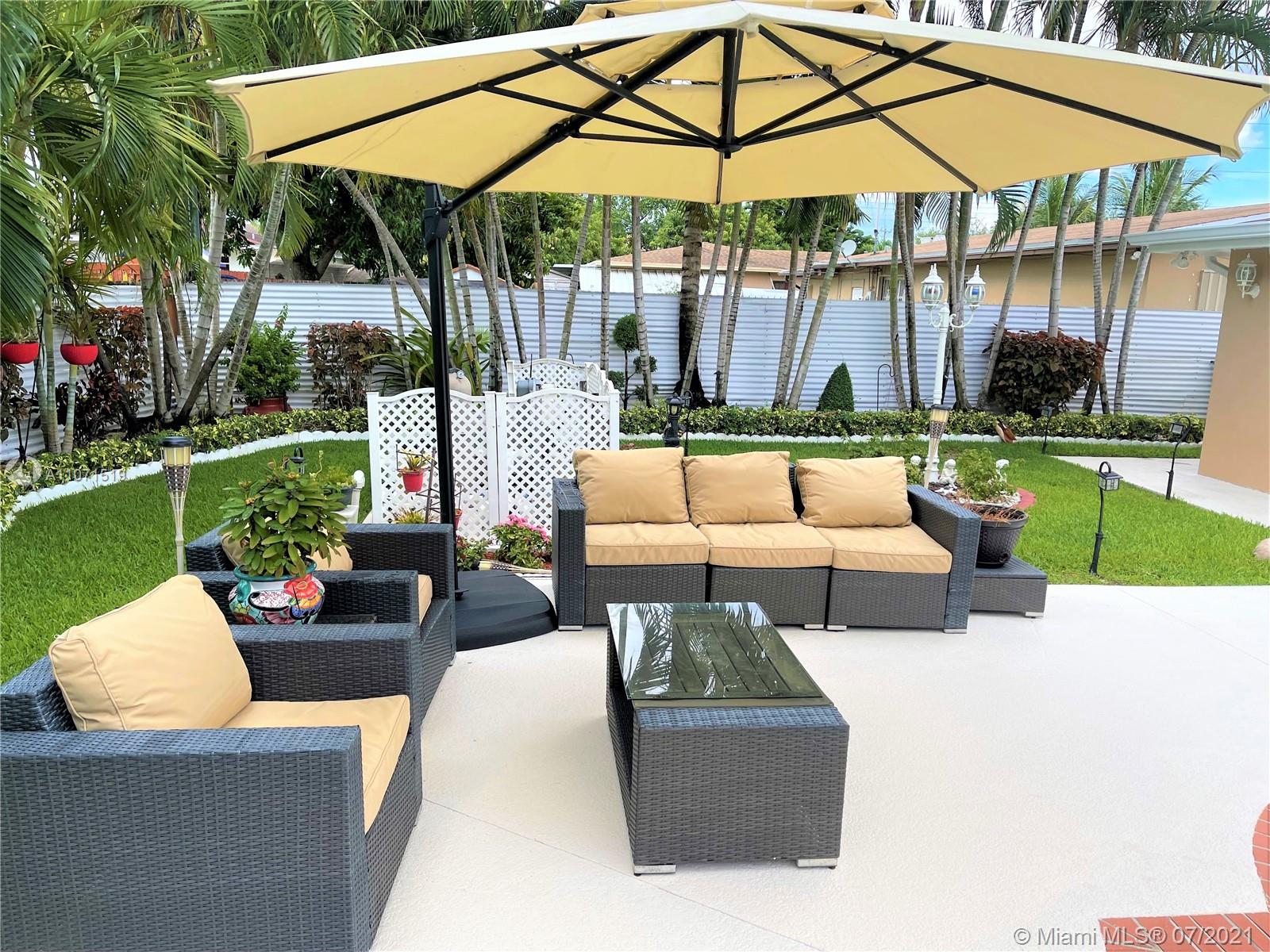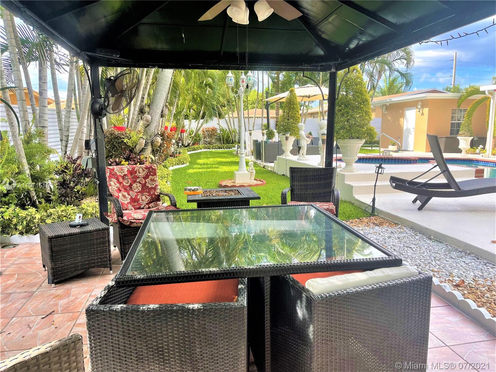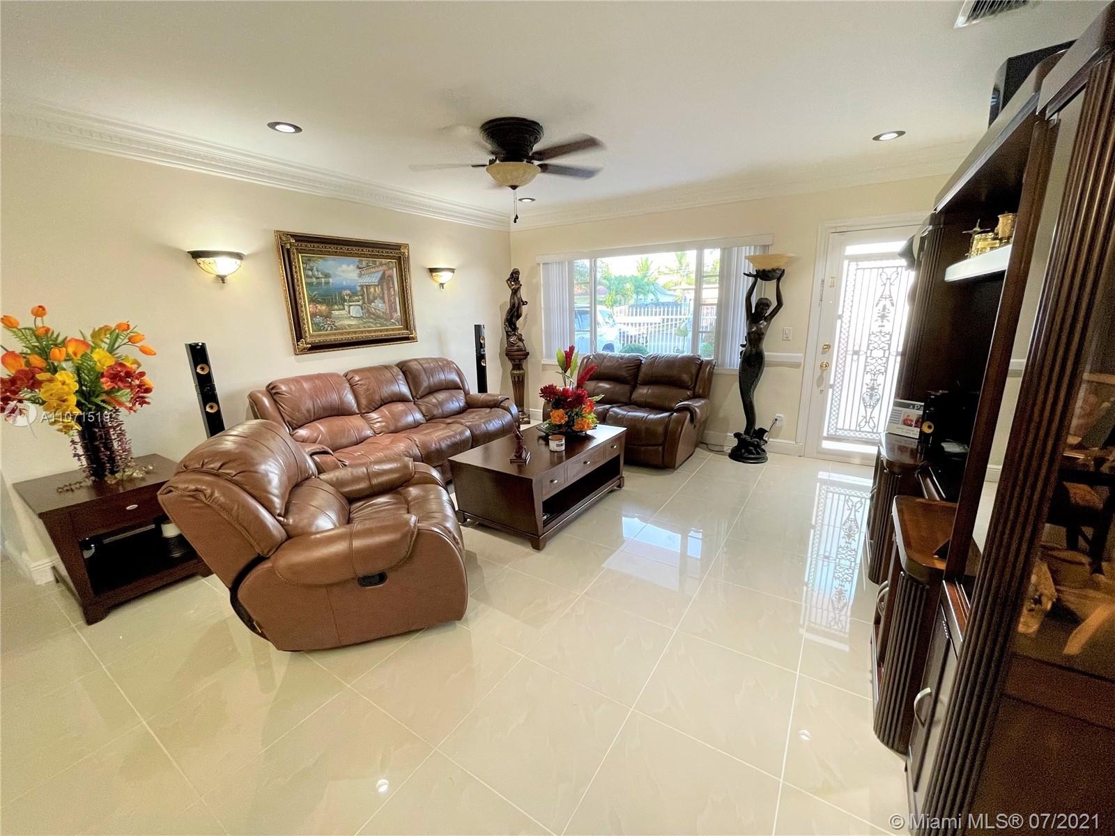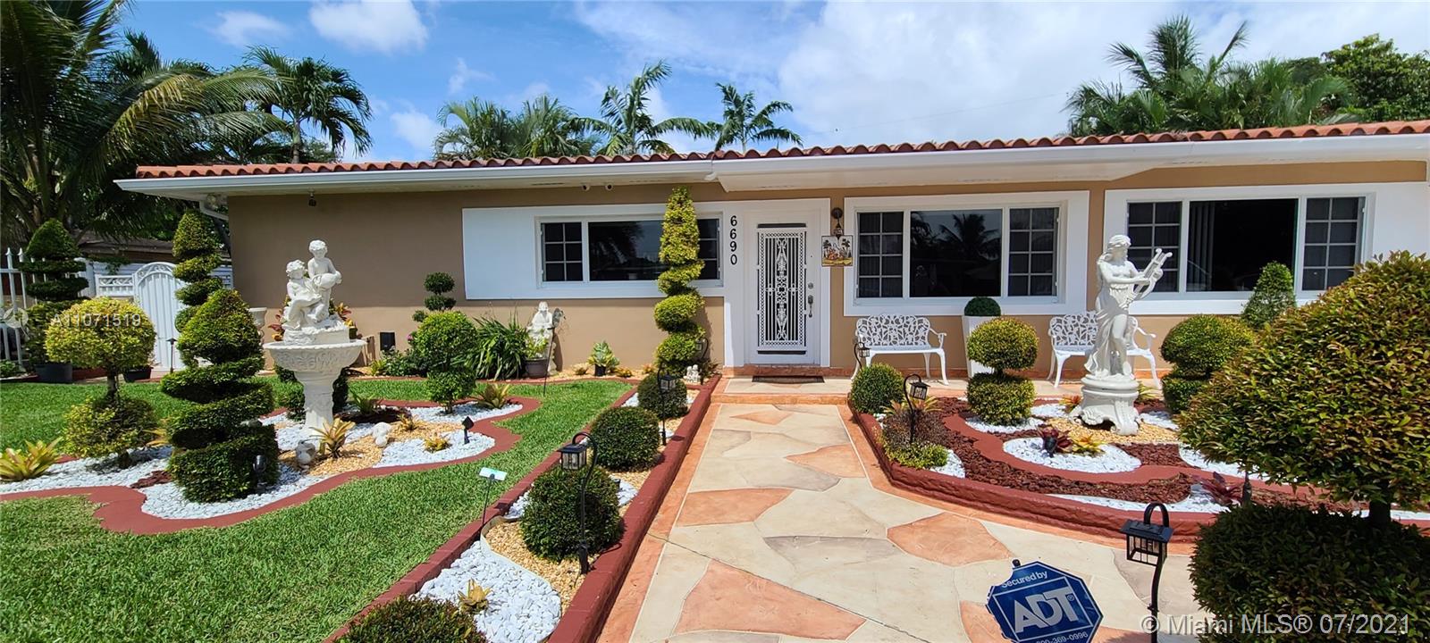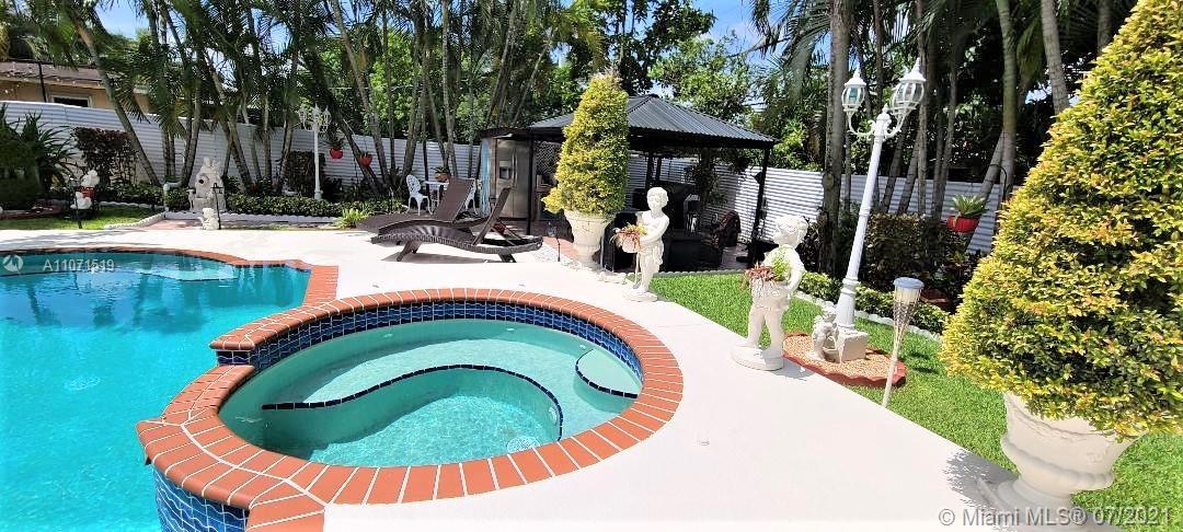 Beautifully updated home in Hialeah's sought out neighborhood of Palm Springs. This home comes with 3 bedrooms and 4 full baths, master bedroom has a huge walk in built in closet. 24inch porcelain tile floors (except for 1 bedroom). Thermofoil kitchen cabinets, granite counter top, SS appliances and a high table knook w/granite top w/built in cabinets. All bathrooms updated with wall to wall tiles and glass doors. Exterior features: iron fence w/electric gate, security system w/ample cameras, impact window/doors (90% of openings), outdoor lighting, lush landscaping w/a variety of tropical plants & garden sculptures, heated salt water pool w/Pool Pilot system, BBQ area w/aluminum gazebo, cabana bathroom with storage space, storage sheds, privacy fencing, FPL underground service + more.