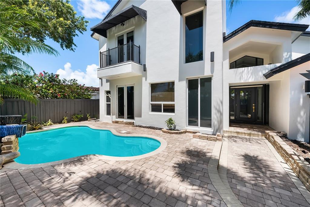 Stunning, professionally designed 3 bedroom 3 bath home with bonus second level large loft perfect for a gym and office. Multiple balconies including spiral staircase to third level rooftop balcony overlooking Fort Lauderdale city skyline. All living quarters are conveniently located on the main entry level and feature large bedrooms, updated baths, and spacious closets. Open living space with engineered hardwood flooring and built-ins throughout. Beautiful white quartz gourmet kitchen, farm sink, white stainless steel appliances and cooking island. Front and outdoor paved entertaining space with free form pool, greenscape and privacy fence! New roof, 2021. Impact windows. Two ACs, 2019. 2 car garage.
