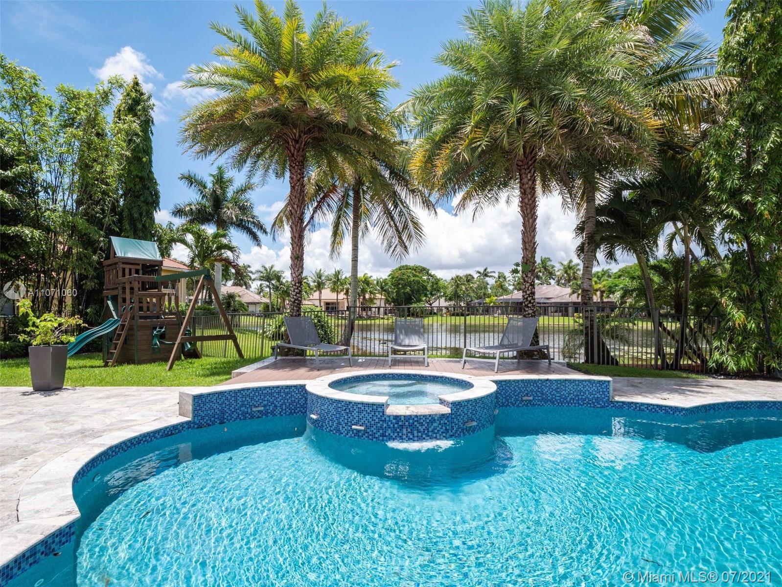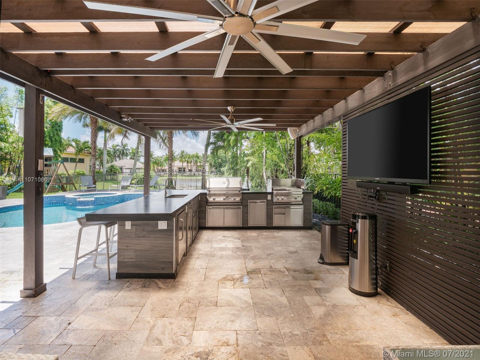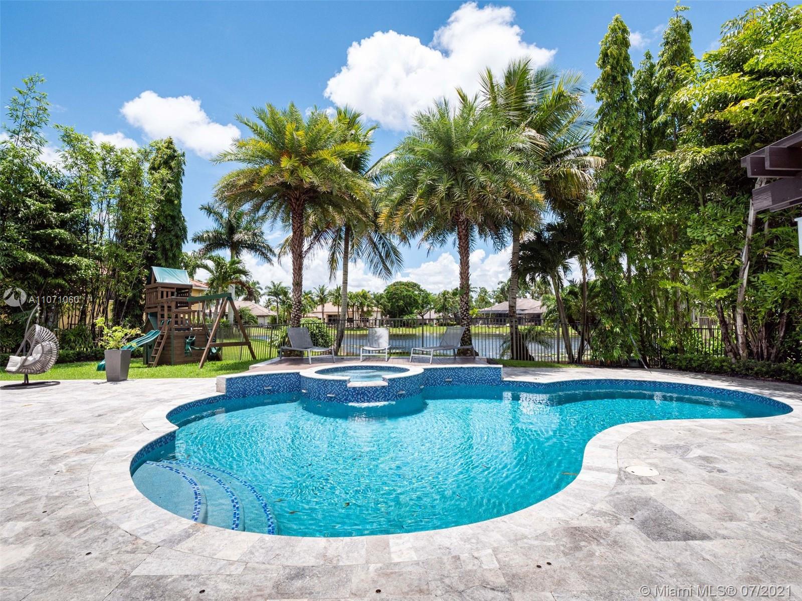 This Smart Home Is Immaculate and Fully Remodeled. Sound System, Cameras and Speakers by SONOS in The Entire Home. Featuring 5 BR/5.5 BA/Office/Gym/Sauna. Perfectly Set on a 1/2+ acres lot. Designer Bathrooms, Top-of-the-line GD Italian Kitchen, MIELE Appliances. Marble Floors, Smooth finish walls, Dry Wall Ceiling Designs with LED Lighting. Custom Closets, Cabinetry and Italian Doors. High-End Motorized Window Treatments. New Fast-Speed Pool Heater Pump, 4 AC units, Double-Pane Impact Windows & Central Vacuum are Some of The Features. Enjoy The Fully Fenced Backyard Perfect for Kids (Playground) & Pets. A Unique Outdoor Living Space With A Custom Designed Wood Pergola Fully Equipped (TV & Appliances). A 3-Car Garage with Cabinets/Storage. Stop by this Majestic Porte-Cochere and Come in!