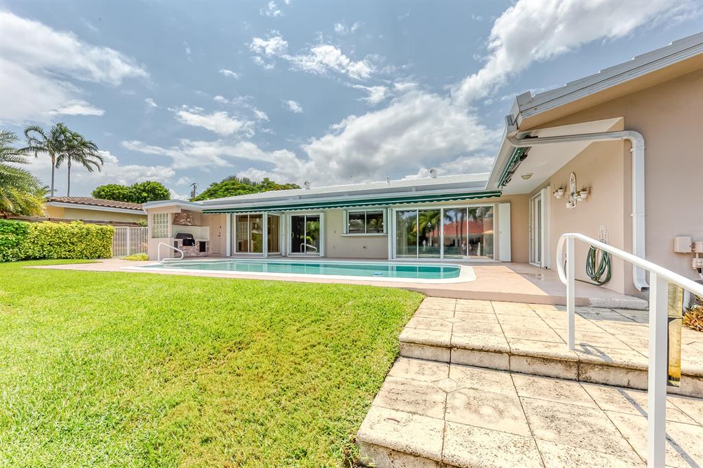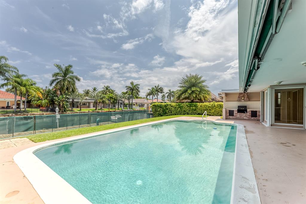 4 Bed/3 bath with an extra rm for an office. 4 Bedrm being used as a den. Newer kitchen, master bath & full cabana bath. Crown molding. Large kitchen w/ light wood cabinets, tile counter tops, Hi Hats, knockdown ceilings & breakfast table. Travertine Flrs. Kitchen has a great view of the pool & water w/ a pass through to outside counter. Accordion shutters & impact doors. Walk in closets. Formal dinning area. Huge circular driveway with pavers. 85 feet water frontage, 48 ft dock w/ electric & plumbing. Protective see thru fence on the seawall for your children an pets & seawall footer was added in 2020. A/C is 2020 and water heater 2013. Covered patio w/ electric retractable awning for more shade over the pool. Inside laundry rm. 35 ft boats no problem. This house has been well maintained