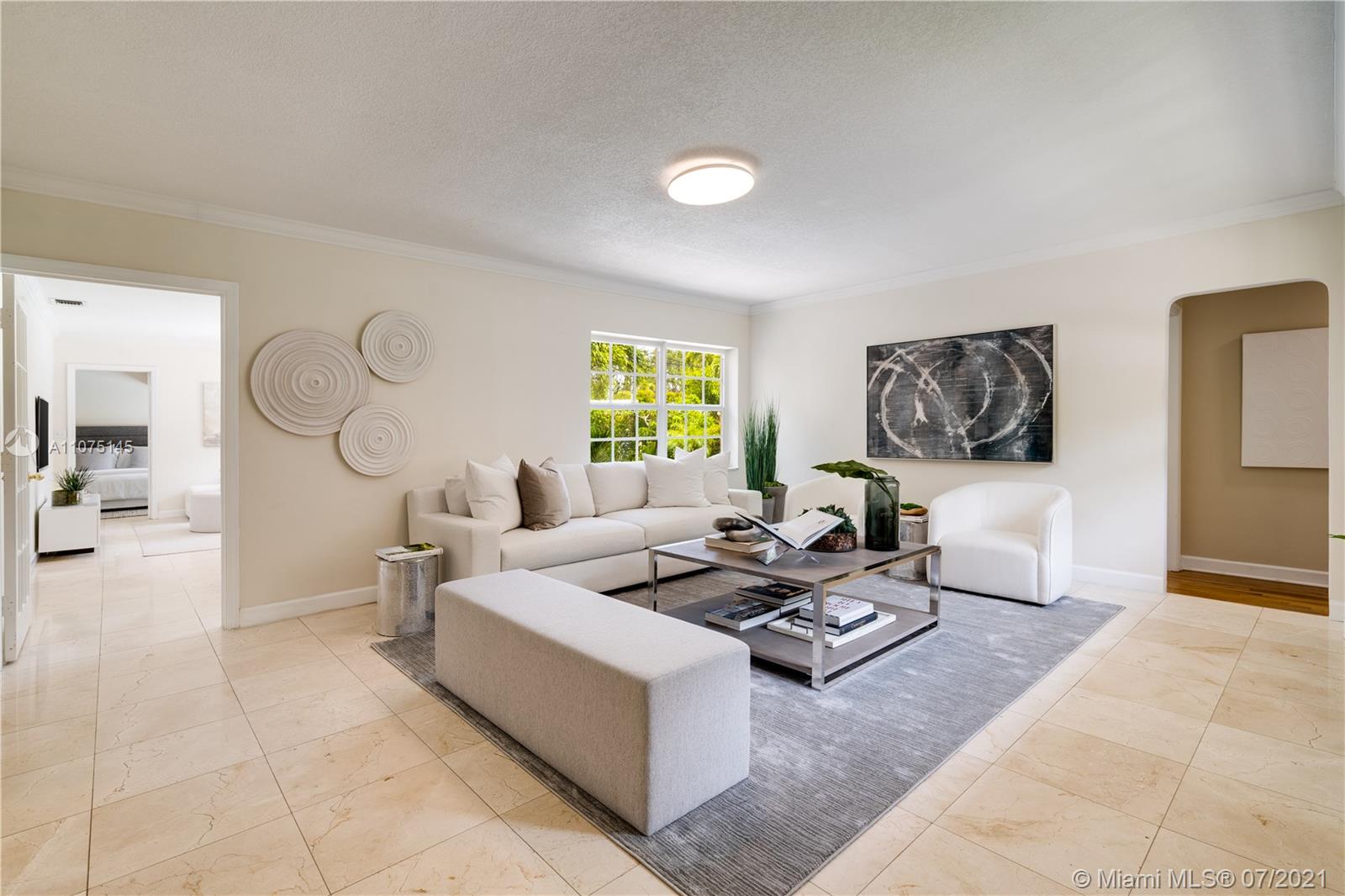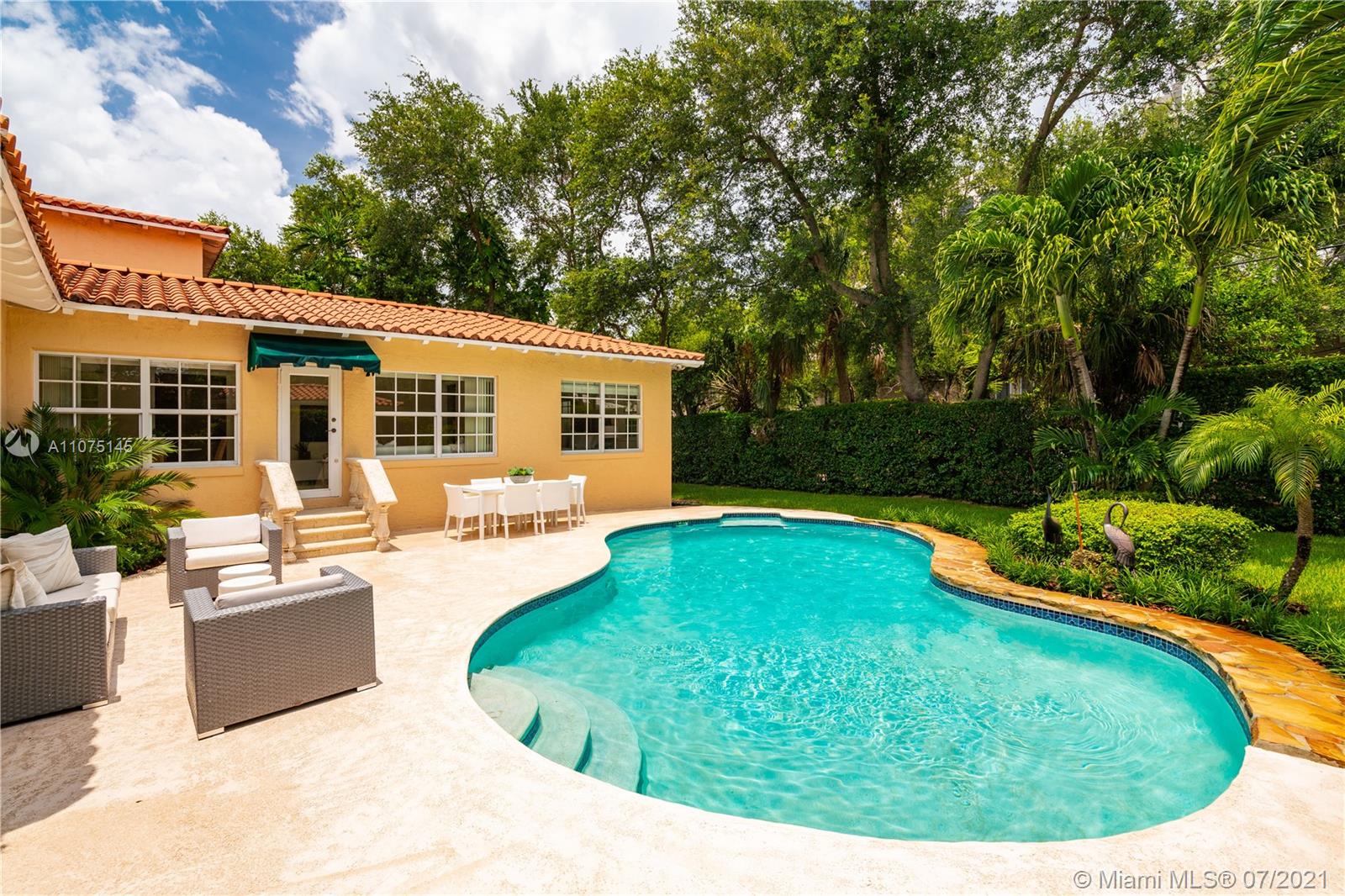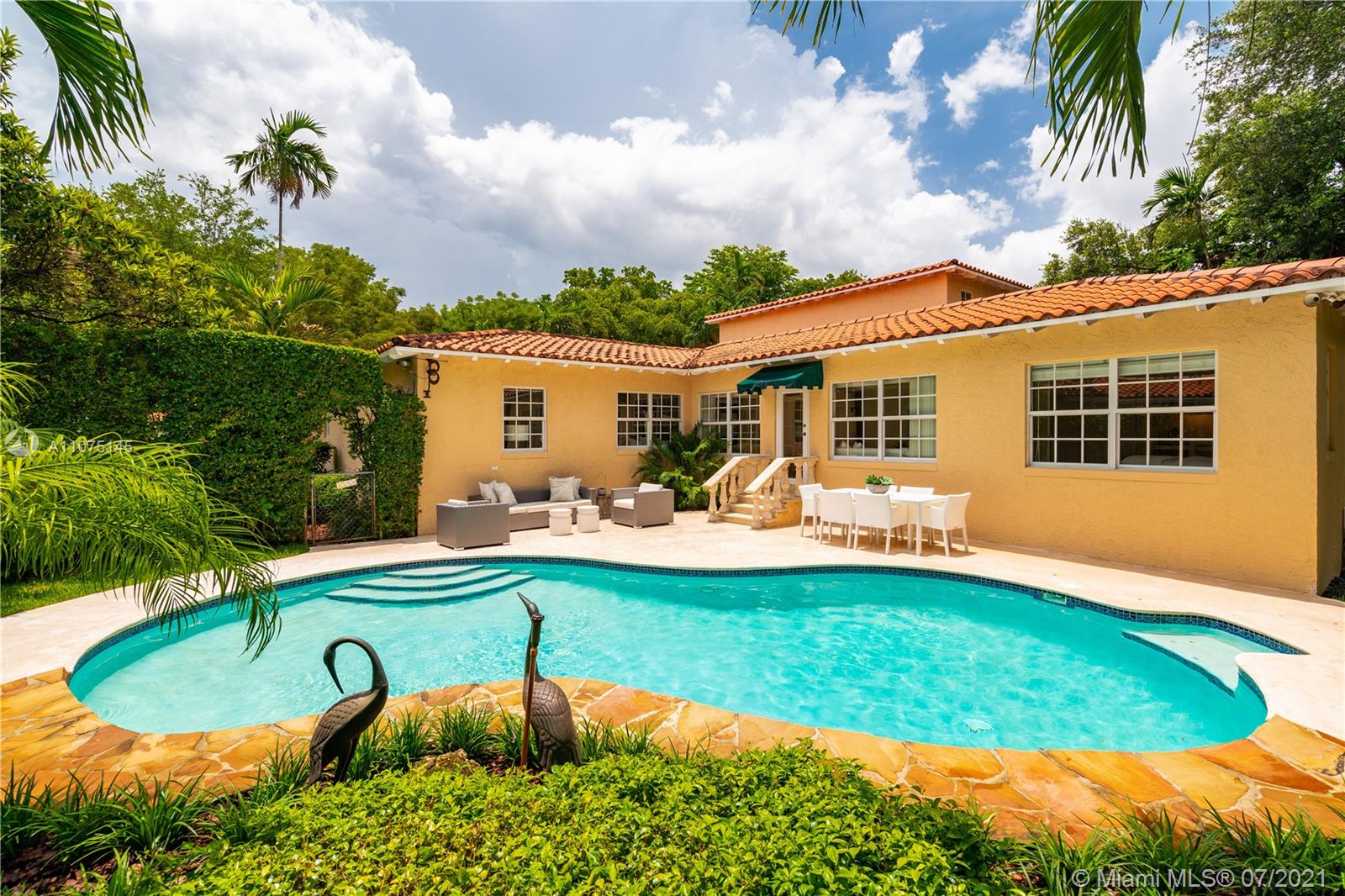 Urban living with the benefits of suburban space! Less than a 1/4 mile from Miracle Mile & all its restaurants & shops, lies this beautifully maintained & updated Coral Gables home on a 12,000 sf lot. Elegant brick circular driveway & front porch invite you in. A true split floor plan, there is an upstairs private primary suite w/free-flowing natural light, 2 walk-in closets, & a jacuzzi tub. There is a second en-suite bed/bathroom downstairs. Another 2/1 bedroom wing has original hardwood floors & plenty of windows for your vitamin D fix! There are family & living rooms w/impact doors/windows overlooking sizable yard w/free-form pool & deck. Spacious 2 car garage w/plenty of storage, & interior laundry. Lovingly cared for home ready for new family to make memories! A Very Special Home.