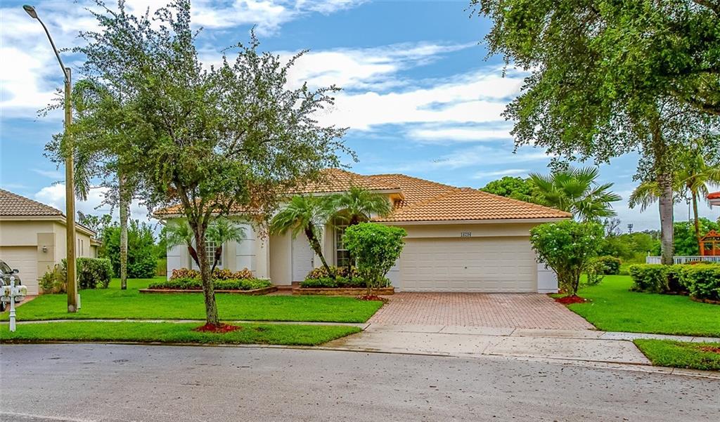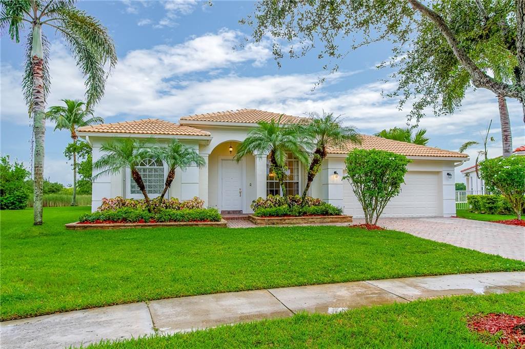 Beautiful 4 Bedroom 3 Bath Home with breathtaking water views, open floor plan with tile throughout. New Granite Countertops installed in 2021, the Refrigerator, oven, microwave and dishwasher are also brand new, never used, and still have the original manufactures wrappers on them. The washer, dryer, and hot water heater were replaced in 2021 and the vanities in both bedroom bathrooms remodeled in 2021. A/C Replaced in 2018. Accordion Hurricane Shutters on all windows. Great Community with fabulous clubhouse, pool, tennis exercise room and more. Entire home freshly painted and all tile including baths professionally cleaned and grouted. Backyard has three very productive and highly desirable mango trees (Alphonso, Beverly, and Mallika varieties). Don't miss this great house!