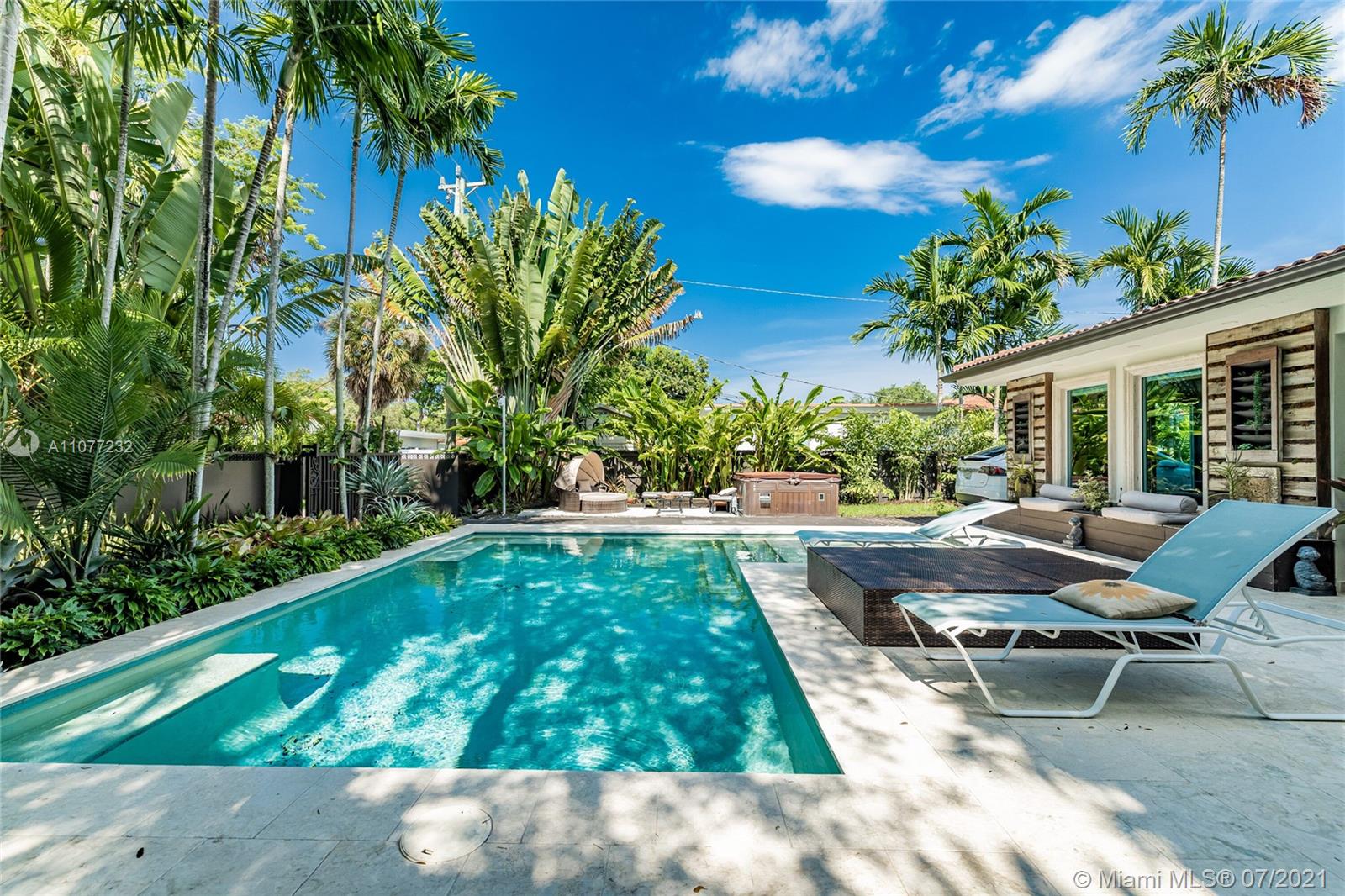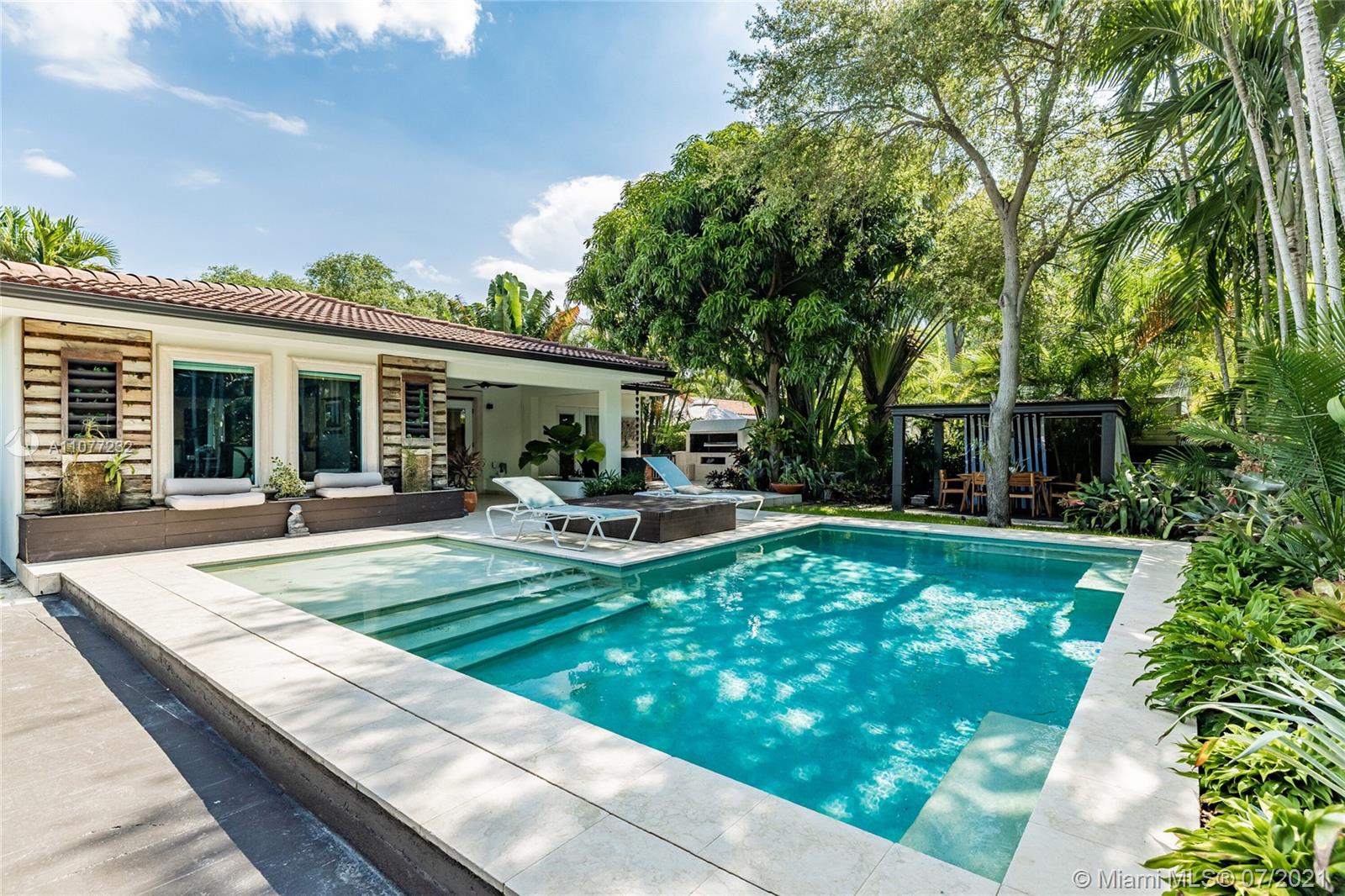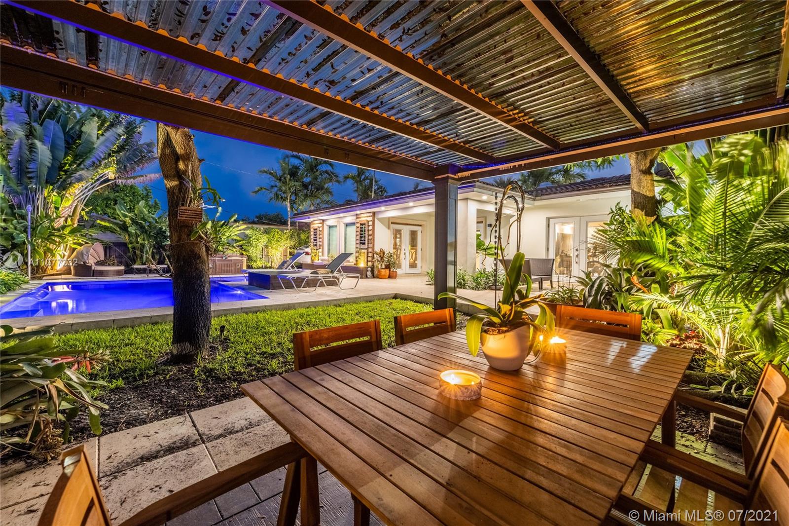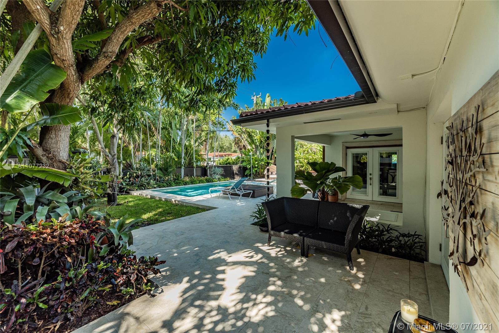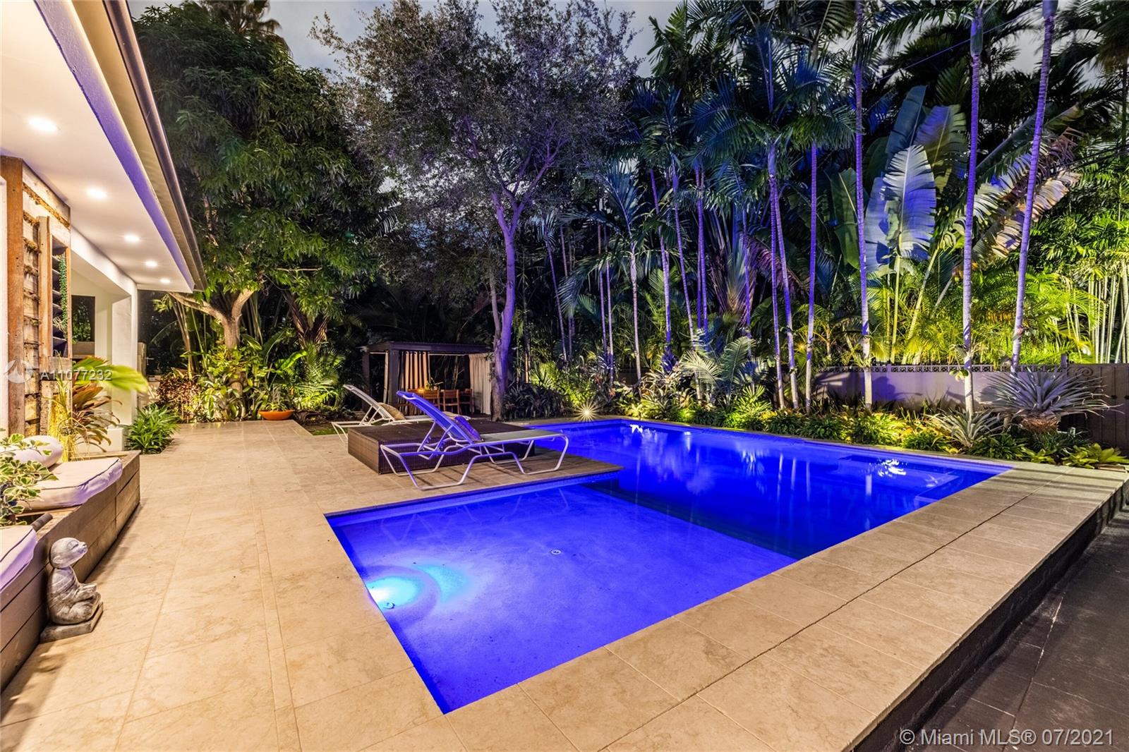 Welcome to Moondance! Awaken your inner zen in this updated spacious modern home—a tranquil retreat and entertainer’s delight, with amazing lush gardens, spectacular waterfall pool, hot tub, veranda, custom marble deck and grill. Inside, enjoy expansive triple-stacked open flow living and dining with huge media room. Home chefs will love the updated eat-in oversized kitchen. Four split bedrooms for extra privacy with triple en-suites, including one with its own fireplace and French doors opening to the pool deck—perfect for slipping out on a marvelous night for a moondance! Great features: modern baths, new AC, impact windows-doors, new gutters, electronic blinds, sprinkler system and outdoor lighting to illuminate the spectacular selection of orchids, bromeliads and other tropical plants.