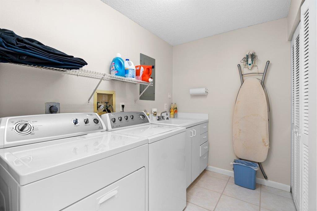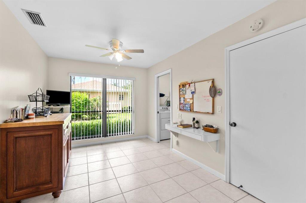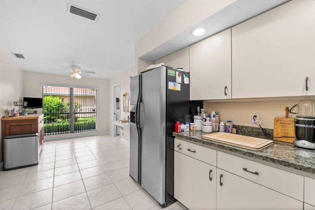 Abundantly spacious 2/2 on quiet cul-de-sac featuring eat-in kitchen with granite counter tops and SS appliances, large living room that opens up to the attached FL room, two car garage just off the interior utility laundry room featuring storage cabinets and closet as well as utility sink, additional bonus workshop with it's own A/C and golf cart entrance, and screen-enclosed patio with green views of the backyard and plenty of room for a pool. The master suite offers two walk-in closets, attached sitting room with access to the patio, ceramic wood plank tile, dual sinks, and glass enclosed shower. The second bedroom offers an ample walk-in closet and ceramic wood plank tile next door to the second full bathroom with bathtub/shower combo.