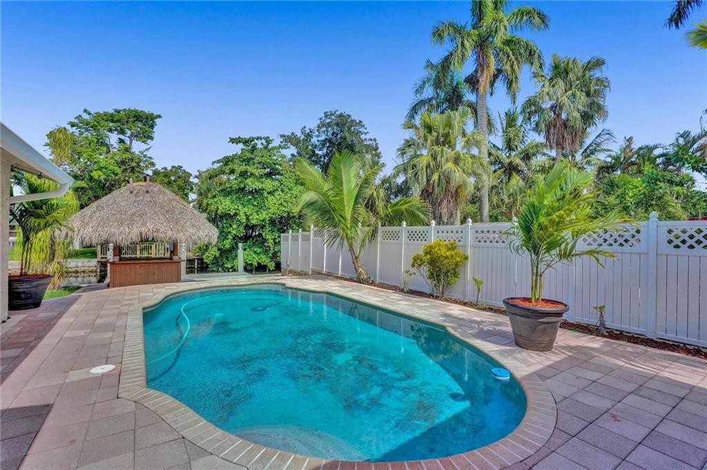 This home truly checks all the boxes. 3 bedroom with lots of windows and good size closets.* 2 baths. Pool with child fence*, paved patio* and Tiki Hut where you can serve up your fav beverages or dine by the water. Waterfront has one fixed bridge approx. 8-9 ft. Plus boatlift just under or at 4,000 lb. New dock trekking*/electricity. Sea wall was inspected 2 years ago Tropical foliage* Large storage unit* Two side yards and expansive front yard. Lots of parking with a 2 car garage* and 4 extra spots on paved drive way. 2014 AC . Tankless water heater, roof is 10 years old. Wiring in place for surround sound and speakers inside and out. Entire interior has just been painted!!Please note ...Check all measurements at your own accord.