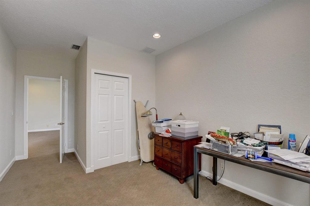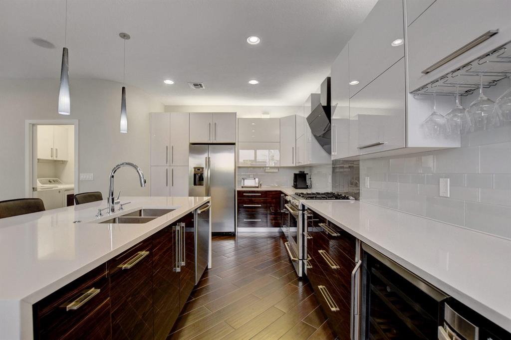 Remodeled & fresh, new double glass doors open into this 2-story home of 5 bedrooms & 4 baths -- open & light featuring volume ceilings with speakers; wood-grain porcelain tile floors with new baseboards & upgraded carpeting; a remodeled kitchen in contemporary style with dark tigerwood & high-gloss white 42'' cabinetry, silestone countertops, glass backsplash & stainless steel appliances; upgraded contemporary powder room; upgraded laundry room with new cabinetry, washer & dryer; extra high-hat lighting, custom light fixtures & ceiling fans; custom window blinds; extra garage cabinetry plus more! Most remodeling was completed 4-5 years; water heater - 2019,refrigerator - 2019. The outdoor space includes screened & open patio areas with Saturnia marble pavers.Ready to just move into!