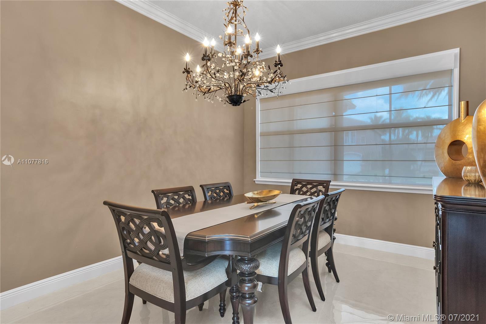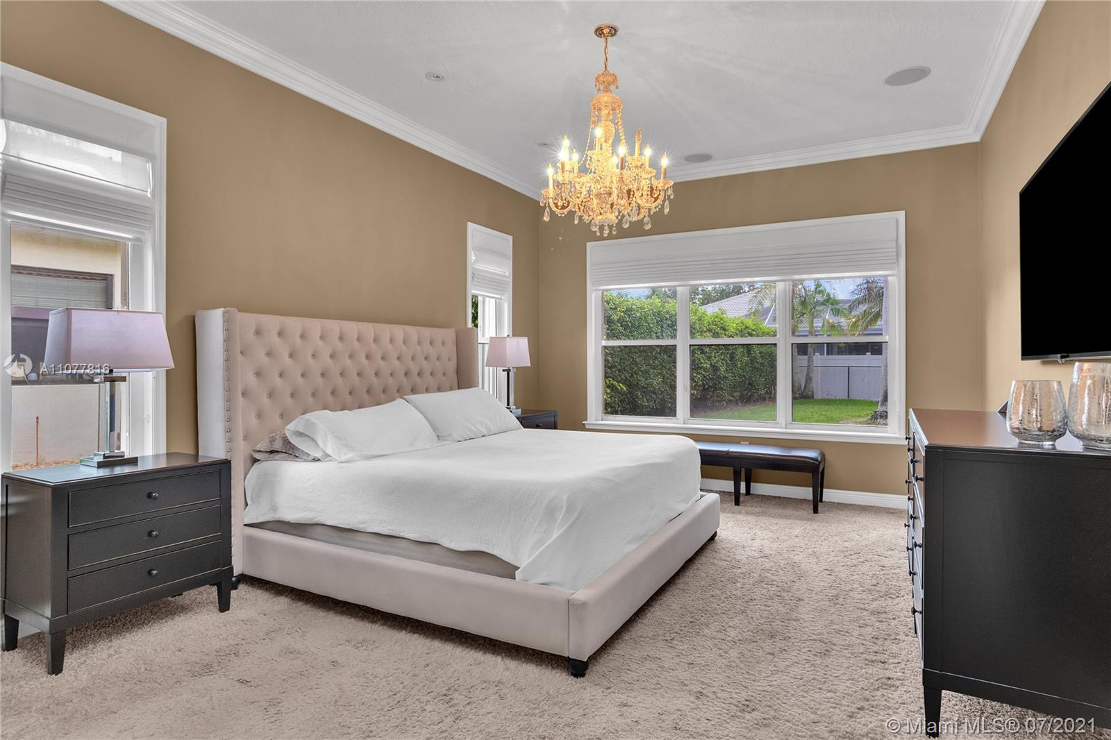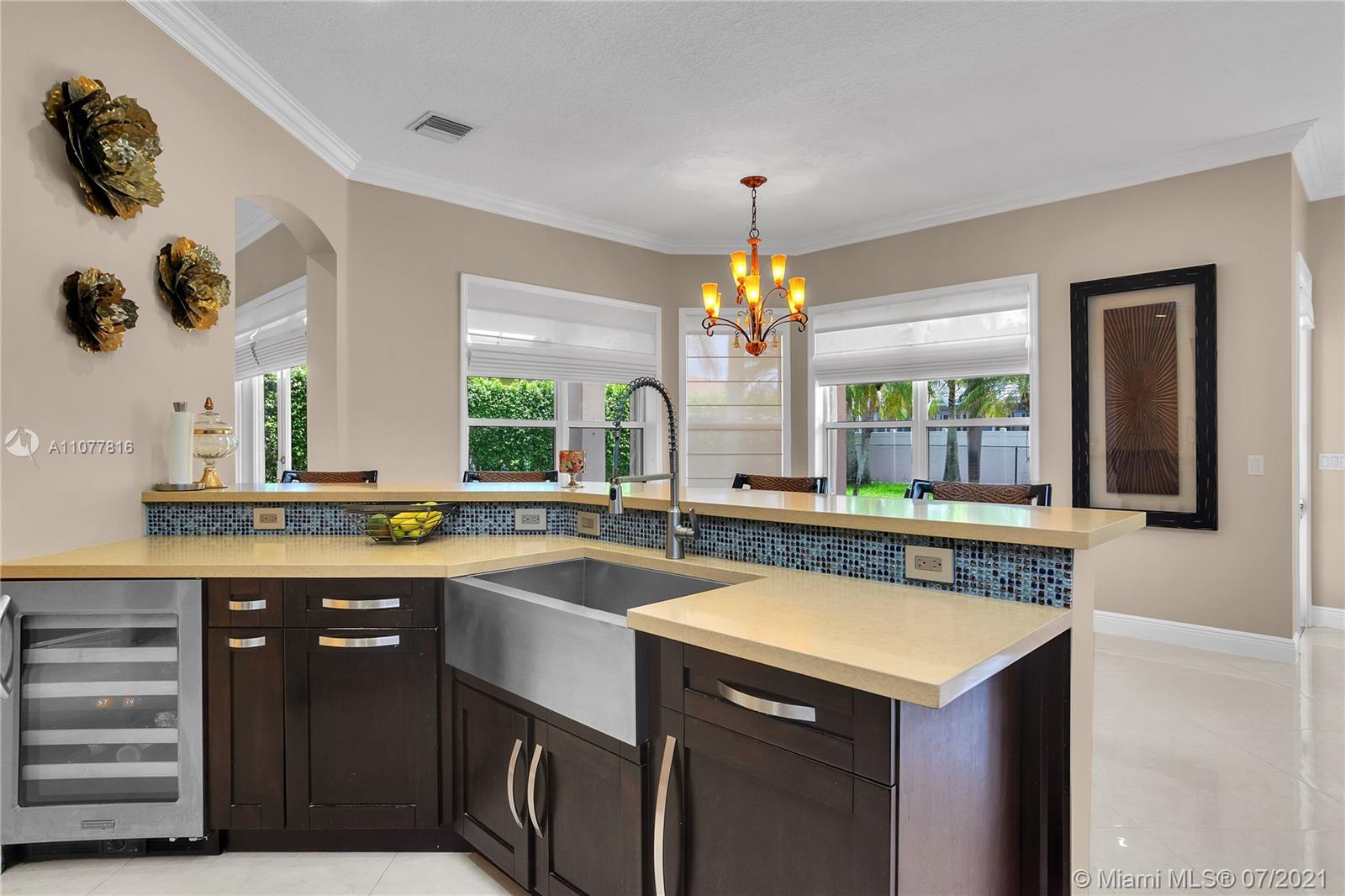 HERE IS THE PERFECT HOME waiting for you! nSingle Story house, gated community, upgraded kitchen espresso cabinets with quartz countertop, Kitchen aid stainless steel appliances, 4 door refrigerator, range hood, microwave, glass cooktop oven, wine cooler, gorgeous accent backsplash, walk-in pantry. Enjoy the spacious living room, dining room, and family room and connect through the covered patio and pool area. 3 car garage dress with Poxy flooring and Cabinets to storage, cameras, accordion shutters, UNIQUE lighting fixtures from Farrey's and ZGallerie all included. Crown molding covering every corner, and a lot more details to appreciate it every day. Large Master bedroom, bathroom with Jacuzzi Tub, 2 walk-in closets, marble floor, and unique details inside the shower. (NO Dishwasher)