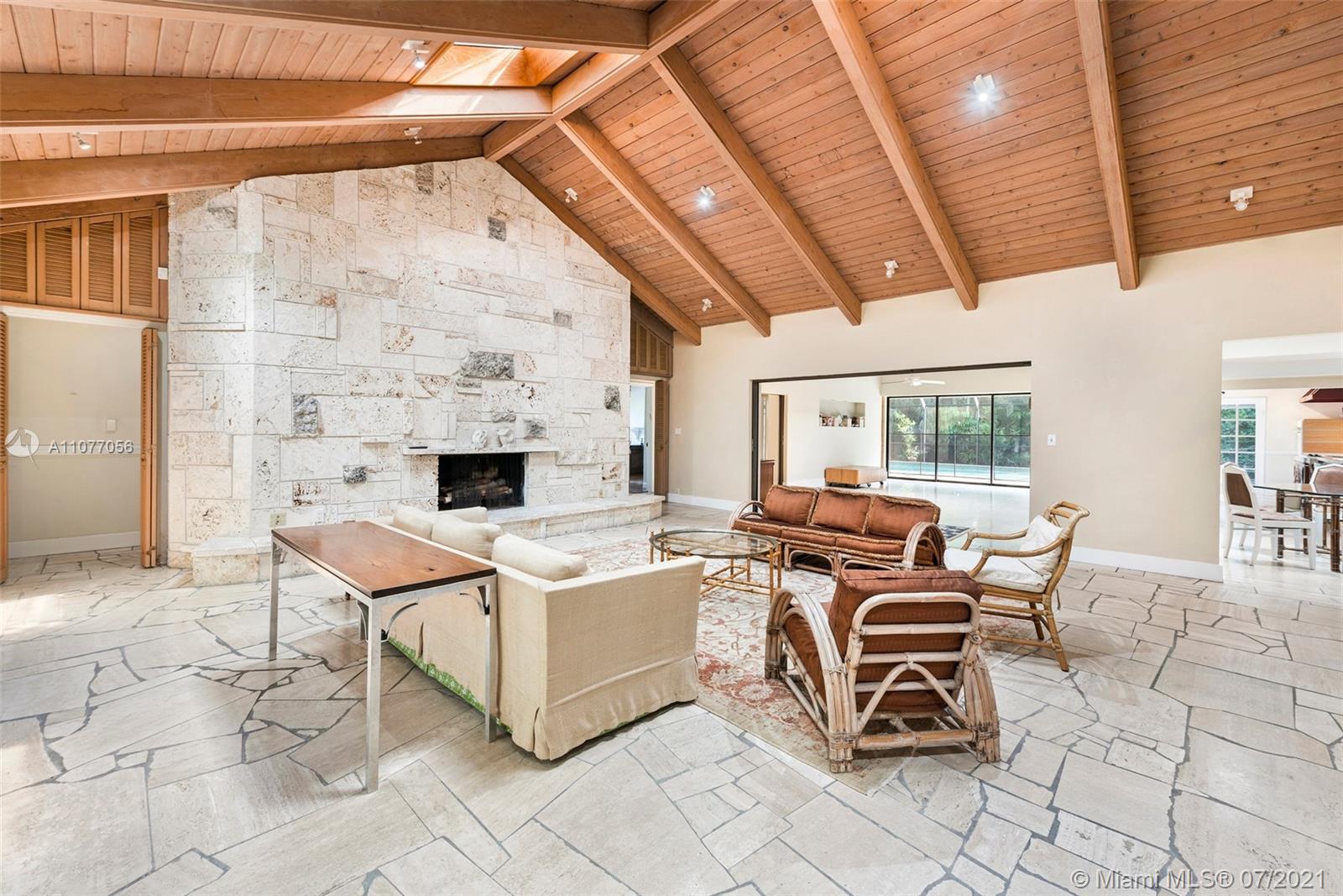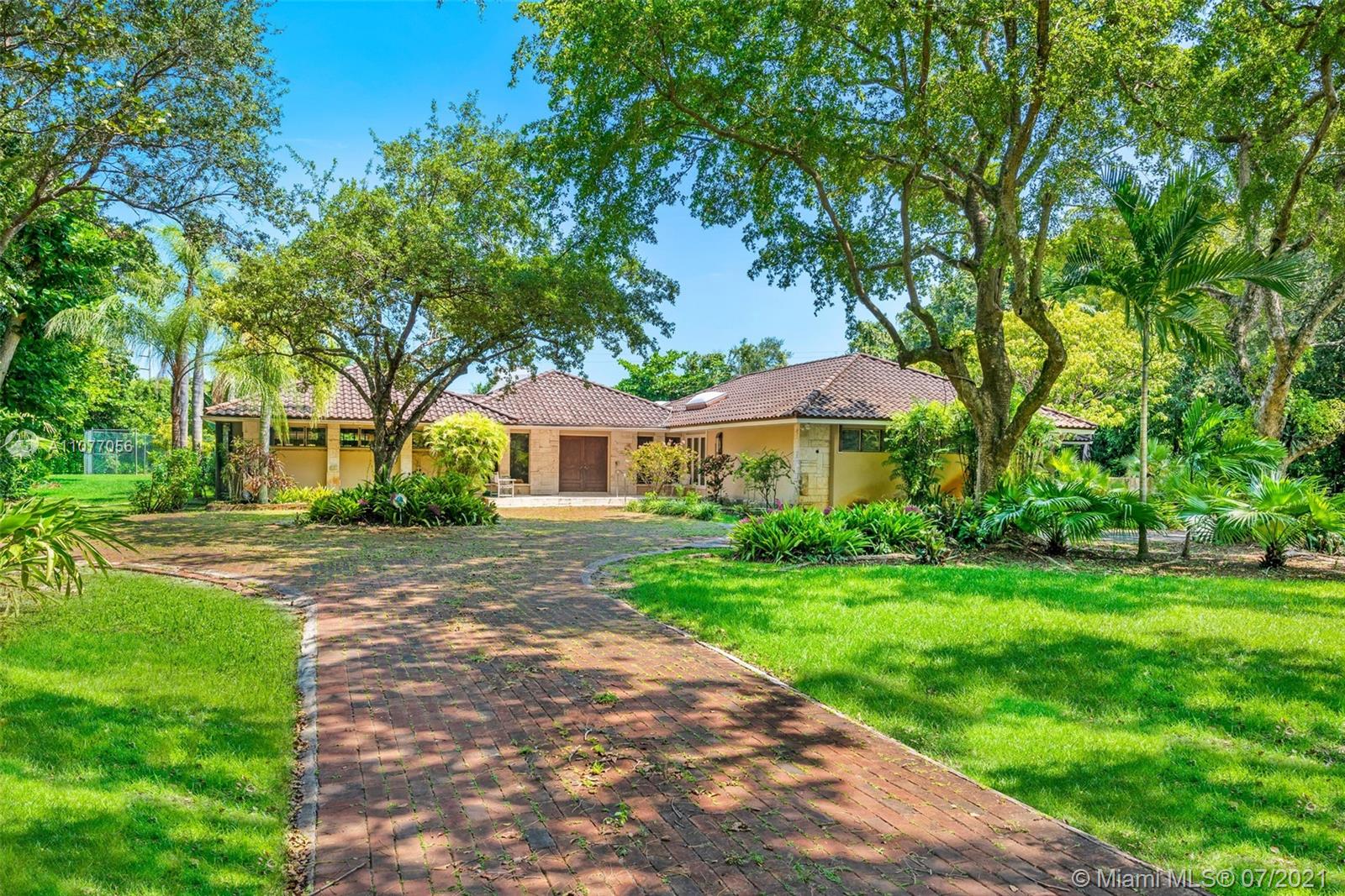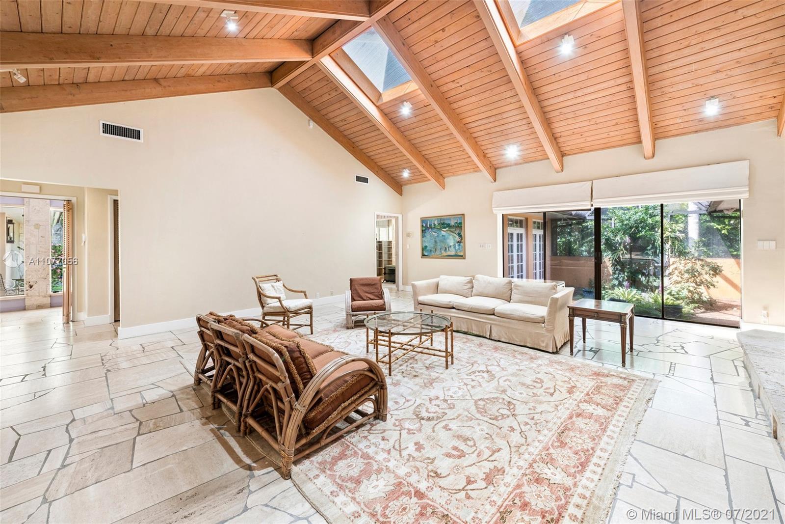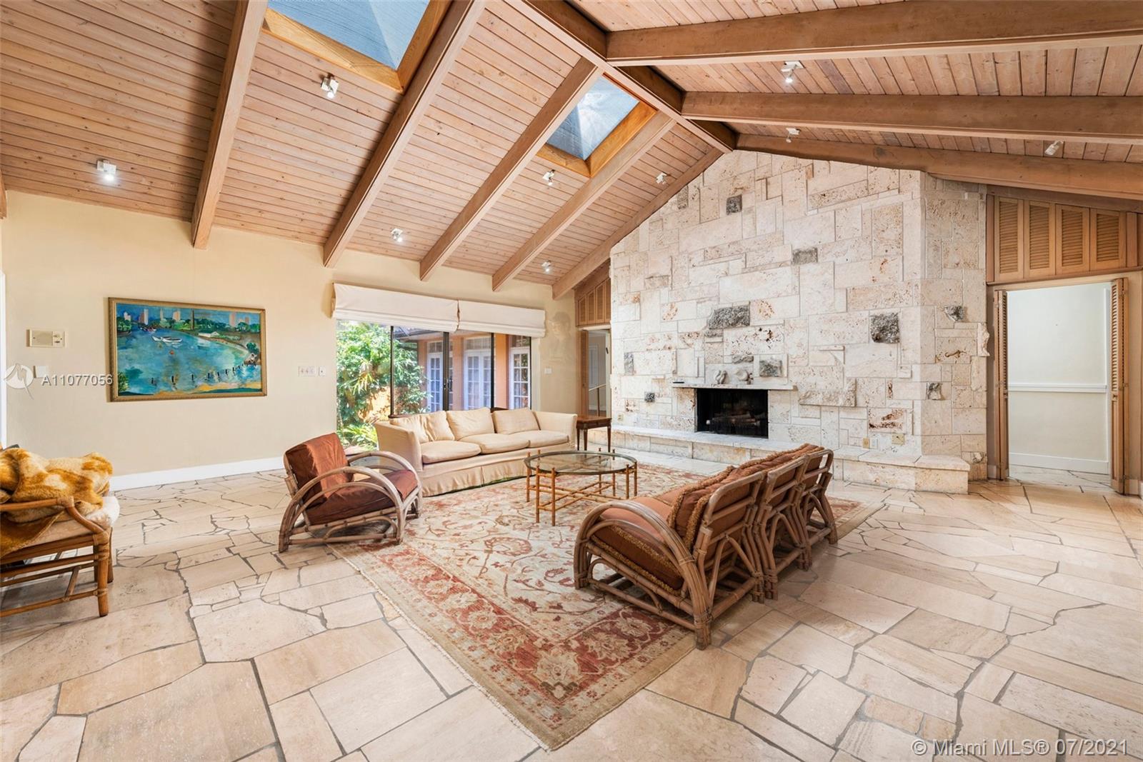 A wonderful home on one of the most beautiful streets of Pinecrest is on the market for the very first time since it was constructed. The home was built like a fortress and is ready for a fantastic upgrade. Beautiful natural light pours into the home throughout its ceiling skylights found all around the home. The grand primary suite features an impressive double-height fireplace, vaulted ceilings, a romantic wall of French doors leading to a courtyard with greenery, oversized master bath and WI closets. Marble stone flooring and cathedral wood ceilings add a timeless elegance. There is also a library, Florida room, sun room, formal dining and living, tennis court and a gorgeous sunny screened pool deck. Wonderful lush grounds. Laundry and staff quarters. Newer AC system and roof.