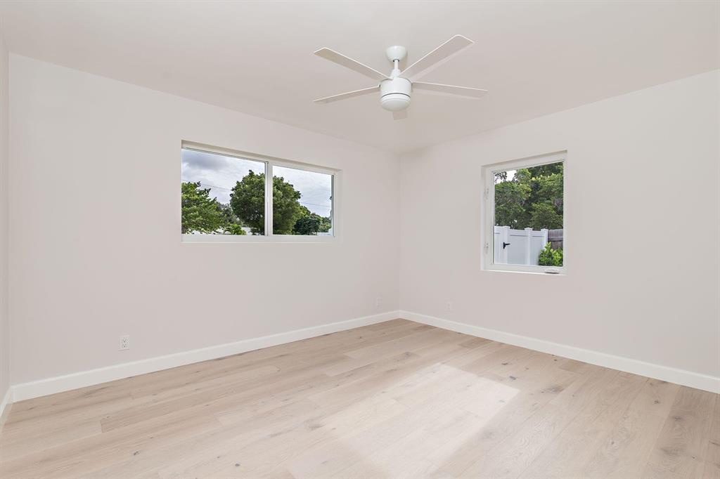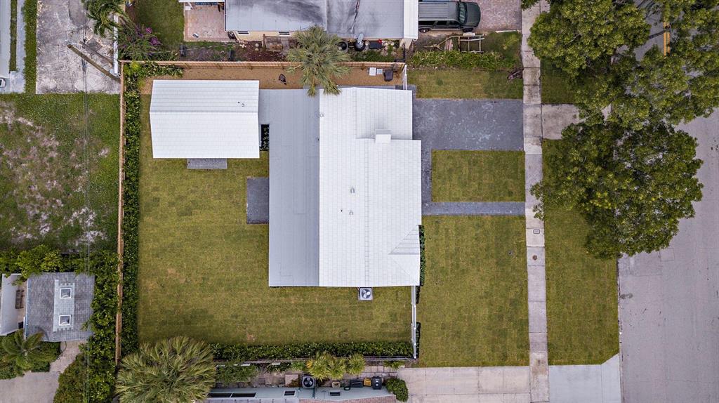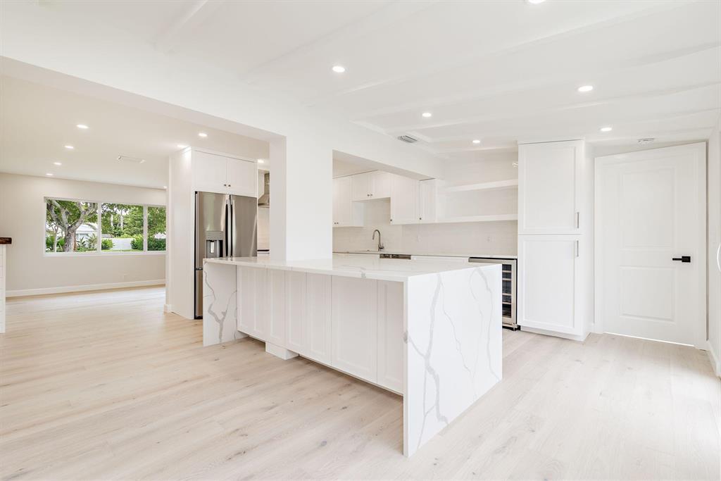 Freshly renovated featuring wide plank French oak floors throughout and dramatic beamed ceilings, this 3 bedroom home plus den is move-in ready. Wrapped in windows this home offers light filled spaces and a stream lined design esthetic. The kitchen is a dream, boasting quartz counter tops, custom cabinetry, stainless steel appliances and a wine refrigerator. This concrete block home has a brand new 2021 roof, full hurricane impact windows and doors and a one car garage. Additional features include new HVAC, marble bathrooms, custom closet systems and expansive green space with room for a generous pool. East of S. Olive Ave