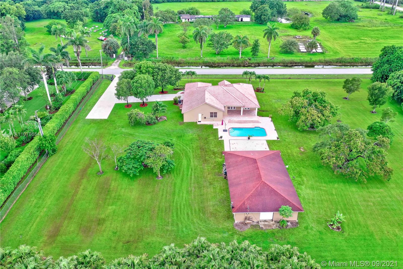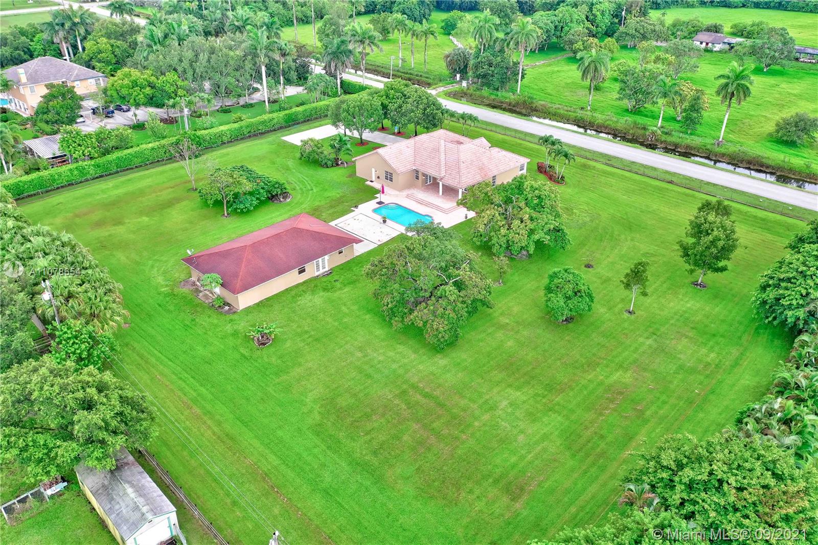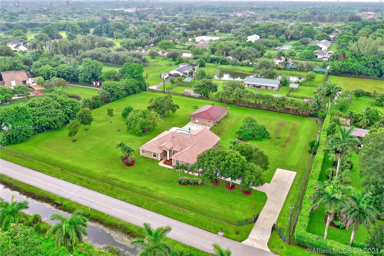 Amazing one-story pool home with a separate guest house! Rare find in sought-after Southwest Ranches, close to Miami/Ft Lauderdale. It offers 5 bedrooms, 3.5 baths, 3063 sf. A separate Guest House with 1155 sf features 2 bedrooms, 1 bath, eat-in kitchen, living room. All this nestled in the equestrian neighborhood of Sunshine Ranches. Custom-built in 2006 on 2.2 acres. This elegant estate includes an expansive floor plan, wonderful natural light, granite countertops, wood cabinets, stainless steel appliances. Primary bedroom suite with walk-in closet, dual vanities, jetted bathtub & separate shower. Fully fenced, tropical fruit trees, 2-car garage and plenty of parking space. Excellent schools. Call in now while you can, don't miss out!