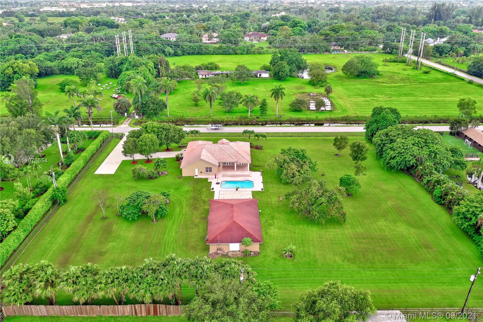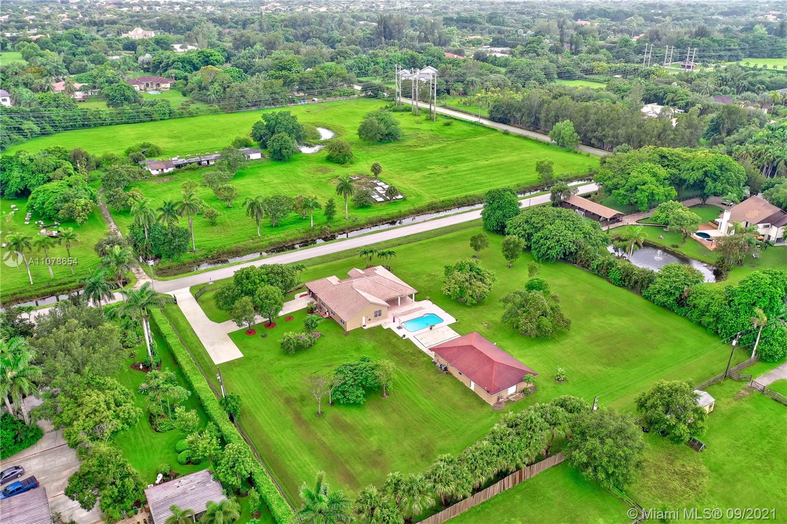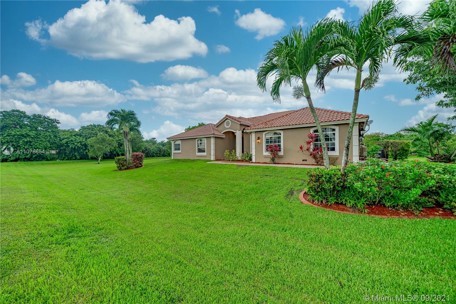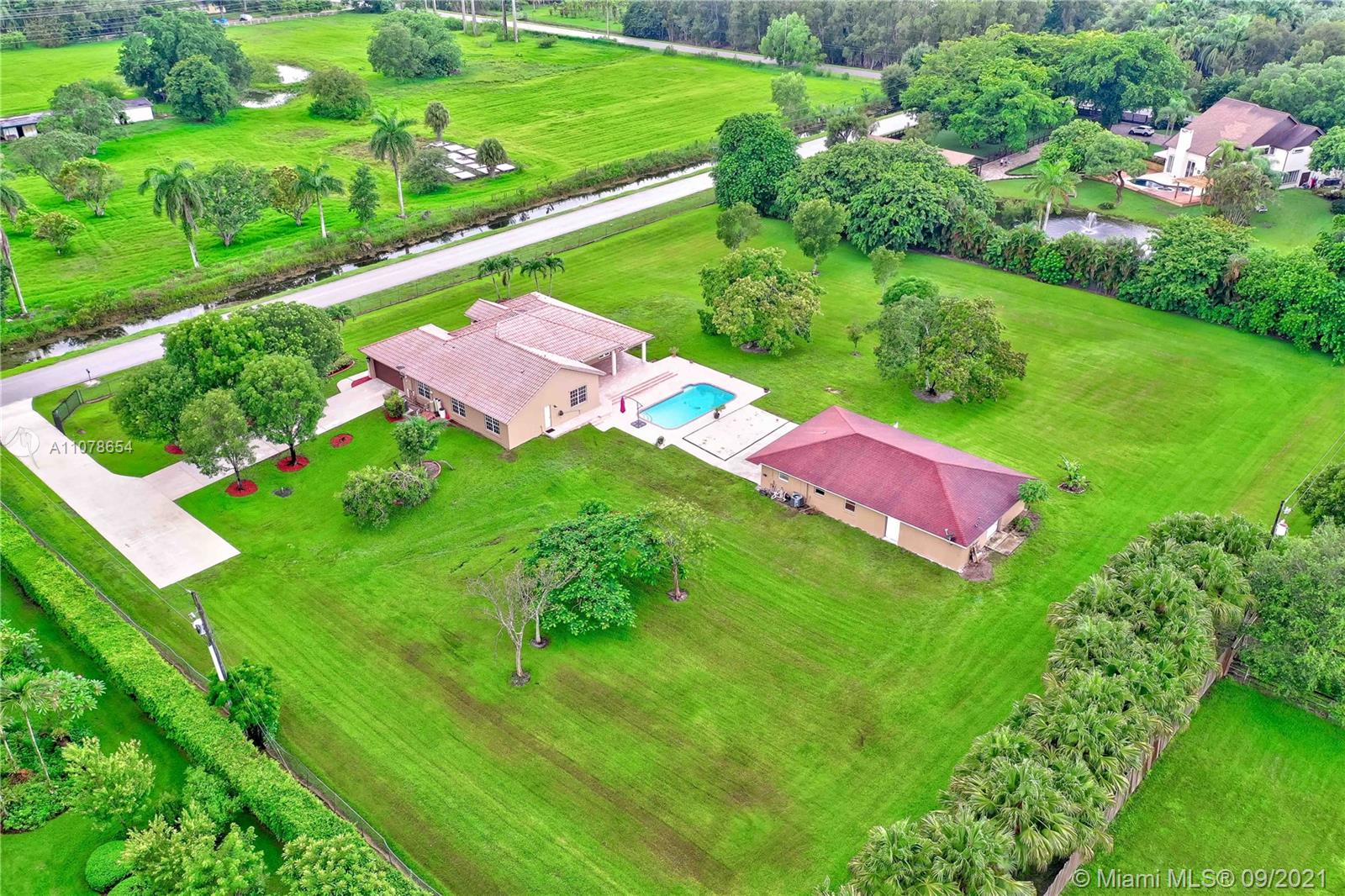 Amazing one-story pool home with a separate guest house! Rare find in sought-after Southwest Ranches, close to Miami/Ft Lauderdale. It offers 5 bedrooms, 3.5 baths, 3063 sf. A separate Guest House with 1155 sf features 2 bedrooms, 1 bath, eat-in kitchen, living room. All this nestled in the equestrian neighborhood of Sunshine Ranches. Custom-built in 2006 on 2.2 acres. This elegant estate includes an expansive floor plan, wonderful natural light, granite countertops, wood cabinets, stainless steel appliances. Primary bedroom suite with walk-in closet, dual vanities, jetted bathtub & separate shower. Fully fenced, tropical fruit trees, 2-car garage and plenty of parking space. Excellent schools. Call in now while you can, don't miss out!