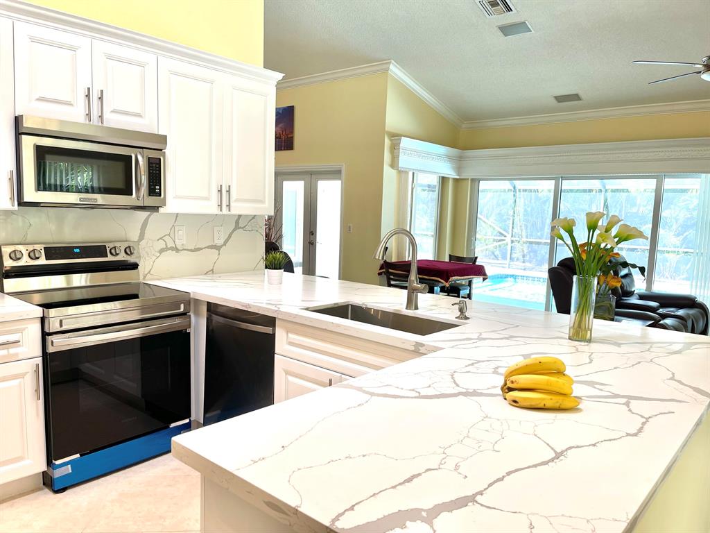 Bright, spacious and impeccably renovated 4 bedroom, 2.5 bath home in a highly desirable neighborhood. New roof with new skylights, New impact glass windows & doors throughout. New kitchen with quartz countertops, New stainless steel appliances, New painting interior & exterior, New vinyl floor in bedrooms and hallways. A large and bright family room for you to entertain guests by the fireplace, formal dining room, and a double French doors that lead to the beautiful pool on a lushly landscaped backyard. Low HOA Fee with a city park within the community. Easy access to the Town Center mall, I95, turnpike, fabulous beaches, downtown areas and top rated schools.