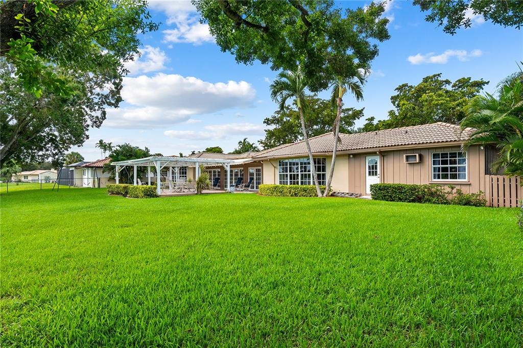 An entertainer’s dream home located in the Plantation Golf Estates community offering five-bedrooms, 3.5 bathrooms overlooking the Plantation Preserve golf course. This open floor plan provides living spaces filled with natural light from the bay window in the family room, kitchen with multiple eat in dining areas, and living room which all lead to the outdoor space through impact-French doors. You will find covered sitting areas and a Pergola with additional seating for dining facing the #8 hole on the golf course. Additional features include the Owner's suite with a bathroom, custom built closet and sitting area, formal living and dining rooms, guest bedroom with a cabana bathroom, two car garage with cabinet storage and wall shelving, laundry room and lush landscaping.