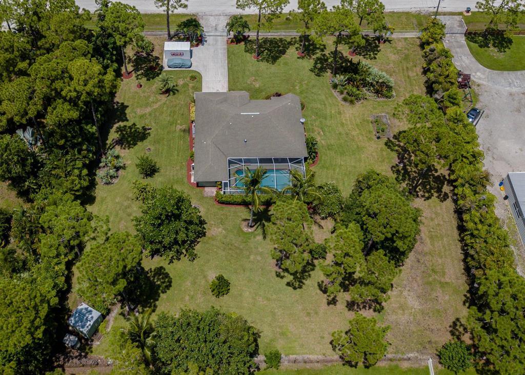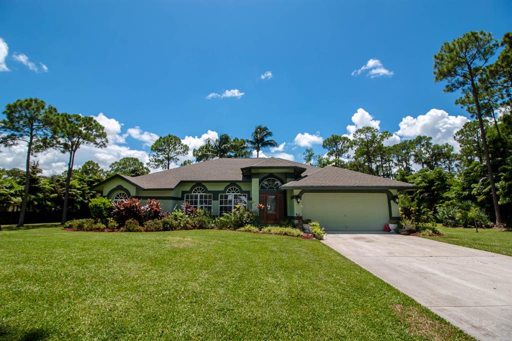 Imagine coming home to the beauty and serenity of the Acreage. Your private street front is lined by a steel fence with a man and powered vehicle gate that sets off the lush vegetation of your 1 acre of paradise. As you walk up to the covered front entrance with its beautiful wood and stained-glass door, you appreciate the architectural features of this block and stucco home. The spacious living room welcomes you inside this well-maintained property. The kitchen has stainless steel appliances and granite counters. The master bedroom has 2 sinks, a large soaker tub and separate shower. The walk-in closet has two entrances. There is even a sliding glass door leading out to the partially covered and fully screened lanai and 15x30 pool.