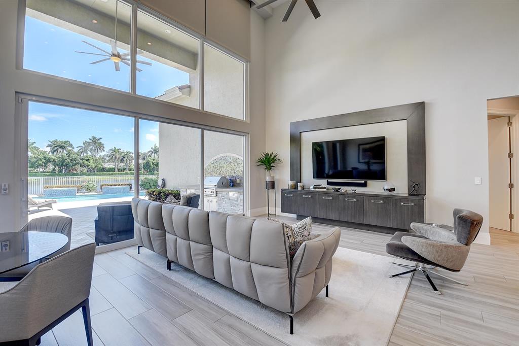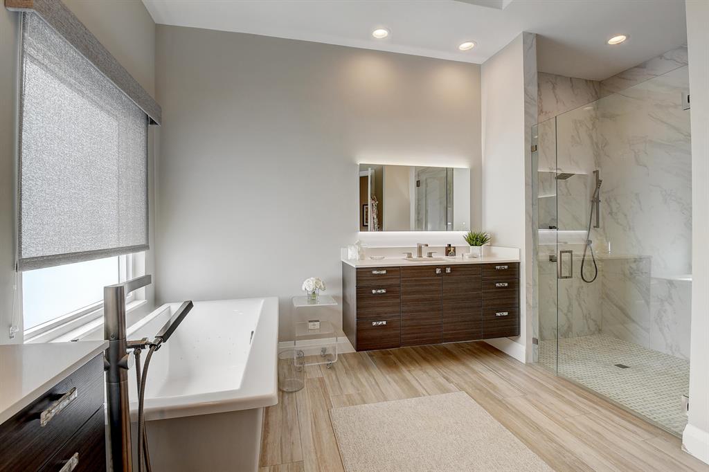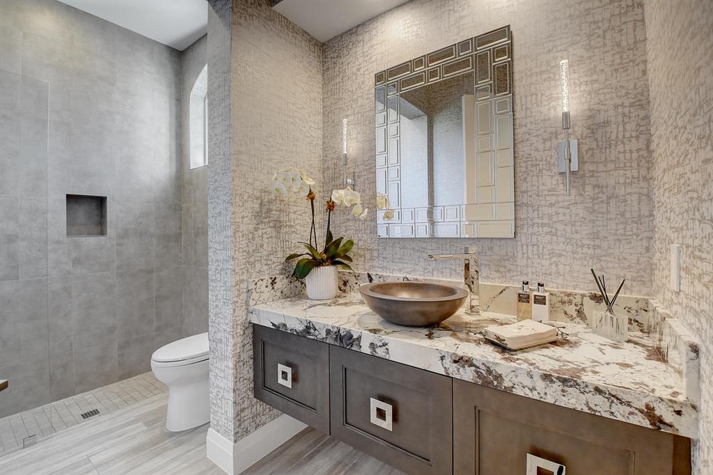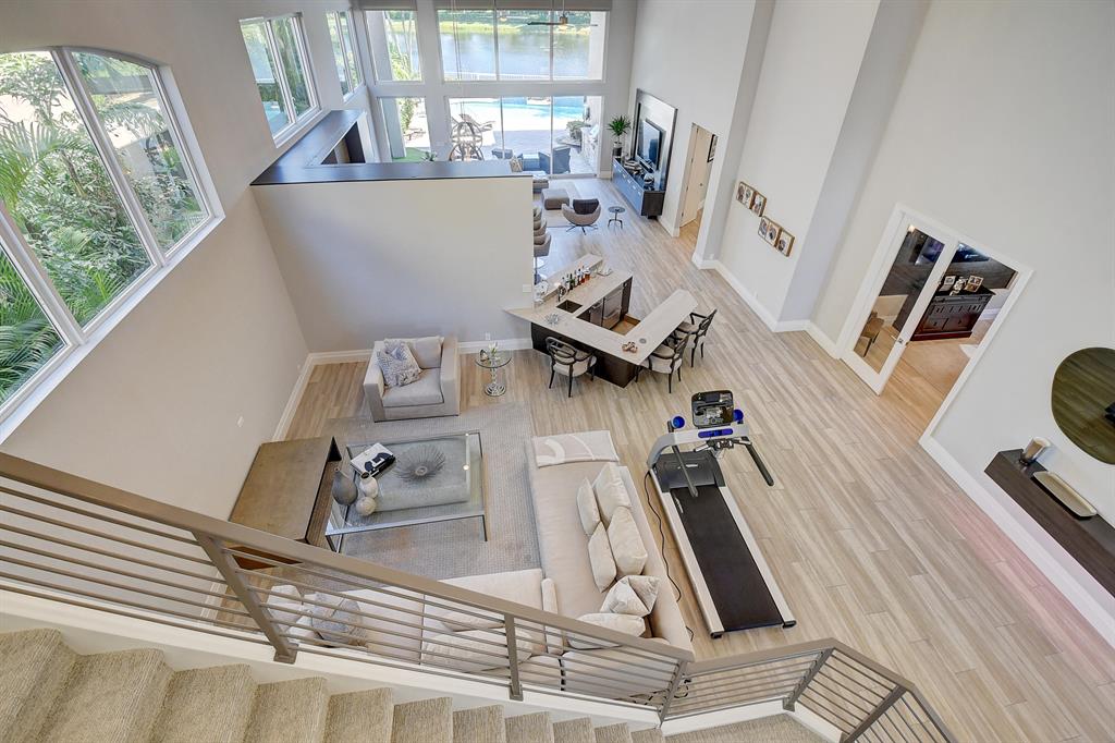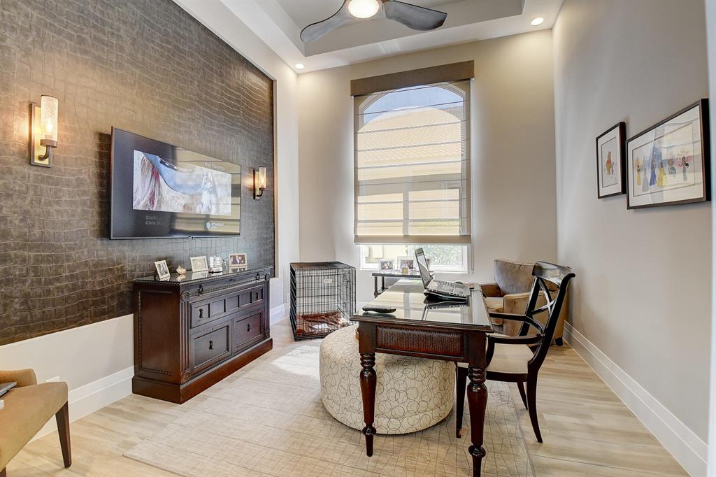 Tranquil lake vistas & upgraded to the nines, this 2-story home of 4 bedrooms plus an office & 4 baths is filled with sunlight. Features include contemporary front doors; volume ceilings with LED lighting; 9'' X 48''wood grain porcelain tile & neutral carpeting; flat wall & ceiling finish; a tastefully designed gourmet kitchen with taupe high-gloss & tigerwood cabinetry, stainless steel appliances, quartzite counters, glass tile backsplash & elegant pendants; & a practically designed built-in office. The Living Room offers an inviting wet bar with ice maker & freezer drawers. The Master Suite offers beautiful lake views, custom closets, ceiling fan & shades & a spacious Master Bath with 3 vanities, free-standing aromatherapy tub, large shower with a bench & multiple heads.