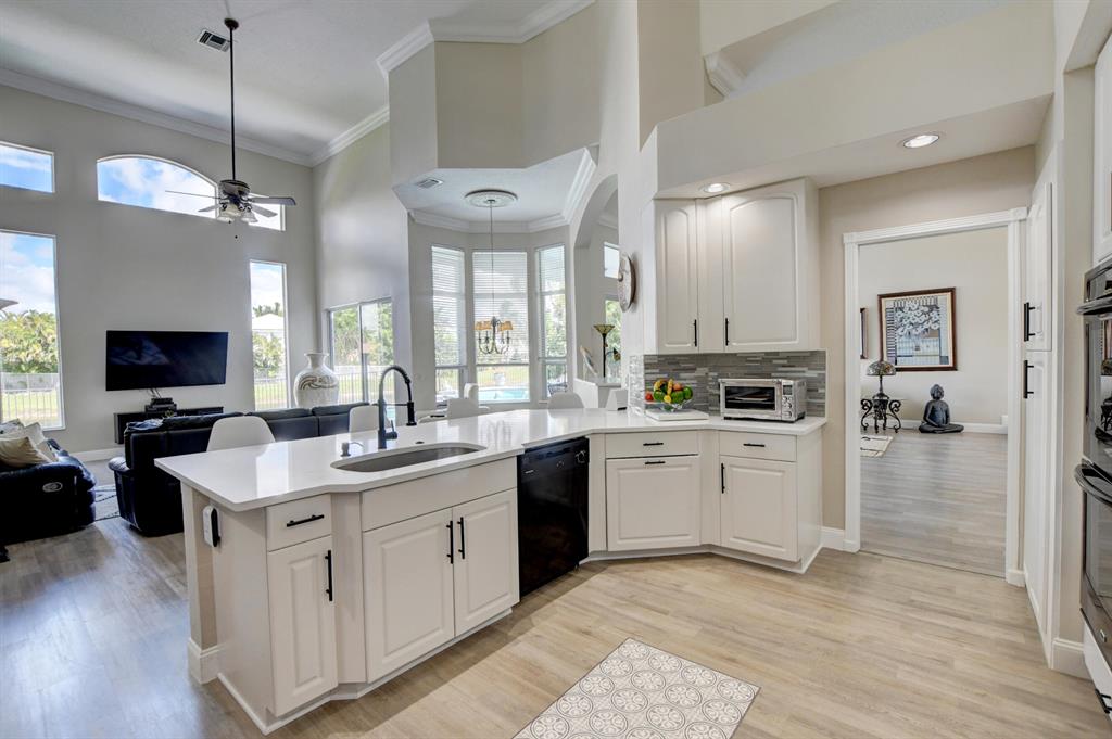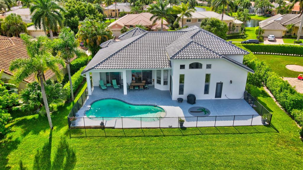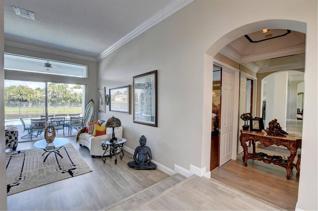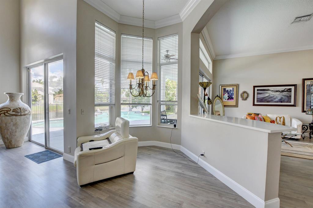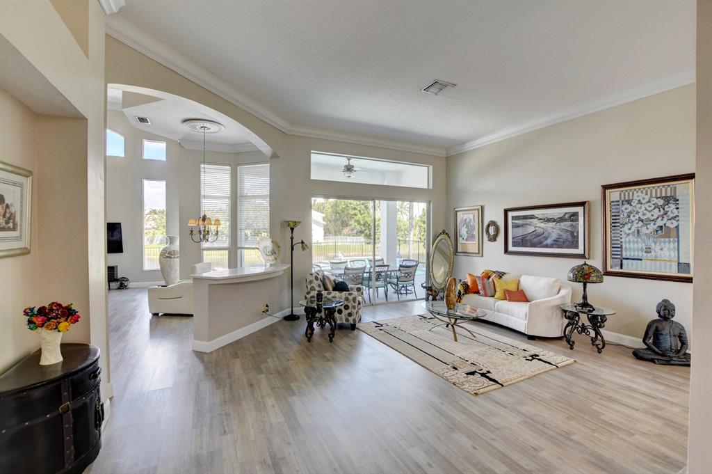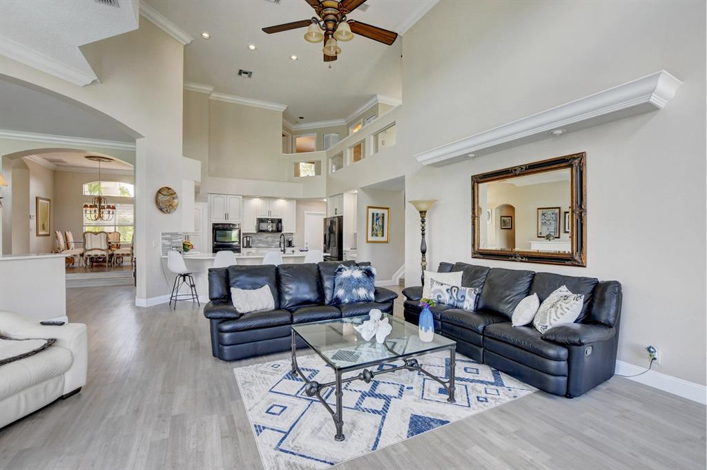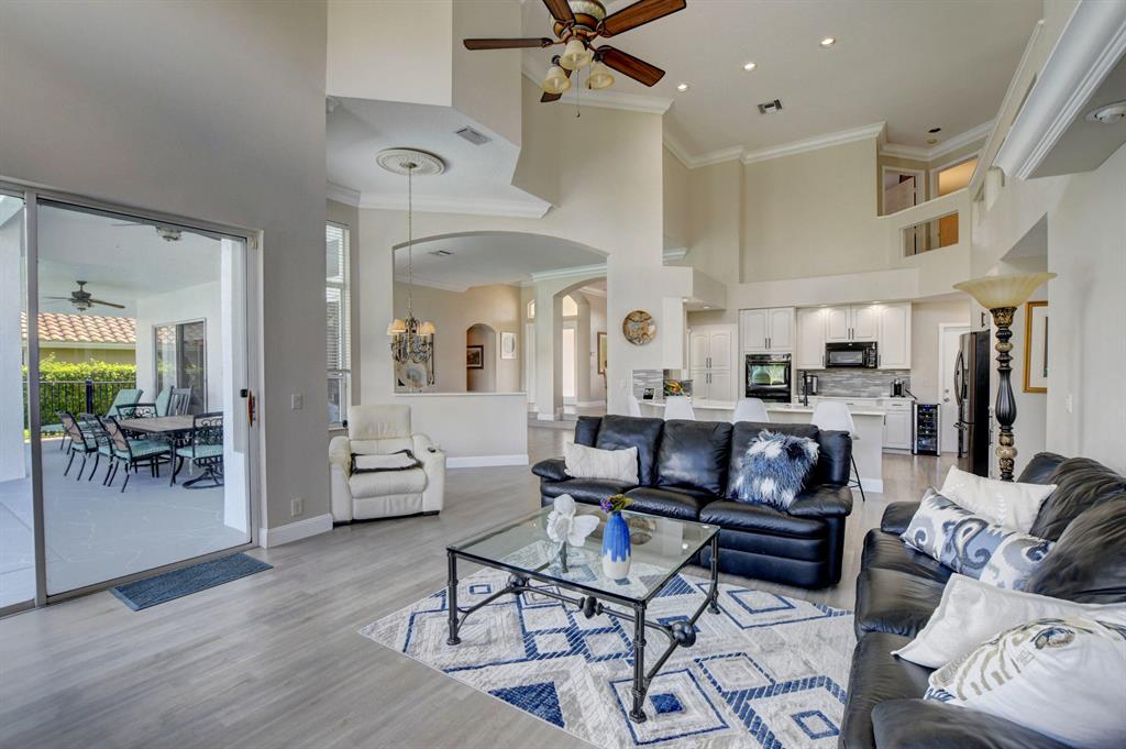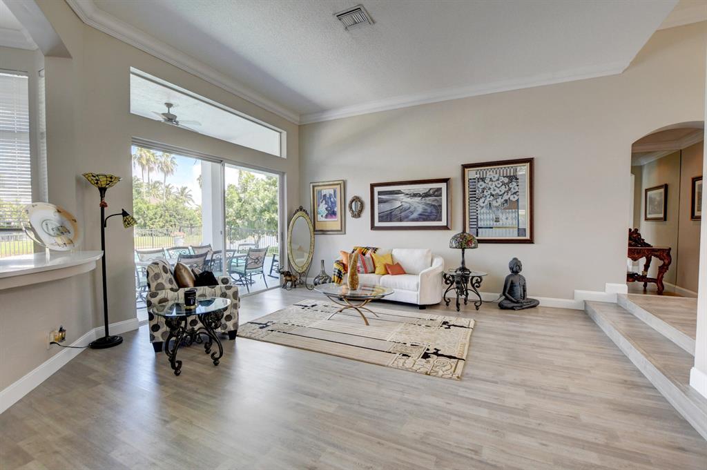 Updated Palm Beacher model located on a premier lot within walking distance to the club house. Come enjoy this lake front property with eastern exposure allowing for beautiful sunrise views. New roof with a 12 year transferable warranty completed in June 2021. Exterior of the house painted in June 2021 with a 7 year transferable warranty. First floor master bedroom with spa like bathroom featuring a jacuzzi tub and separate walk-in shower. One additional bedroom on main floor, with 3 more bedrooms upstairs. All bathrooms renovated. Home features a whole house water purification / filtration system. 20 foot ceilings in main living area of the home, tray ceilings in master bedroom, kitchen filled with custom pull-out drawers.