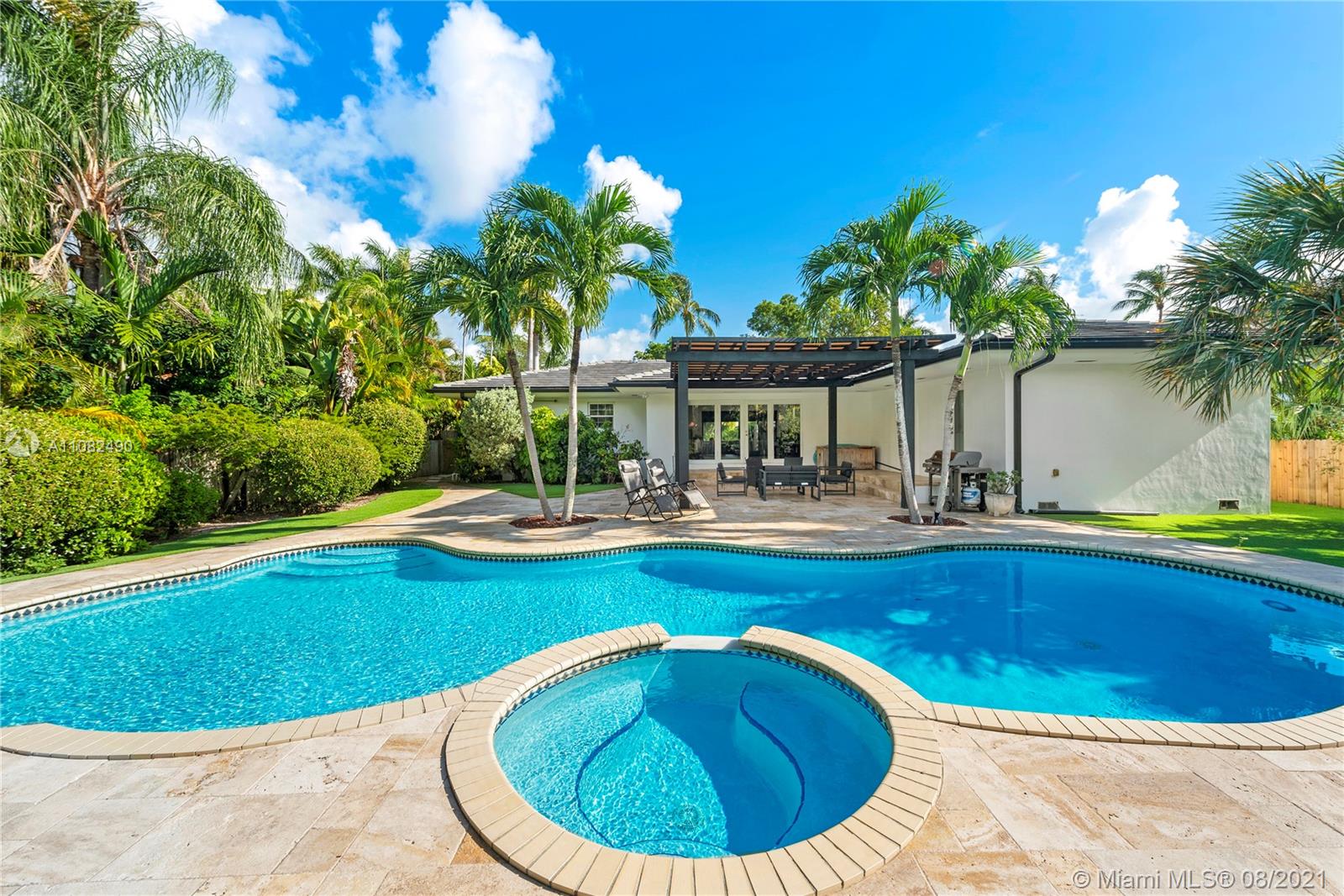 Newly renovated and redesigned 3 bedroom, 3.5 bath home on tree-lined 96th Street in Miami Shores. Located just the six homes away from glistening Biscayne Bay, this home sits on an oversized lot with a magnificent backyard with heated swimming pool, hot tub, brand new pergola and freshly installed Astro Turf throughout the generous sized backyard. Some of the many countless home upgrades include: new roof, two new AC units, brand new Italian porcelain floors throughout, new open kitchen with bar top island, custom countertops, farmers sink, and new smart appliances including wine cooler. The main living area showcase a new custom media wall with surround sound, fireplace and electric shades. Miami Shores is a wonderful community, centrally located, close to everything Miami has to offer!